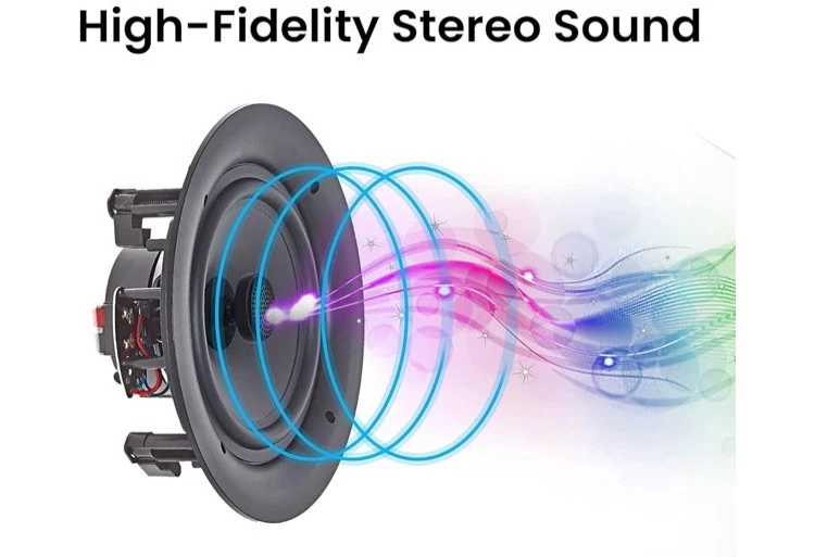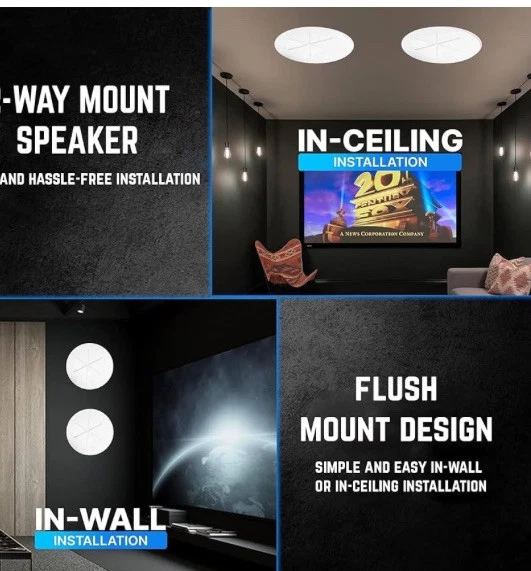 The Vaiyer Set of Two Framed Wall Speakers is a high-end 2.0 channel home theater entertainment system with Dolby Digital surround sound. These 2 compact round speakers have a sleek design, white color, and are made of metal. They have a driver size of 5.25 inches and a total RMS power of 200W. The unit includes audio inputs for Digital Coaxial RCA and Digital Optical TOSLINK, and is compatible with universal brands and models. White Framed Wall Speakers Home Enhance Your Sound Experience: Elevate your audio with our Vaiyer 5.25 Inch Ceiling Speakers, offering versatile installation options for in-wall or in-ceiling use. These 2-way mid bass woofer speakers provide exceptional sound quality. Powerful 175 Watts: Our in-wall speaker system is engineered for peak performance, delivering a robust 175 watts of power. The heavy-duty voice coil ensures impressive sound clarity and extended product lifespan. Sleek Flush Mount Design: With convenient push-type speaker terminals, our speakers are a breeze to install. The seamless flush mount design seamlessly integrates into your space, providing a clean and modern aesthetic. Seamless Integration: Whether you're upgrading your home theater system or customizing your sound experience, our 2-way in-ceiling or in-wall speaker system delivers crisp audio clarity whenever you desire. Easy Installation: We've made installation a cinch with the included 6.9" diameter cut-out template and 3" mounting depth. The product also includes all necessary mounting hardware for precise application.