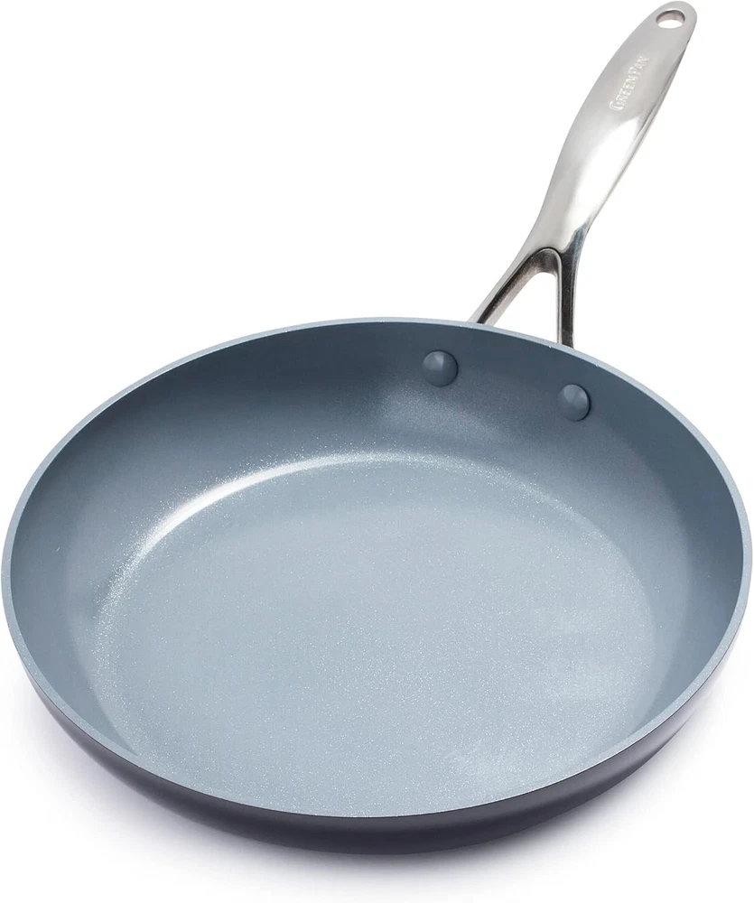 CUTTING-EDGE CERAMIC NONSTICK: Infused with diamonds, GreenPan's metal utensil safe ceramic nonstick offers remarkable durability, balanced heating, and effortless cleanup. TOXIN-FREE: Our signature ceramic nonstick coating is free of PFAS, PFOA, lead or cadmium. AWARD-WINNING PERFORMANCE: Our Valencia Pro has set the standard for ceramic nonstick winner of the best ceramic nonstick 8” and 11” frypans from America’s Test Kitchen and 2023 Good Housekeeping Sustainable Innovation Award. DUOFORGED HARD ANODIZED BODIES: Unbelievably tough and scratch-resistant, these pans are pre-treated before they’re hard anodized for extraordinary durability. MAGNETO INDUCTION BASES: Optimized for performance on all stovetops, including induction. EASY TO CLEAN: Most messes wipe clean, plus these pans are dishwasher safe for effortless cleanup. COMFORTABLE STAINLESS STEEL HANDLES: Mirror-polished stainless steel handle stays cool thanks to a V-shaped cutout. PERFORMS WHERE YOU NEED IT: Oven and broiler safe up to 600°F (lids up to 425°F) and suitable for all stovetops, including induction. Valencia Pro brings together over a decade of innovations in one incredible collection. Designed to last, this frypan is crafted with strengthened hard anodized aluminum for extra durability and scratch resistance. This versatile 11” pan features a sturdy Magneto base for superior induction efficiency so you can brown, sauté, and sear without heat loss on any stovetop, including induction. The pan features our Thermolon Minerals Pro ceramic nonstick, a diamond-infused coating that’s metal utensil safe and designed to stand up to intense use while continuing to give you even heating, effortless release, and easy cleanup. The frypan’s stainless steel handle lets you go from stovetop to oven with ease and the dishwasher safe design makes cleaning up big messes stress-free. Limited lifetime .
