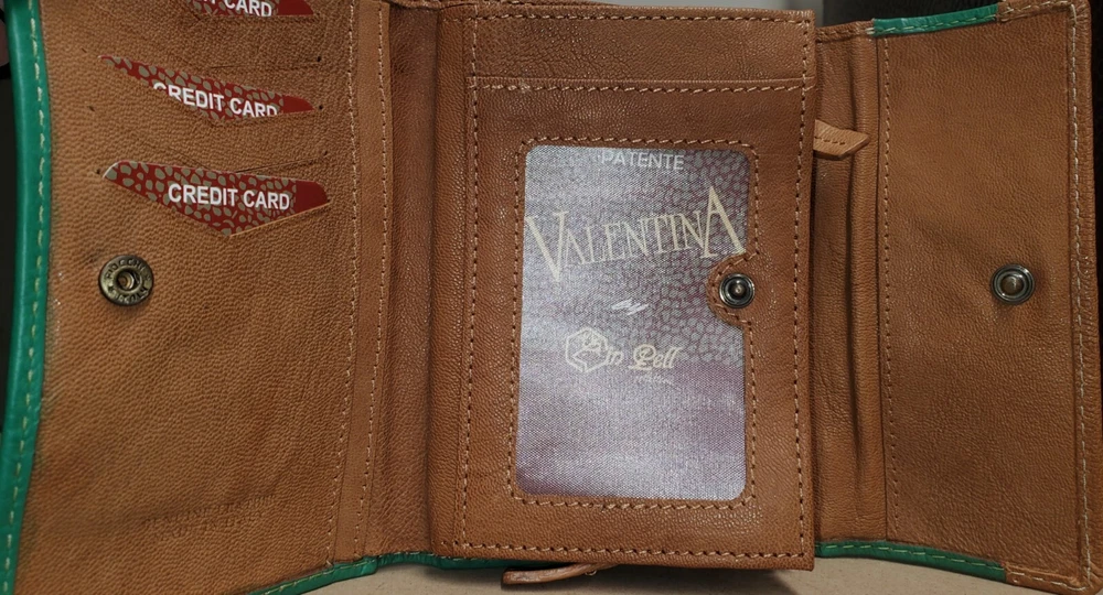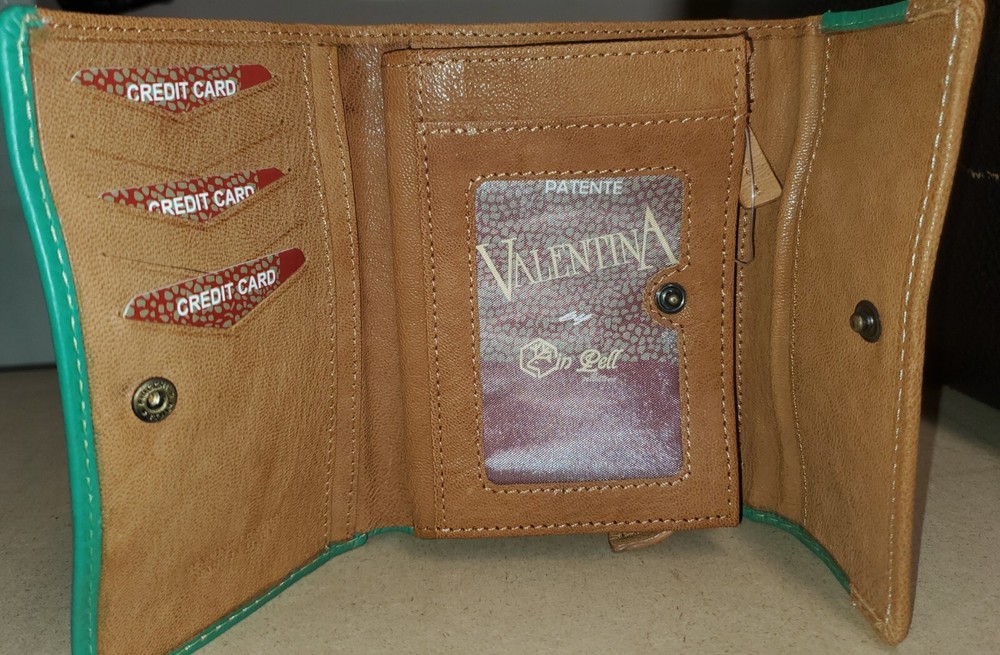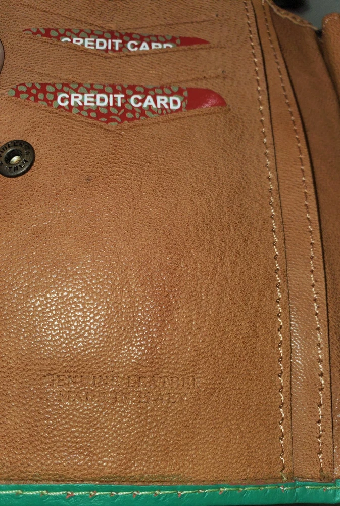 Brand:ValentinaAccents:LogoPersonalize:NoCountry/Region of Manufacture:ItalyUPC:Does not applygtin13:Does not applyDepartment:WomenType:WalletMaterial:LeatherTheme:ItalianPattern:Multi colorHandmade:NoSize:LVintage:NoStyle:ClutchColor:Green multiFeatures:ID Slot, 10 card slots, Two separate sections, Zippered section with zippered pocket, Bifold section with cc slots & ID window, Tab & snap closure, 4 interior slip pockets, currency pocket, Organizer