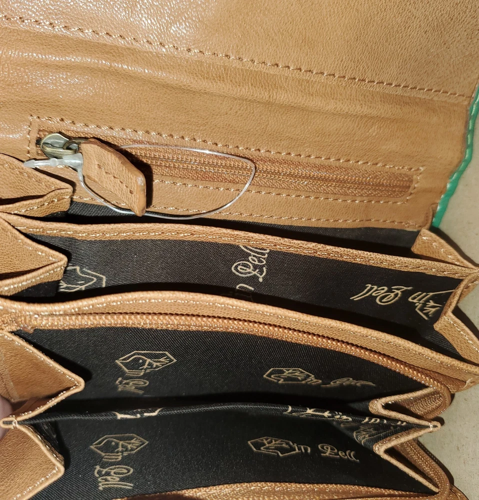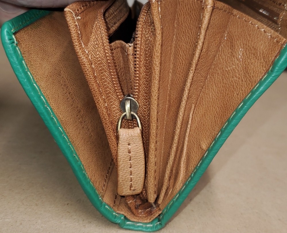 Valentina Italian Leather Tab Close Clutch Wallet in Dark Green and Cognac