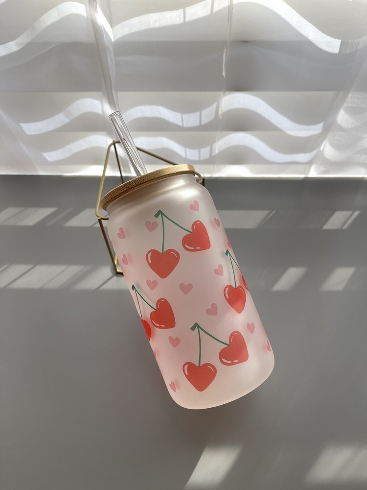 Valentine Cute Cherry Hearts Glass Cup 16 Oz With Bamboo Lid And Straw. Condition is New. Shipped with USPS Ground Advantage.