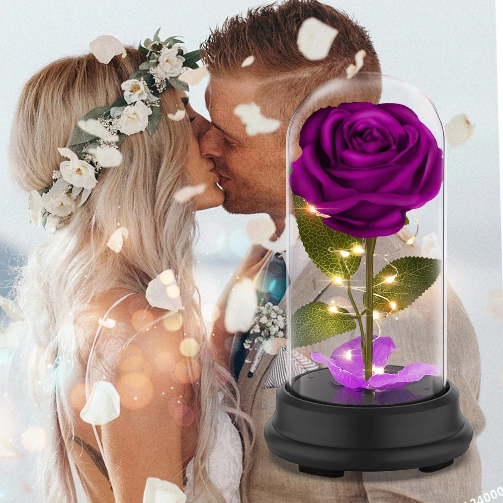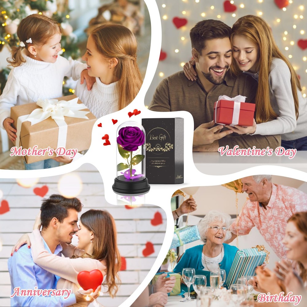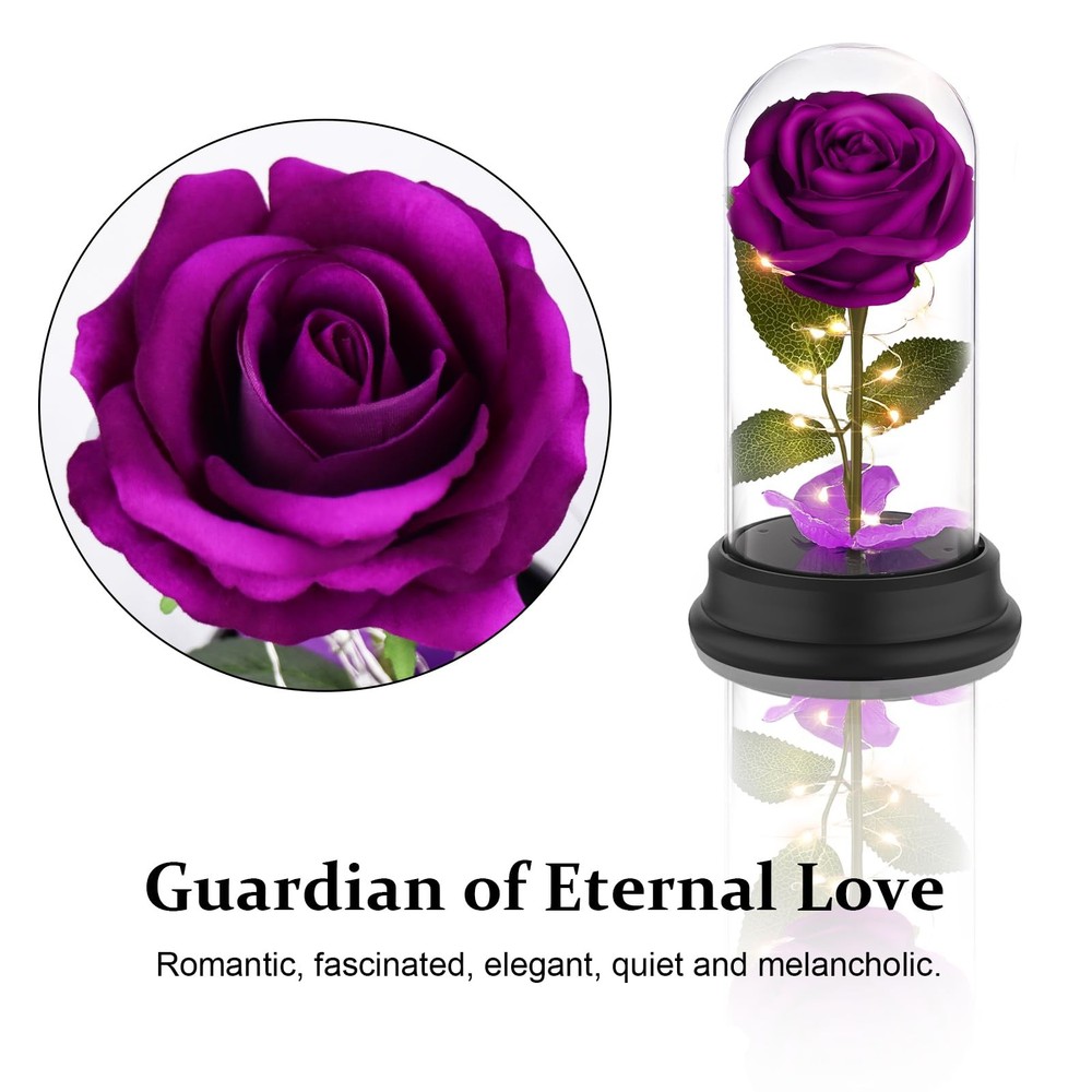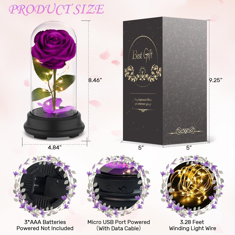 Birthday Gifts For Women:Elegant and charming silk rose with led light strips coiled around it, paired with romantic light and falling red rose petals, blooming vividly under the crystal dome.Preserved rose is a symbol of long-lasting love, friendship and beauty. Nothing is sweeter than infinity rose. Give her a surprise that represents your endless love and blessings to her. 【Birthday Gifts For Women】Elegant and charming silk rose with led light strips coiled around it, paired with romantic light and falling red rose petals, blooming vividly under the crystal dome.Preserved rose is a symbol of long-lasting love, friendship and beauty. Nothing is sweeter than infinity rose. Give her a surprise that represents your endless love and blessings to her. 【Rose Flower Gifts for Women】Size: 9''*4.9''. The rose made of soft silk is vivid and realistic. Premium copper wire LED string lights are waterproof and flexible to create different shapes. Highly transparent plastic dome shows a better visual effect while not worrying about breaking. The lamp shade fixed on the base can be removed for cleaning and DIY. switch on the side to adjust the warm white and color two light modes. Flower lamp is powered by 3 * AAA batteries or Micro US two ways to power, more convenient. 【Eternal Mom Gifts】The rose tree lamp is packaged exquisitely in a luxury portable gift box, which is a stunning gift. The never fading rose not only symbolizes eternal love, but also a wonderful blessing. As a mother's day gifts, valentine's day gifts, anniversary gifts, graduation gifts, housewarming gifts and Christmas gifts for mother, grandmother, girlfriend, wife, daughter, friend, etc. Give this gorgeous gift now! 【Rose Flower Gifts for Women】The roses are pretty and cozy under the light, as home decoration or ambient light in the day and night, beautiful and practical. Bring romantic mood to your party, mother's day, anniversary, birthday party, proposal, engagement ceremony, wedding, candlelight dinner. Also as a lovely night light to dress up your bedroom and accompany you to sleep. Place in your living room, office, desk, cabinet, etc. adding glory to your life. 【Womens Gifts Idea for Her Day Holiday】You will get a unique Beauty and the Beast rose lamp with a gift box, data cable, and instructions. All assembled, no assembly required. Every product has been quality tested to ensure its high quality.