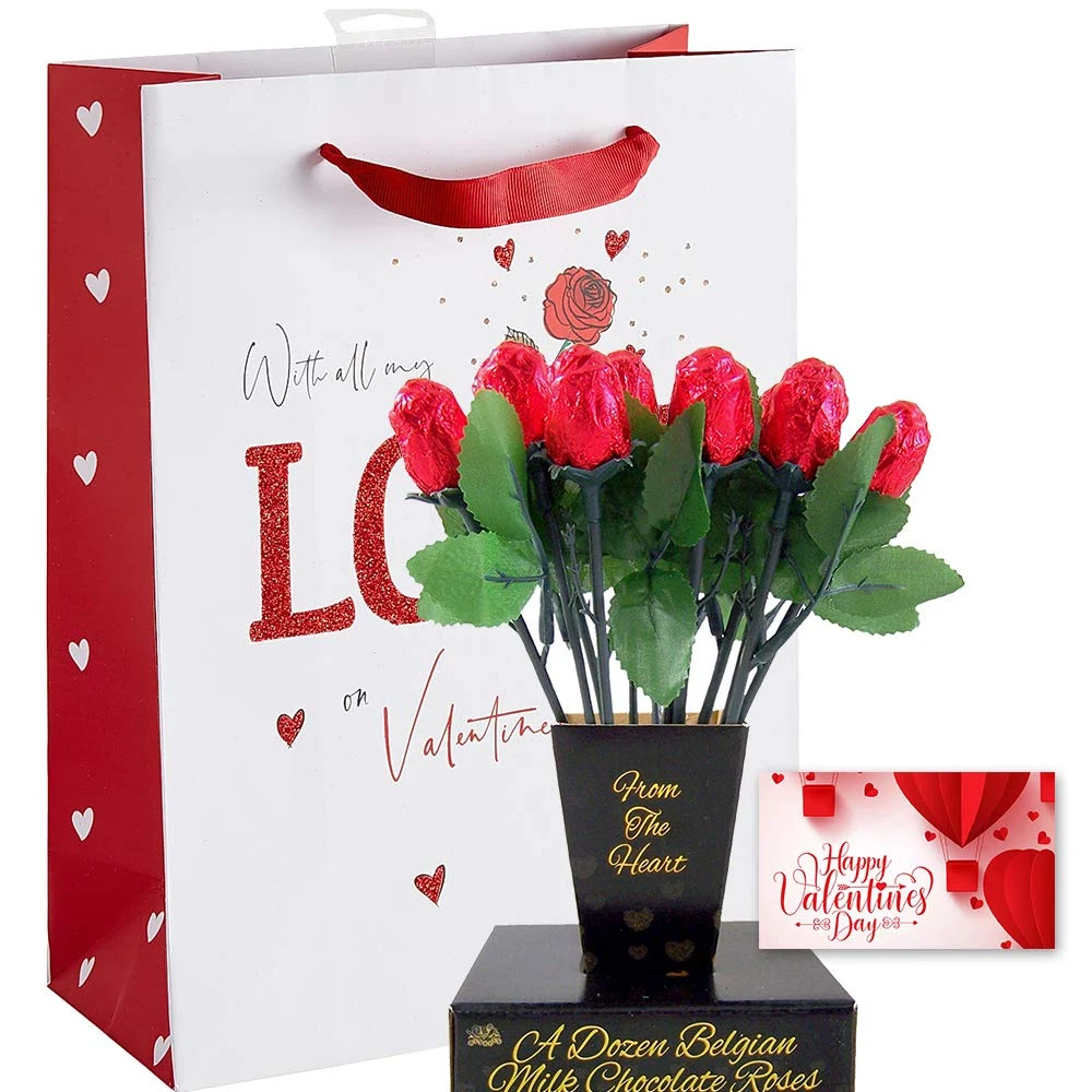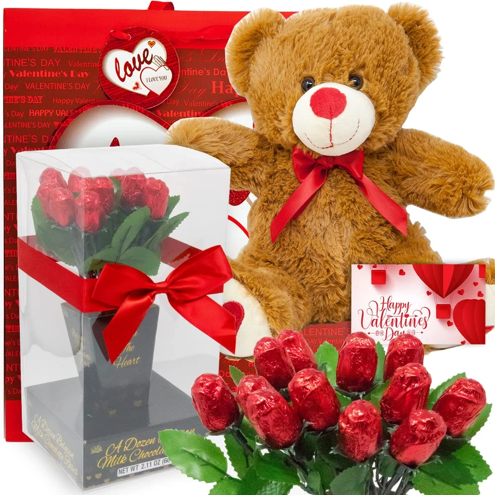 You will receive 4 items total; 1 Teddy bear 11 inches tall, 1 DOZEN Milk Chocolate Flower Bouquet Roses, 1 Valentine-themed GIFT BAG, and 1 Valentine's day Tag, small size CARD. The dozen flower roses are made from the finest BELGIAN Chocolate, they are shaped into flowers and then individually wrapped to preserve the best flavor. Flowers come in an elegant crystal clear window box that has both a romantic & lovely presentation. A valentine themed GIFT BAG is included just in case you want to put the roses in the bag, Plus a "HAPPY VALENTINE DAY", card is also included where you can add a message on the back of the card. This adorable TEDDY BEAR is about 11" inches of huggable, loveable stuffed animal. Complete with a ribbon on his neck, the best way to say I LOVE YOU to the ones you love, during VALENTINE’s Day. Great gift for a lover, gift for her, a wife, daughter, mother or anyone else, BEST VALENTINE GIFT, Buy now while supplies last... Product Description Valentine's Day Gift Basket | Teddy Bear Plush 11 Inches, Dozen Belgian Milk Chocolate Flower Roses Bouquet, Gift Bag & Card | For Her Wife Girlfriend Mother Daughter (Love) 1 DOZEN Milk Chocolate Flower Bouquet Roses The dozen flower roses are made from the finest BELGIAN Chocolate, they are shaped into flowers and then individually wrapped to preserve the best flavor. 11 inch Teddy Bear This adorable TEDDY BEAR is about 11" inches of huggable, loveable stuffed animal. Complete with a ribbon on his neck, the best way to say I LOVE YOU to the ones you love, during VALENTINE’s Day. A valentine themed GIFT BAG is included just in case you want to put the roses in the bag, Plus a "HAPPY VALENTINE DAY", card is also included where you can add a message on the back of the card.