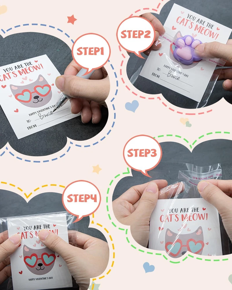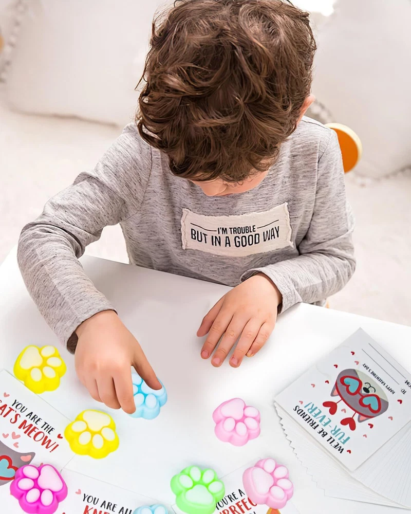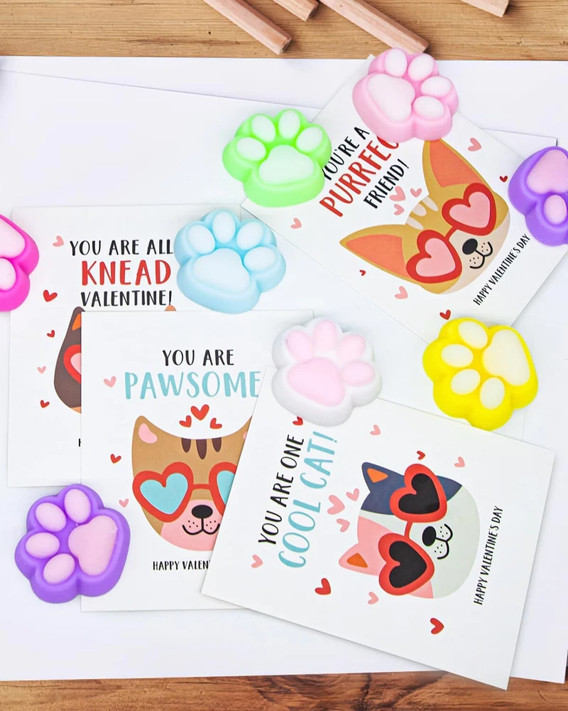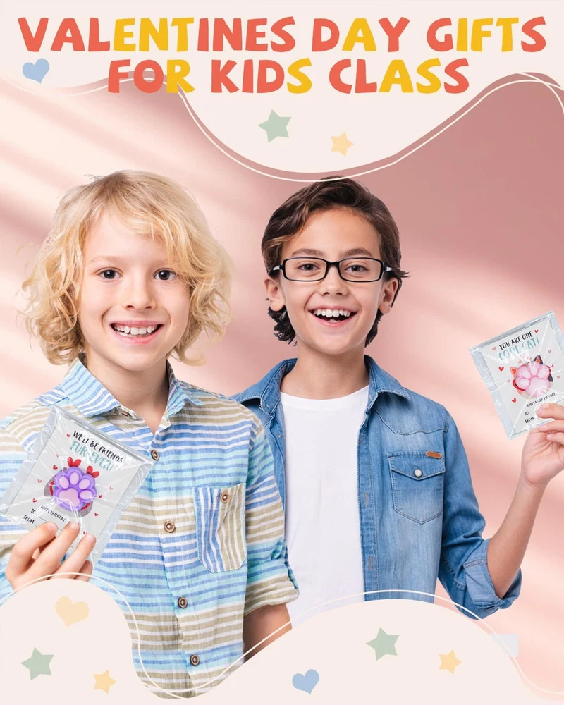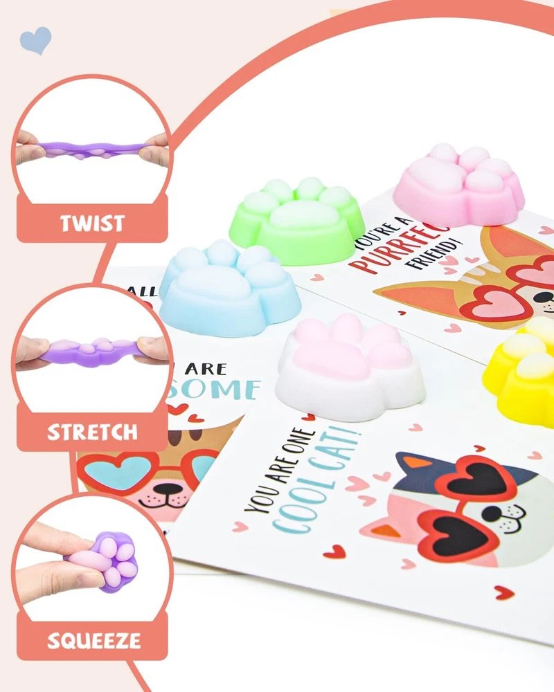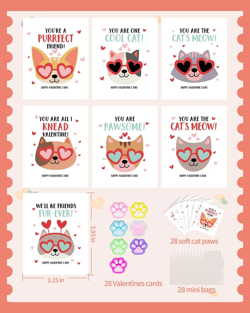 Unique Valentines Cards for Classroom - 28pcs valentines cards for kids classroom with 28 cute cat paw squishy and 28 mini bags. It will help your child become the center of attention at the Valentine's Day party Love Filled Cards - 7 interesting cat wearing sunglasses exchange cards with heartfelt messages printed on both sides. So that the recipient can deeply feel your affection. Cats are good companions for children Cute Cat Paw Squishy- Including 7 diverse and colorful squishy cat paw, and each one is a beloved character among children. Their soft bodies can be squeezed and played with, both fun and adorable. A Fun and Loving Valentines Day Gift - Helping children learn to express their affection, Children growing up in a loving atmosphere tend to be happier. What Will You Get - 28 packs valentines cards for kids school with cat paw squishys, exquisite gift box and best after sales service.
