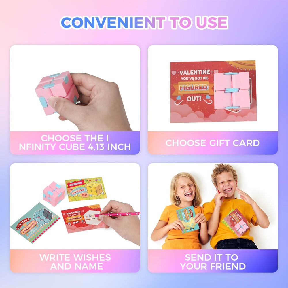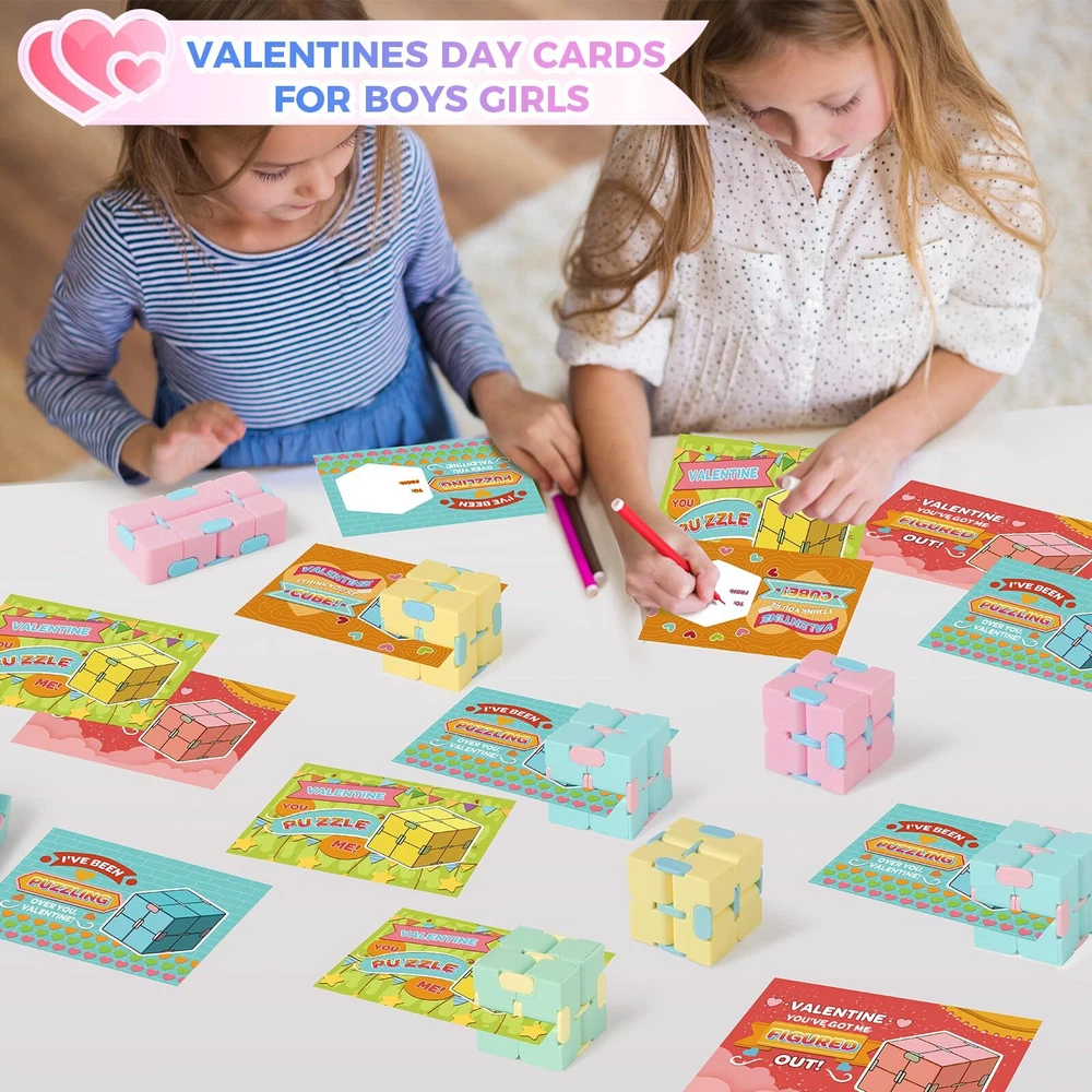 This Valentine's Day gift pack is a total hit! Kids will love the colorful infinity cubes—perfect for keeping little hands busy. The set comes with 24 cubes and matching cards, making it ideal for classroom exchanges or party favors. Bright, fun, and great for sensory play, these fidget toys are a fantastic way to celebrate. Teachers and parents will appreciate the value, and the kids will be thrilled! A must-have for Valentine’s Day fun.