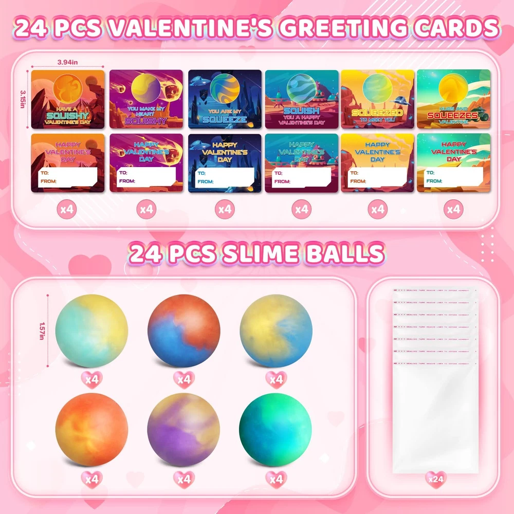 What's Valentines Set include: Valentines day card set includes 24pcs slime ball with various colors and 24pcs space themed valentines day card in 6 different designs, enough for the whole class and perfectly match Valentine. The size of slime balls are suitable for kids to play, even little hands. This Valentines gifts set that kids can share and spread love through exchange in school, and they will surprise when they got it. Well-Designed Valentine's Cards: There are 6 unique designs of Valentines cards in space themed that will attract the kids. The cards have both sides. On the front, there are some interesting greetings and on the back, kids can write their names on it. It will improve children's social skills. It will be a wonderful Valentine's gifts exchange of kids in school. Ideal Valentine's Gifts For Kids: There are two colors inside the ball and like a planet, which will attract more attention for kids and they will enjoy the entertaining time. This slime ball has great elasticity and quickly recover. Kids can pull & stretch & twist & squeeze & press.It will enhance child’s imagination and creativity. It will perfect for kids classroom school exchange, Valentine's class events,Valentine's day gift exchange, Valentine's school classroom prize and so on. Super Quality: Our slime ball kits are made of high quality materials and non-toxic, perfect for 3 years old and up to play it. No matter how much you squeeze it, it will always keep your hands clean. It’s a great choice to release pressure. It can improve our relationships with family and friends. Ideal Valentine’s day gift for boys and girls. Enjoy a happy Valentine's Day! Enjoy A Happy Valentine's Day: Valentine's Day is an opportunity to show and share your love, if you want to improve your child's social and expressive skills, our Valentine's day card will suitable for your Valentine's party favors. It will be a Valentine's Day that full of meaning and romance. If you have any questions, please feel free to contact us. We will reply to you within 24 hours and help you to solve problem immediately.