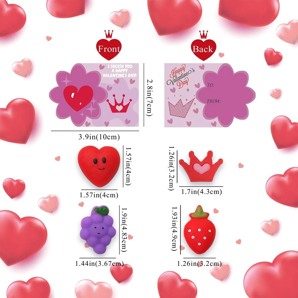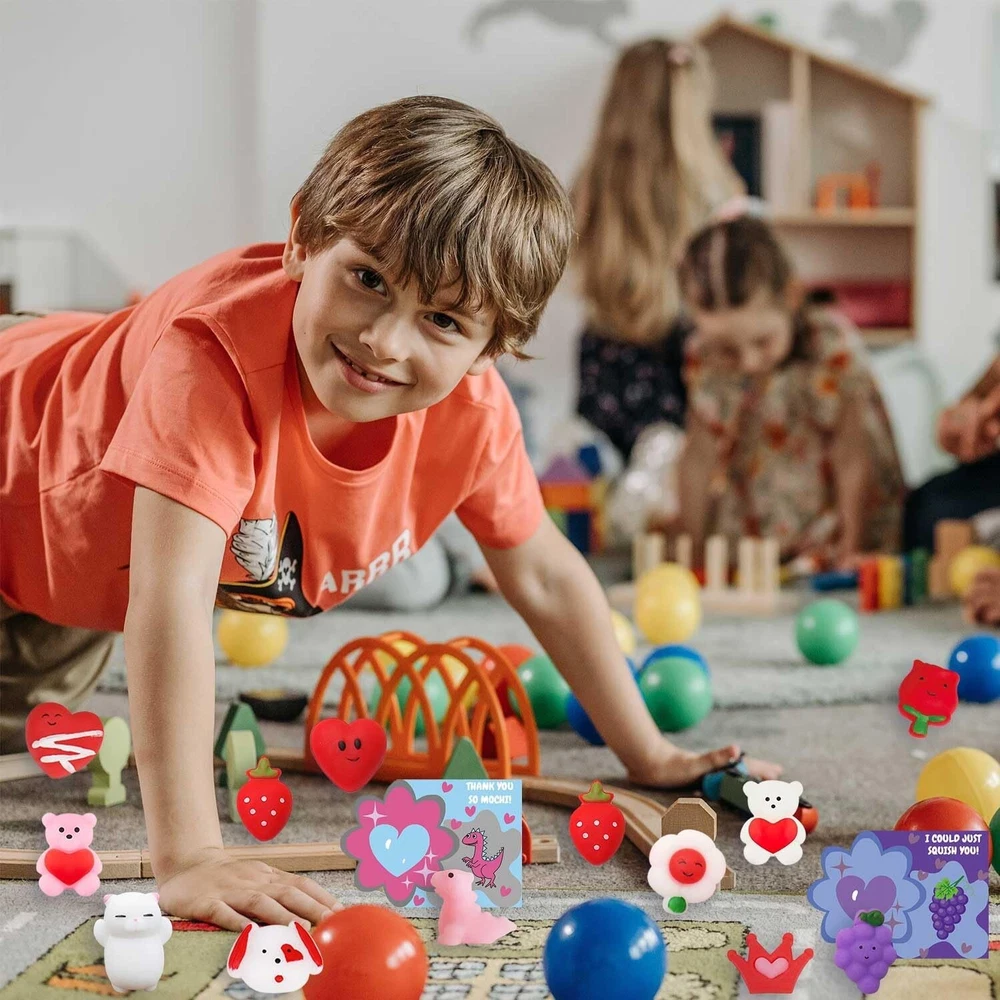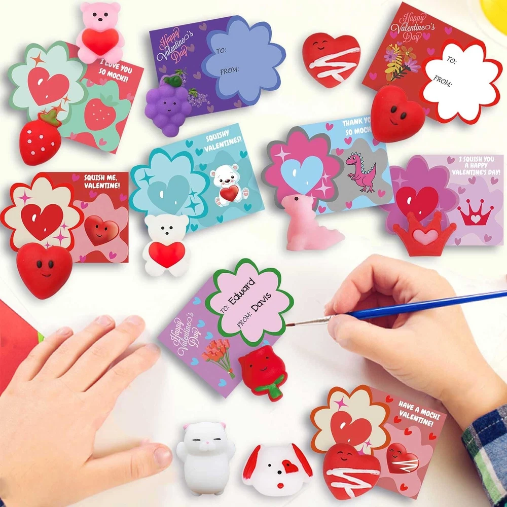 Valentines Day Cards Gifts for Kids, 24 PCS Mochi Squishy Party Favors Set with Valentine's Day Greeting Cards for Kids Valentine Classroom Prizes Party Favors, Valentine Exchange Gifts Set Product Details Style: Valentines Day Party Favors Brand: ricluck MPN: HEM1001 UPC: 744430177641 EAN: 0744430177641 Material: Rubber Brand: ricluck Unit Count: 1.0 Count Theme: Animal Item dimensions L x W x H: 6.5 x 5.2 x 0.8 inches Occasion: Valentine's Day Item Weight: 8.2 Ounces Manufacturer: ricluck UPC: 744430177641 Age Range (Description): Kid Product Dimensions: 6.5 x 5.2 x 0.8 inches Item Weight: 8.2 ounces Item model number: HEM1001 Manufacturer recommended age: 36 months - 12 years Super Value Valentine Day Gift for Kids: The 24pcs valentines squishy toys with greeting cards are perfect for kids, boys, girls, toddlers, valentines toys, valentines gifts, valentines party favors, school event prizes, class exchanging gifts. Easy to Use: Come with 24pcs transparent bag, put the mochi toy and the card in it then you can get a perfect valentines day gift, you can sign or write blessings on the greeting card, give a creative & super cute valentines gift for kids, classmates, friends or families. Endless Fun to Play: Our Valentine's Day Squishy Toys are great for kids girls boys. Squishies can be stretched, twisted or squeezed, which can bring more fun to people. Also can effective to release your stress, anxiety, increase blood circulation of hands. Reliable & Reusable Material: Valentine's Day cards for toddlers are made of quality card-stock, sturdy & hard; the mochi stress relief toys are made of safe and soft rubber with super good touching feeling, which is flexible & durable, suitable for kids to use. Wide Application: These exquisite valentines day cards gifts are suitable for boys and girls in classroom communication, preschool or elementary school parties, Valentine's Day activities, Valentines exchange gift, etc. Our Valentines Day Party Favors with 24 pieces of lovely squishy valentines toys with greeting cards. It can create a romantic Valentine's Day atmosphere to make your party full of surprises and laughs. Perfect Valentine gifts for your kids, friends,family. Specifications: Styles: Valentine's Day Color: As picture shows Materials: Premium washable silicone Package includes: 24 PCS Valentines Day mochi toys 24 PCS Valentines Day Greeting Cards 24 PCS Transparent Bag