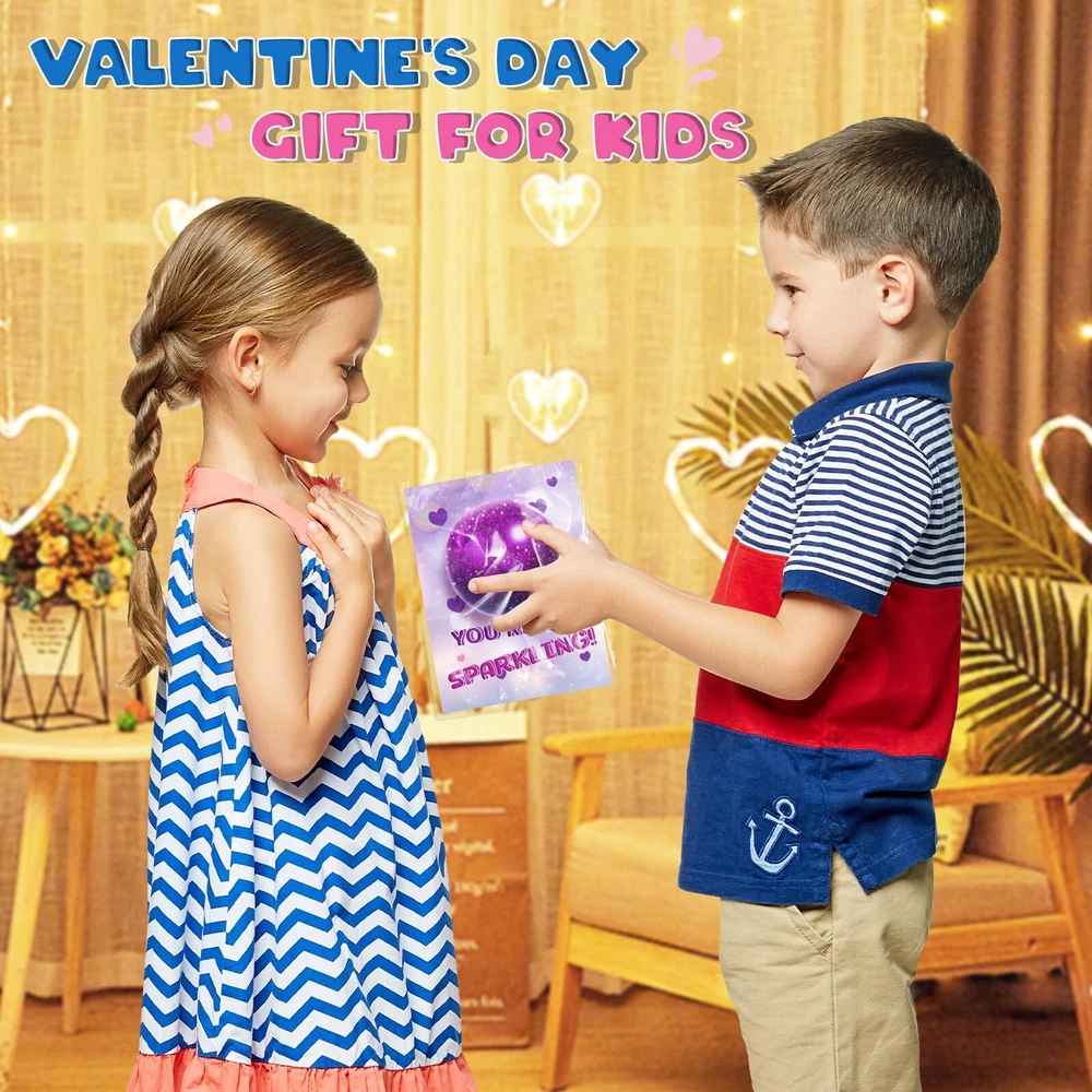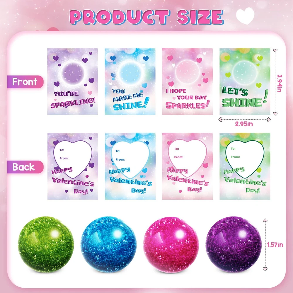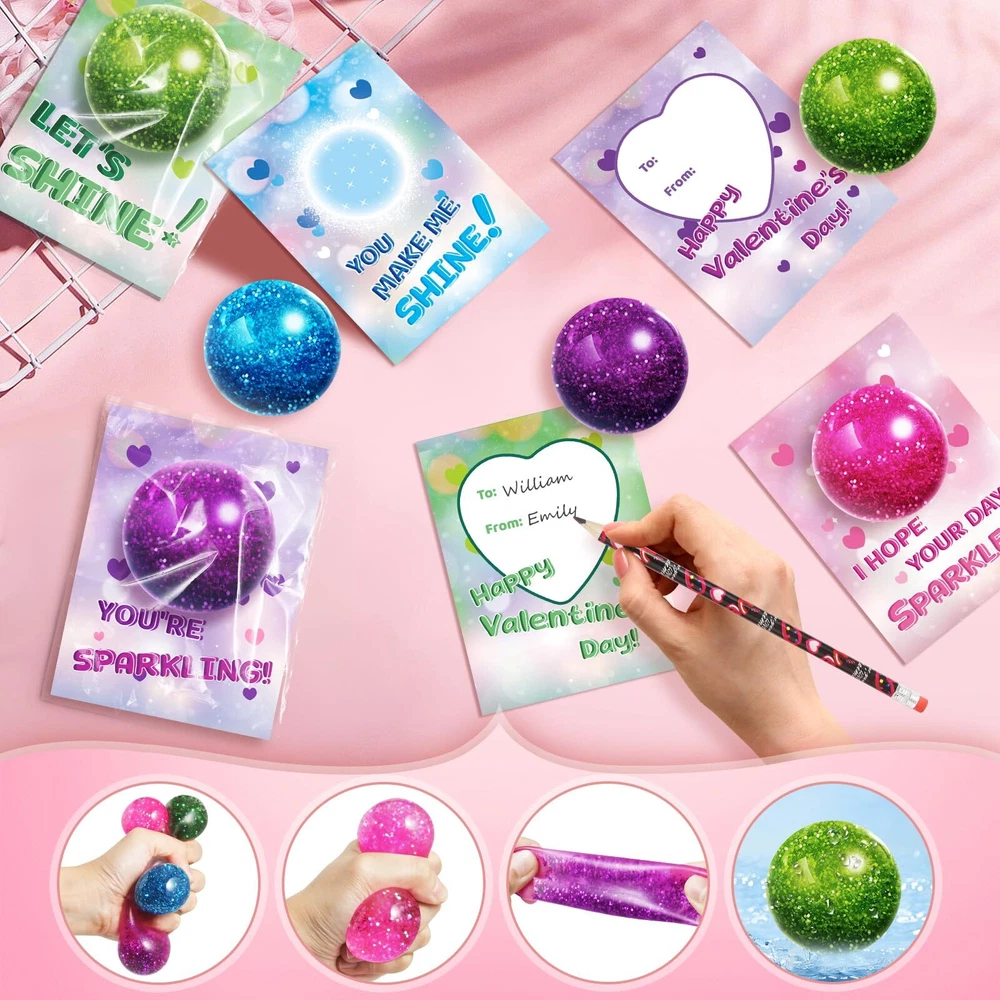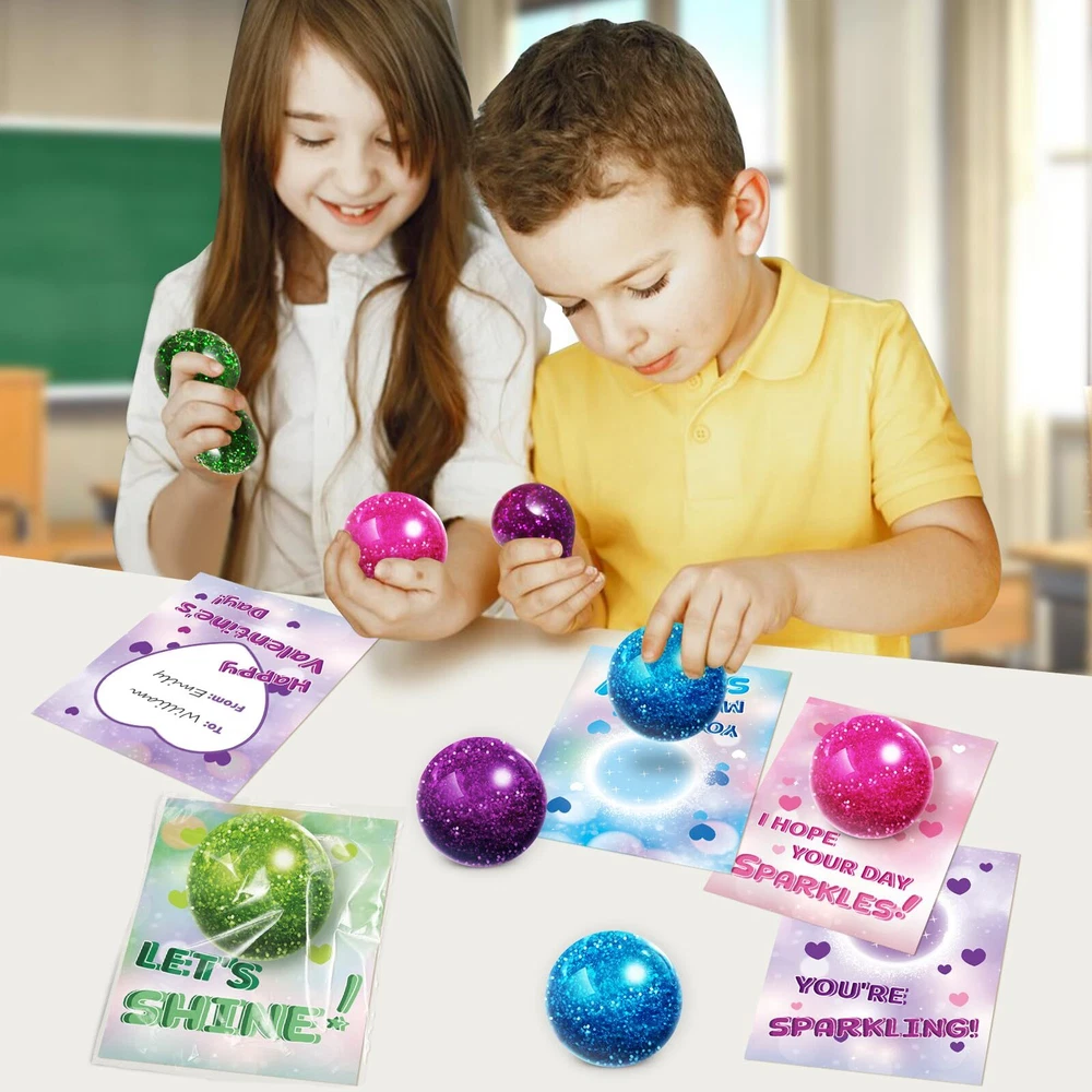 SUPER VALUE PACK:Valentine's Day card gift set for kids includes 24 individual packages glitter balls (4 different colors) and 24 valentine's day cards! Our balls is made of soft rubber (TPR) outer layer, which is non-toxic and safe. These balls with brilliant glitter sequins inside that make them more beautiful. It's a good Valentine's gift for kids and will let your kid give more than a normal card. SPECIAL-DESIGNED VALENTINE'S CARDS:Each Valentine's Day cards has both a glitter theme (with 4 designs) and a unique punchline of greeting to the balls, makes the cards more unique and attractive. The exchange cards with glitter balls will be a hit among kids. It is an ideal choice for kids gift cards on Valentine's Day. ENJOY FUN & SHARE LOVE:Give your little one the special Valnetine's gift instead of candy treats! Kids can write by themselves and give the cards and gift for their classmates, friends or family to express love for them. Great for kids classroom exchanges, preschool or elementary school Valentines parties, Valentine's event, or any Valentine's game prize, love notes, party favor supplies and more! KIDS VALENTINES DAY PARTY FAVORS:It is not only suitable for kids, but also for anyone. The stretchy balls is about 1.4", perfect size for hands, and no matter how you squeeze or twist, they will return the original shape. This will improve fine motor skills, and also enhance friends bonding. This Valentine's Day Party Favor Toy will bring joy and happiness to everyone on Valentine's day. QUALITY AFTER-SALES SERVICE:24PCS glitter balls set is suitable for many occasions, we believe that will bring you a unforgetable Valentine's experience. If you have any problem, please contact us within 24 hours, our customer service team will try our best to solve the problem for you.