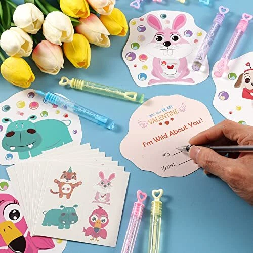 HomeValentines Day Cards for Kids - 32 Mini Bubble Wands + 32 Valentines Cards for