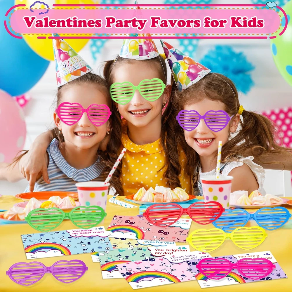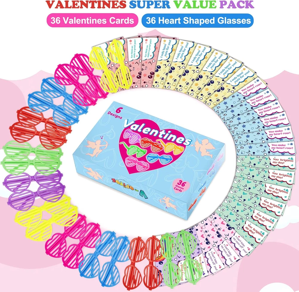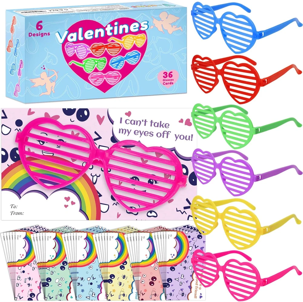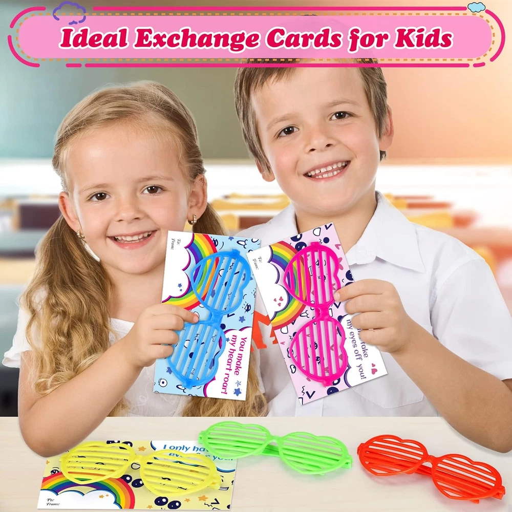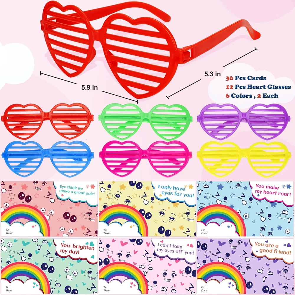 Value Valentine's Day Card Set For Kids - The package contains 36 glasses in 6 colors, and 36 cards with 6 different designs. It is sufficient quantity can meet the needs of kids in various parties and is suitable for Valentine's Day gifts and classroom activity prizes, they will surprise the kids in Valentine's Day. Cute & Colorful Card Design - 36 Valentine's Day greeting cards with 6 designs in different eye expressions which have cute and colorful patterns. And the front of each card contains special greetings, giving him/her the most sincere blessings, which is an ideal choice for kids gift cards on Valentine's Day. Safe & Reusable Glasses - The shutter shade glasses will not block the child's sight, they are made of the highest quality plastic, which can be safely used by kids, and the weight is very light, so there is no need to worry about burdening the children. The novel colorful glasses will amaze all children at the Valentine's Day party and bring more fun to boys and girls. Kids Valentine's Day Party Favor - The kids can write the name of the person they want to give on the card, and give these Valentine's Day cards to classmates, friends or family to express love for them. Let the children spend an unforgettable Valentine's Day together by exchanging Valentine's Day cards in class. Guaranteed Purchase - If for any reason you are not completely satisfied with your purchase, please click the "Seller Contact" button to send us an email, once we receive your message, we will solve it until you are satisfied. Product Description