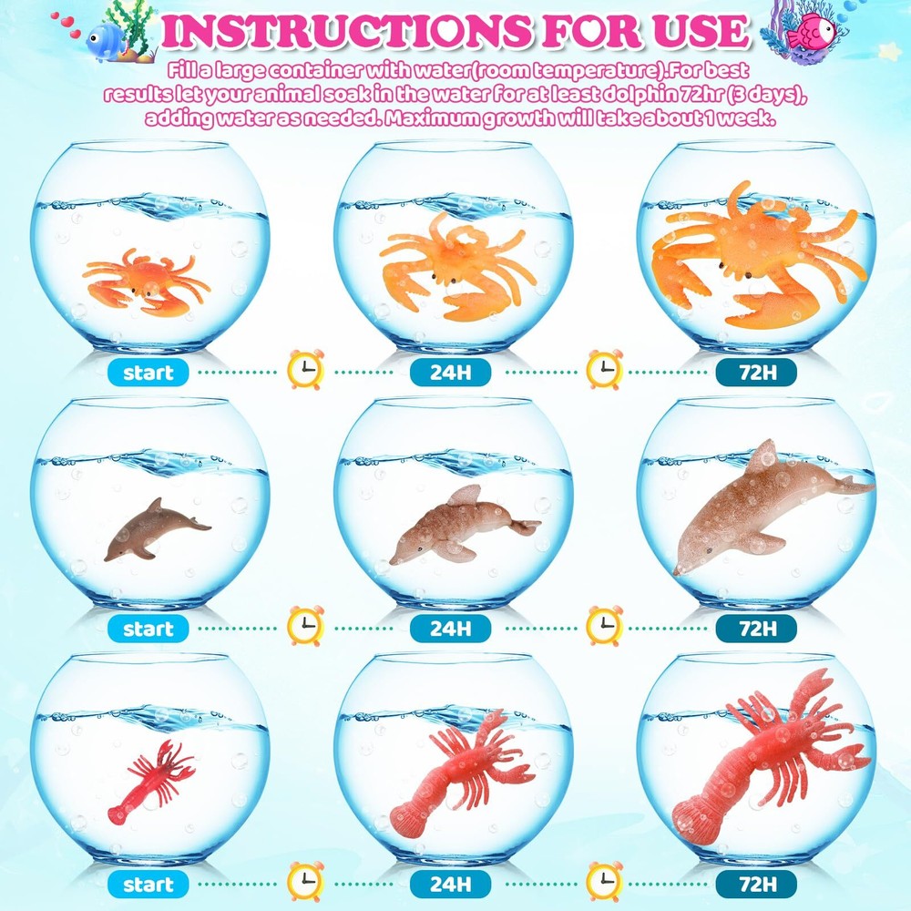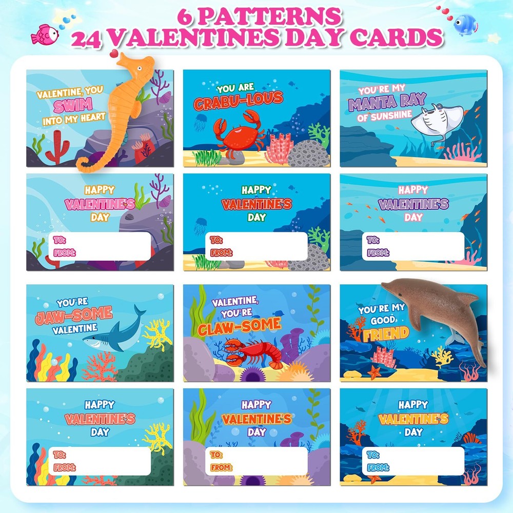 【Super Value Pack】Surprise your child with this delightful Valentine's Day gift set that includes 24 expandable ocean animals and 24 matching Valentine's Day cards. It's a fun and heartfelt way to celebrate love and friendship. 【Interactive Valentines Party Supplies】Discover 6 unique ocean animal designs, each coming with 4pcs, totally 24 animals. These ocean animals will bring the ocean magic to your child's Valentine's Day celebration. Watch as these ocean animals grow to full size when placed in water. The expansion process is fascinating and adds an extra layer of fun to the gift. Kids will love watching their tiny sea creatures transform into larger versions. 【Beautiful-Designed Valentine's Cards】Our set includes 24 colorful Valentine's cards, printed on sturdy paper to ensure durability. Customize each card with your personal message, making them perfect for classroom exchanges or as heartfelt gifts for your child's classmates. 【Kids Valentines Day Party Favors】These Valentine's greeting cards with sea animal toys are perfect for classroom exchanges, preschool or elementary school Valentine's parties, Valentine's events, or any Valentine's game prizes, love notes, party favors and more! They are the ideal Valentine's Day gift for boys and girls. Valentine's Day Gift Cards will provide endless fun and entertainment for your kids! 【Enjoy Fun & Share Love】Give your little one a special Valentine gift instead of candy treats! Kids can write by themselves and give the cards and gift for their classmates, friends or family to express love for them. we believe that will bring you an unforgetable Valentine's experience. If you have any problem, please contact us within 24 hours, our customer service team will try our best to solve the problem for you.