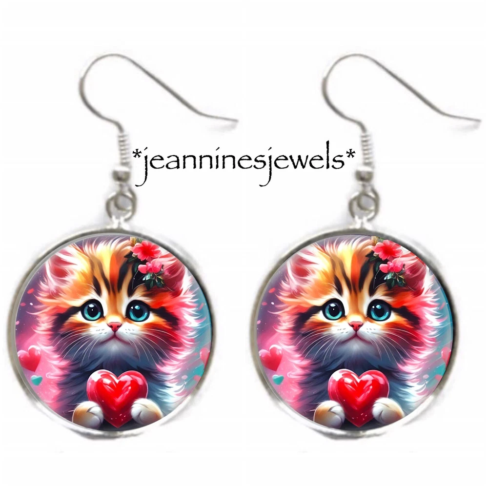 Setting Style: Bezel Signed: No Theme: Art, Love, Holiday, Roses, Valentines Day, Heart, Girlfriend Gift, Animals & Insects, Cat, Kitten Material: ART PRINT, JEWELERS RESIN Wholesale: No Country/Region of Manufacture: United States Handmade: Yes Shape: Round Item Diameter: 1 INCH CIRCLE Main Stone: ART PRINT UNDER JEWELERS RESIN Item Length: 1.5 INCHES INCLUDING WIRES Main Stone Color: Multicolor Main Stone Width: 1 INCH CIRCLE Color: Silver Main Stone Creation: HANDCRAFTED Ear Area: Lobe Type: Earrings Features: Nickel-Free, PACKAGED FOR GIFT GIVING, HANDCRAFTED IN VERMONT, USA, HIGH QUALITY MATERIALS, LIGHTWEIGHT Seller Warranty: No Country of Origin: United States Main Stone Length: 1 INCH CIRCLE Occasion: Anniversary, Birthday, Christening, Christmas, Confirmation/Communion, Engagement, Father's Day, Graduation, Mother's Day, Valentine's Day, Wedding Metal: Silver Plated Closure: French Wire Style: Dangle/Drop Brand: JEANNINES JEWELS Main Stone Shape: Round