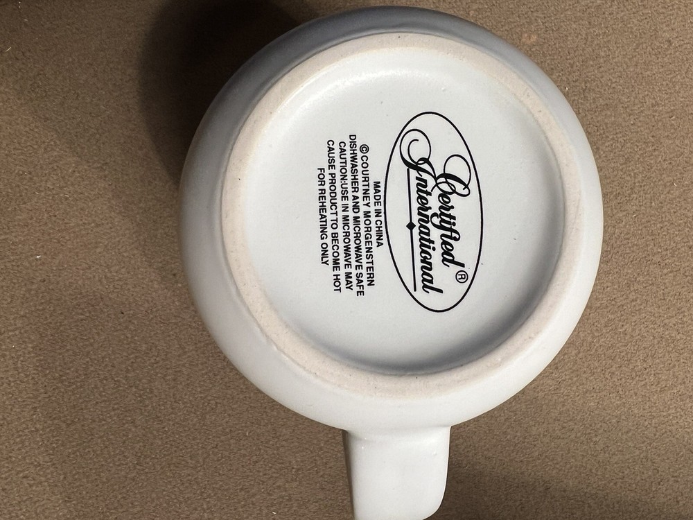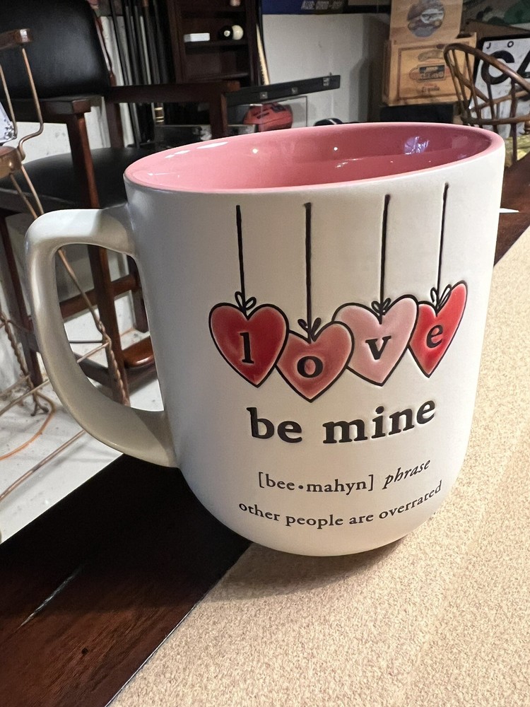 So adorable brand new Valentines Day large mug. Both sides say love be mine other people are overrated. It measures 4.25” high and 3.5” across. It is marked Certified International Made in China c Courtney morgenstern dishwasher and microwave safe caution: use in microwave May cause product to become hot for reheating only.