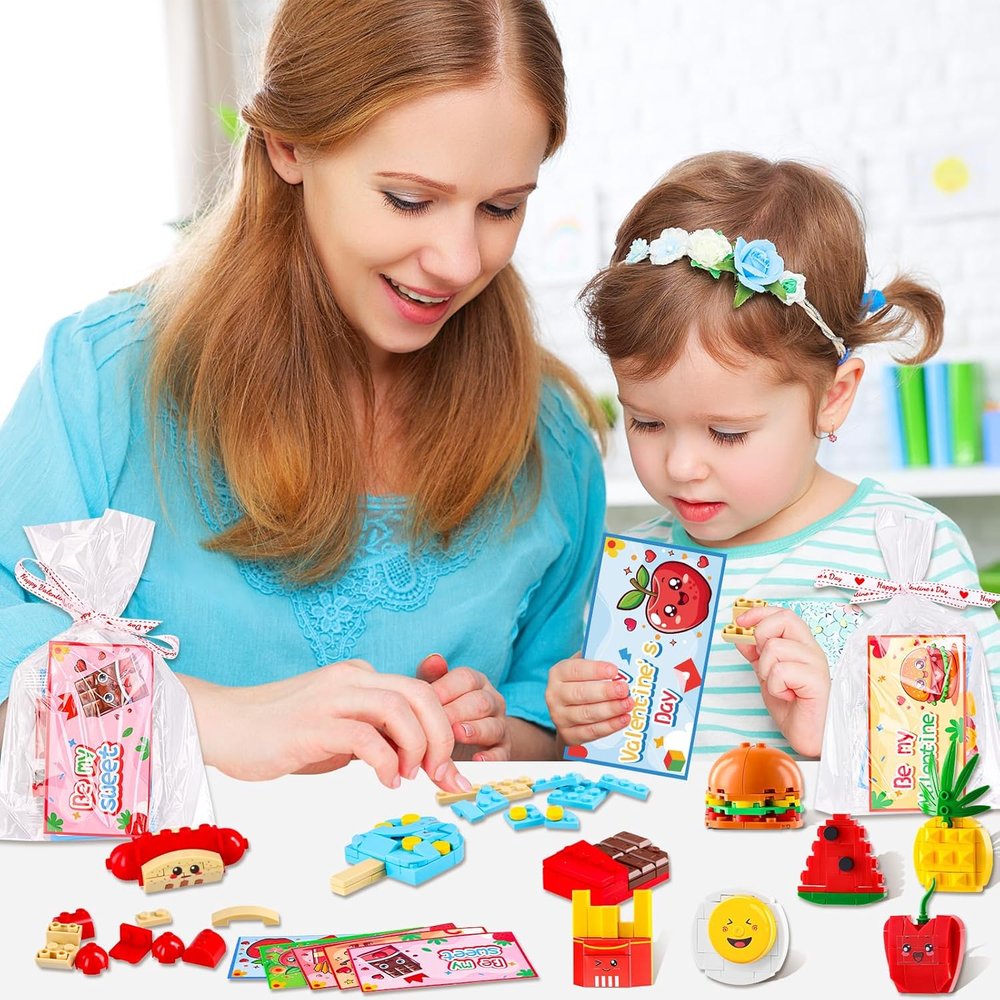 Valentine's Day Party Favors Set: Includes 30 adorable building blocks shaped like hamburgers, chocolates, French fries, hot dogs, steamed eggs, ice cream, peaches, pineapples, watermelons, and apples, perfect for kids' Valentine's Day themed parties. Accompanied by Valentine's Cards and Transparent Bags: Valentine's building blocks set comes with 30 Valentine's cards and 30 transparent bags, allowing your little ones to easily share these fun blocks and cards as gifts. Fun Classroom Activities for Valentine's Day: Kids can unleash their creativity by assembling the blocks, enjoying hands-on fun while developing teamwork and communication skills. Suitable for Multiple Occasions: Ideal for use in classrooms, Valentine's Day parties, birthday celebrations, and holiday events, making it the perfect small gift for classmates and friends. Safe Materials for Family Fun: All Valentine's blocks are made from safe and eco-friendly materials, ensuring children's health and safety, and are suitable for interactive games that parents can enjoy with their kids. Product Description MGparty 30PCS Valentines Day Gifts for Kids Classroom-Valentines Building Blocks Valentines Day Gifts,Valentines For Kids Classroom Valentines Cards For Kids Classroom,Valentine's Day Gift Kids Valentines Day Gifts For School,Valentines For Class Class Valentines Day Gifts For Kids,Valentines Day Gifts For Kids Classroom 30 Pack Valentine's Day Cards Building Block for Kids The video showcases the product in use. The video guides you through product setup. The video compares multiple products. The video shows the product being unpacked.