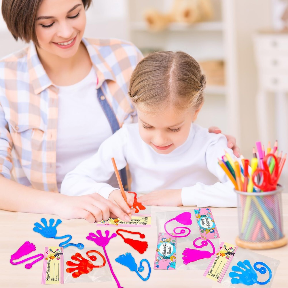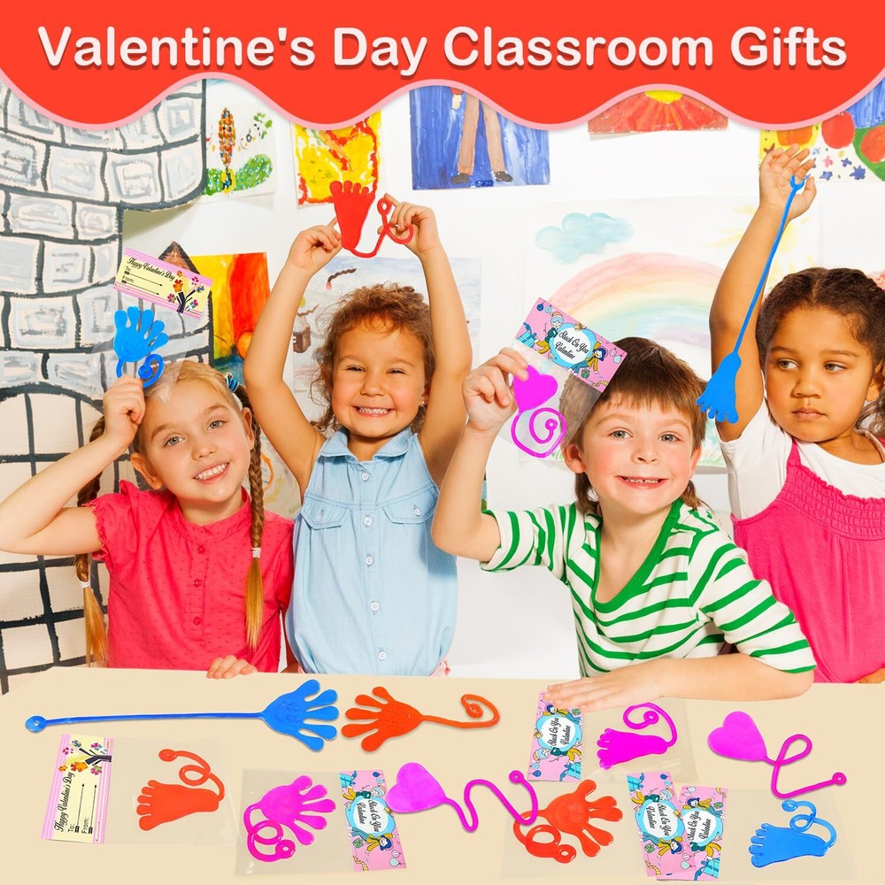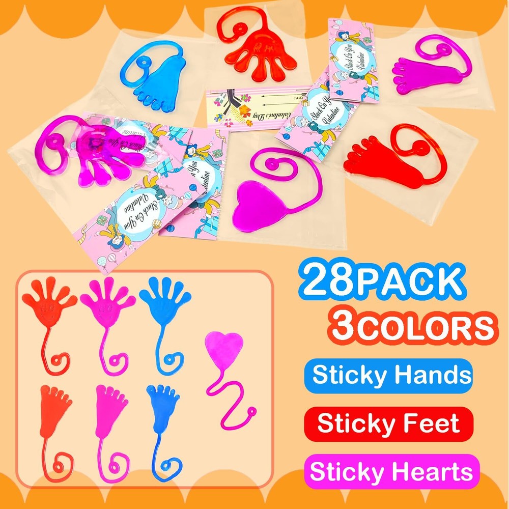 28 Valentines Toys with Cards - This set includes sticky hands, sticky feet, sticky hearts with Valentines cards that allow your kids to write names on them. Valentines Gifts for Kids Classroom - Great Valentines school class gifts for your kids to give out to their classmate and friends on Valentine's Day. Valentines Party Favor Supplies - Excellent fun gifts goodie bag stuffer filler prizes non candy treats for kids party at school. Stretchy & Slimy Toys - These toys are made of vinyl, which is sticky, slimy, stretchy, and gooey. Kids' Favorite Stuff - Kids will love tossing and flinging them on the ceiling, walls, windows, and tables. It will keep them entertained for hours. Fun for All Ages - Perfect for preschool, kindergarten, daycare toddler boys girls and older kids who love playful fun.