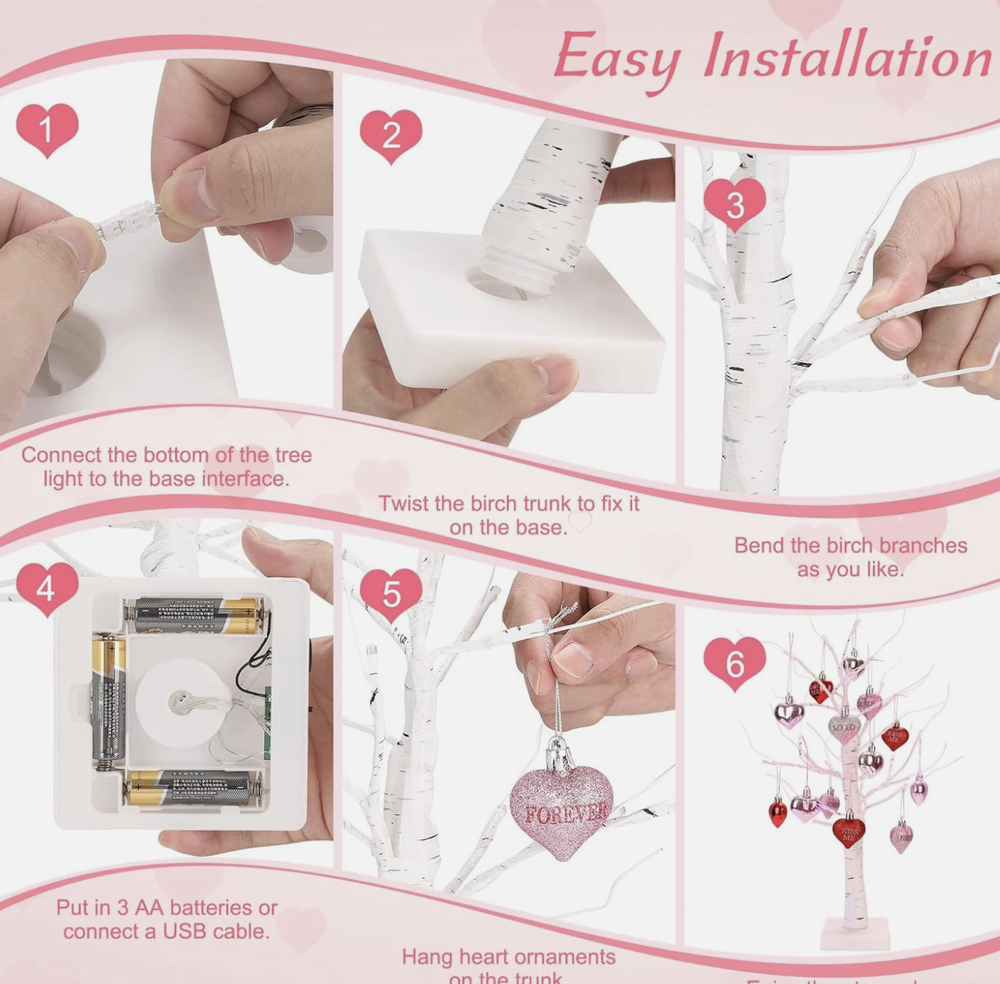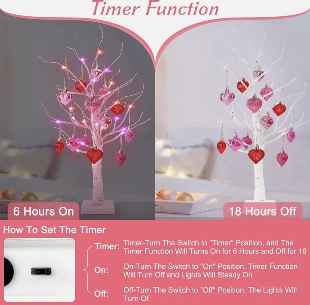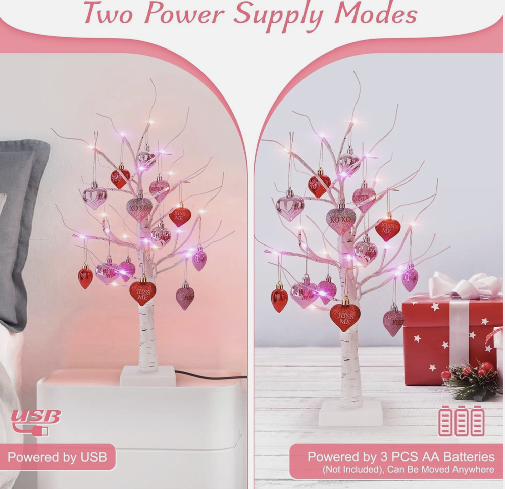 ---Icqovd's Romantic Valentine's Day Decoration : This 24-inch lighted tree, adorned with 60 LED lights and 18 heart ornaments, adds a romantic touch to your Valentine's Day, wedding, anniversary, or any special occasion. ---Dual Power Options : Conveniently powered by either 3 AA batteries (not included) or a USB cable (included), this versatile tree can be placed anywhere without the need for a power outlet. ---Flexible & Adjustable Branches : Crafted from durable PVC, the flexible branches can be easily adjusted to create the perfect natural tree shape, suiting your decorative needs. ---Versatile Uses : Perfect for decorating your home, bedroom, party, table, fireplace, patio, bar, office, and more, this charming tree enhances the festive atmosphere of any space. ---Thoughtful Gift Idea : Given as a Valentine's Day gift or for any other special occasion, this decoration tree is a heartfelt present that brings joy and festivity to your loved ones. 【Romantic Valentines Decorations】: This Lighted Valentines Day Tree with 60 LED Lights and 18 pcs heart ornaments decor. This beautiful Valentine's Day tree light is the romantic decoration for your Valentine's Day, wedding, anniversary or any special day. 【USB & Battery Powered】: This Valentine's day tree light has two power modes for you to choose from, one powered by 3 AA batteries (batteries not included), and the other powered by USB cable (included). 【Easy to Use】: Since this battery operated Valentines day lights can also be used without a plug, you can decorate it anywhere you want. 【Adjustable Branches】: The flexible branches are and you can easily adjust the shape of the Valentines day tree receiving it to the ideal natural tree shape. There are buttons on the base to control this lighted valentines day decor tree. 【Wide Range of Uses】: Use these cute valentines day table decor to decor your home, bedroom, party, table, fireplace, patio, bar, office, etc. Make your home and party more attractive and festive with these pretty valentine's day decor tree. Also a valentines day gifts for her/kids.