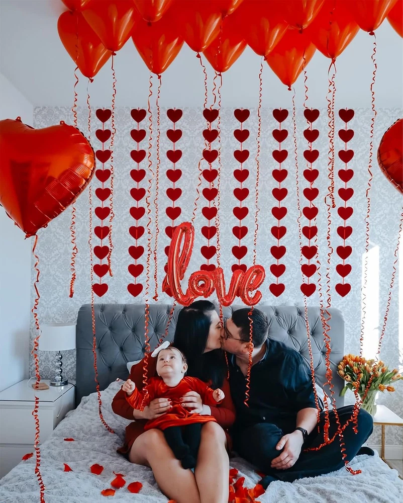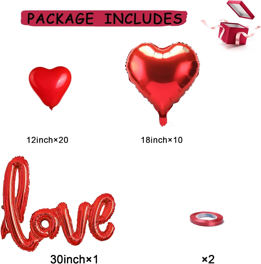 Perfect Decorations for Valentine's Day - This valentines day decorations kit inclueds (Red Felt Garland Hanging String Hearts, Latex heart balloons×20, foil heart balloons×10, Love balloon×1, Red Silk Rose Petals×1000). This valentines day decorations kit will make a unique and luxurious valentine's party High Quality Materials - Balloons are made of high quality with thick skin that won' t easily pop and are TRUE to their color. The latex allows the balloons to stretch very well when you inflate them. You don't need to worry about how long your balloon can last. You can tie the balloon where you want, or fill it with helium, tie it to a red ribbon and float it from the ceiling. It will be a romantic evening just for your love The Red Felt Garland Hanging String Hearts NO DIY - The garlands come pre-assembled and ready to hang, no assembly needed of buyer. You can cut it to any length and hang it anywhere Romantic Room Decoration - Romantic Room Decorations - On the floor, on the bed, in the bedroom, in a room full of balloons, so many romantic decorations for Valentine's Day to decorate your room. I'm sure your lover will squeal with surprise and hug you tightly when he enters the room decorated by your own hands 24-hours E-mail Response - If you have any problems about it; please contact us, We will provide the Warmest customer service Product Description This Valentine's Day set is suitable for indoor use, Great decorative heart garland for valentine’s day, wedding party, engagement party, bridal shower, baby shower, birthday party...add festive touch to your party.