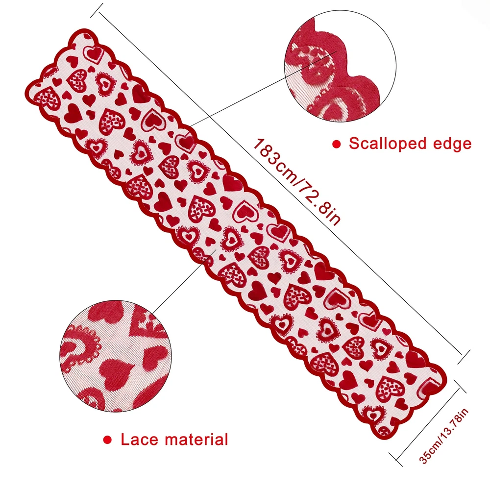 Valentines Day Table Decoration: If you are looking for some romantic Valentine's Day decoration, our lovely lace red heart table runner is perfect for you! various red sweet heart is a beautiful seamless one piece design. This unique table runner will make your festival more romantic. Using them to decorate your valentines table and add more atmosphere to your Valentine's Day. Soft and Safe Material: This Valentines day table runner made of premium lace, bright and vivid red color,knitted with various heart pattern, exquisite scalloped edges, not easily loose thread, soft and lightweight. our table runners can be applied to various table surfaces, such as dinner table, desk, storage table, coffee table and so on, suitable for indoor or outdoor picnic activities, can add a classic and elegant touch to the table. Perfect Size : Our table runner measures about 72 x 13 inches in size, appropriate for a table that can seat 2 ~ 6 people, and suitable for dining table, coffee table, entry way tables, outdoor patio tables, tea table and more.if you want to have a perfect valentines party or appointment, our table runner is a must have choice. Wide Application: Dress up any table or mantle for your Valentines day with this beautiful red heart table runner,eye-catching and delicate for your home decorations. You can also use it at your engagement, wedding, Anniversary party. Using them to decorate your table and add more atmosphere to your event. About Washing: Machine wash in gentle cycle or hand wash in cold water with mild soap, no worry of color fading.