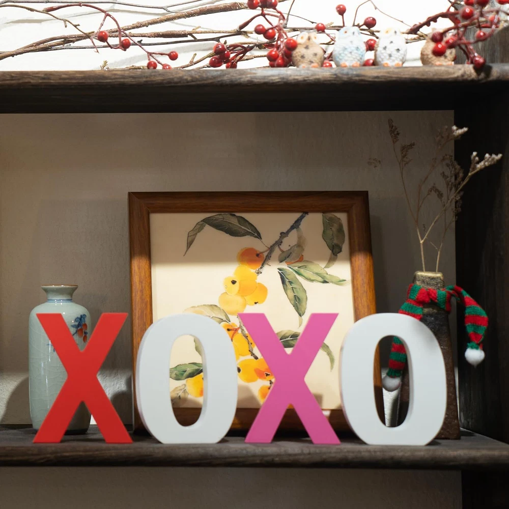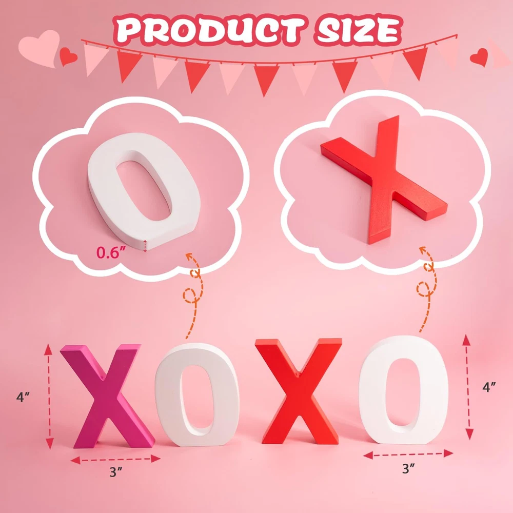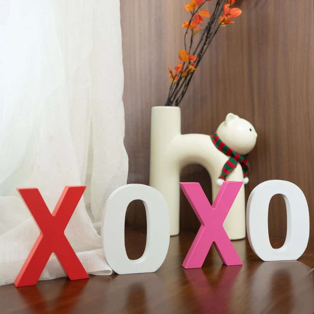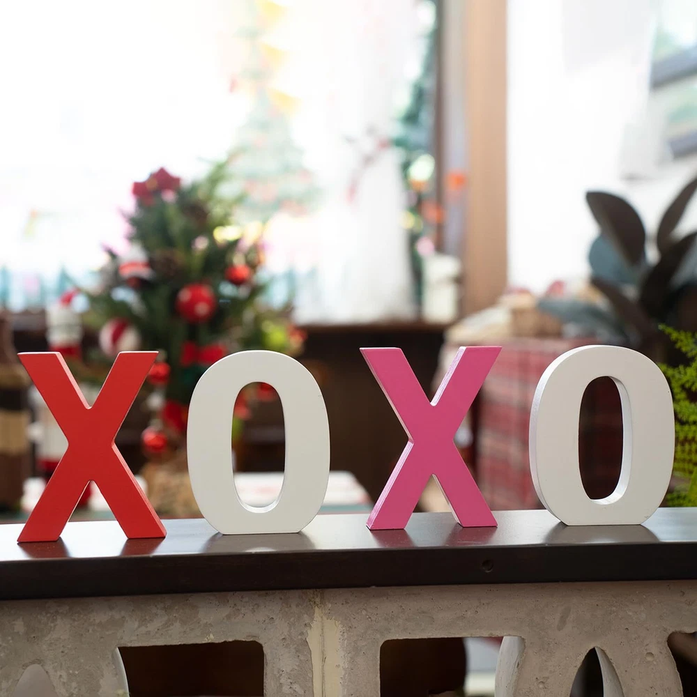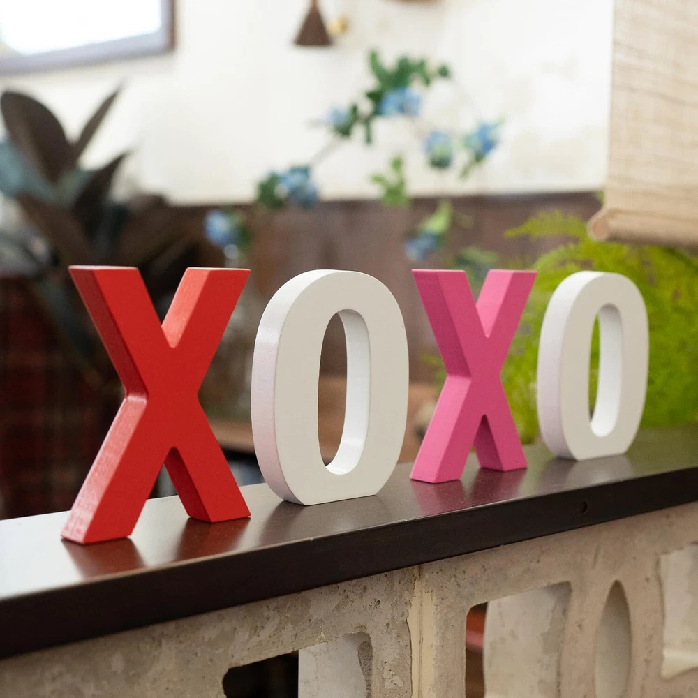 Package Includes: 2 different color "X", 2 white "O" wooden signs, which can express your deep love, they are ideal choices to send to your lovers as ornaments or presents, they measure approx 4 x 4 x 0.6 inches, adorable and charming, adding more romantic charms to your Valentine's Day. Romantic Ornaments: theses wooden letter blocks are exquisite supplements for your ornaments needs, they can be placed at layer trays, shelves, tables, mantelpieces, coffee tables, decorative boards or anywhere, creating a sweet Valentine's Day atmosphere. High Quality Made: the xoxo valentines day decor are made of quality wood material and sprayed with quality paint, not easy to fade, firm and sturdy, not easy to deform or break, they feature smooth surface and polished edges, you can use them for a long term. Valenitnes Day Gifts for Him/Her: you can send wooden letter blocks decorations as warm and cute presents to your lovers and friends, they are also suitable for various occasions, such as housewarming, wedding, anniversary, Mother's Day, Thanksgiving's Day, Christmas and other occasions, can express your love, besides, they do not occupy too much space on the desk and shelf. Unique Design: the xoxo wooden signs can stand stably on the table without tipping over, and stand out in your Valentine's Day decor.