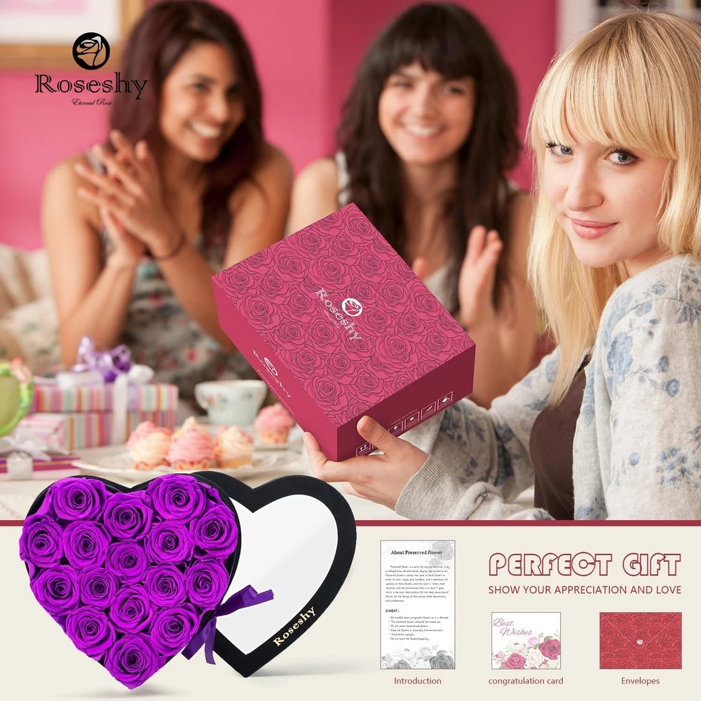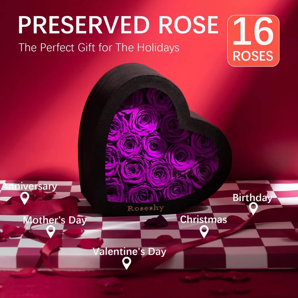 Valentines Day Flowers Roses Gifts for Her,16pcs Purple Forever Preserved Roses in Heart Shape Gift Box,Valentines Day Delivery Prime Gifts-Roses Gifts for Women,Mom. Product Details Color: Purple Brand: Roseshy MPN: Does not apply UPC: Does not apply EAN: Does not apply Package Dimensions: 8.54 x 8.46 x 5.47 inches Item Weight: 1.32 pounds Manufacturer: Roseshy Number of pieces: 16 Batteries required: No Eternal Preserved Roses: These preserved roses can be kept for 1-3 years, expressing everlasting love and affection. Heart-Shaped Gift Box: The set includes 16pcs of forever preserved roses beautifully arranged in a heart-shaped gift box, perfect for romantic occasions. Thoughtful Gifts: Ideal for girlfriends, wives, moms, or any special woman in your life, these roses make heartfelt gifts that convey love and appreciation. Versatile Occasion: Whether it's Christmas, Valentine's Day, Mother's Day, anniversary, or a birthday, these preserved roses are a fitting gift choice. Lasting Beauty: Unlike fresh flowers that wither quickly, this preserved rose set stays vibrant and attractive, serving as a lasting symbol of your love and care.