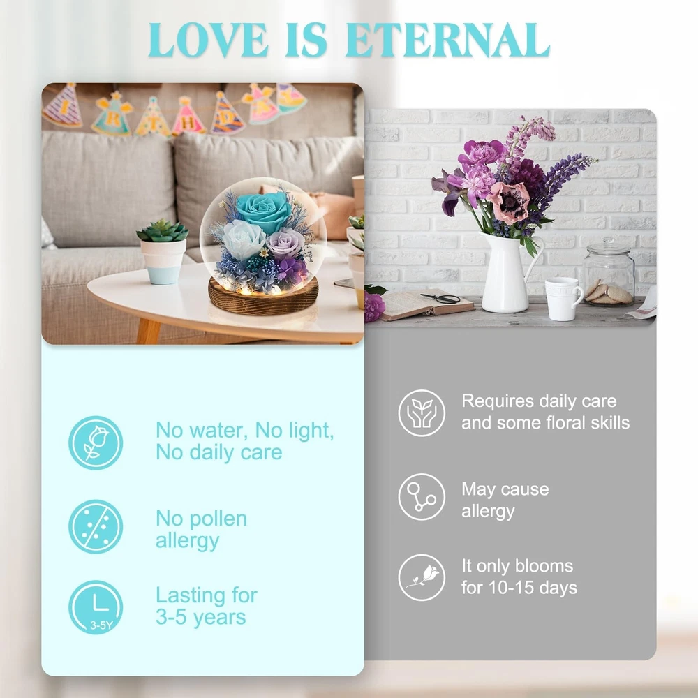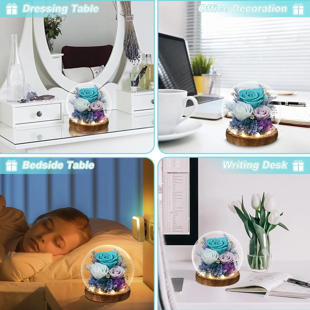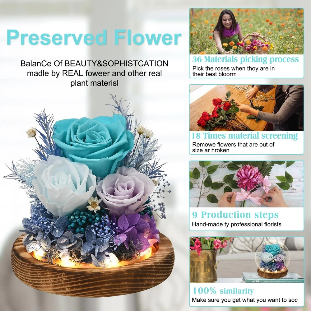 Valentines Day Forever Real Roses for Her, Flowers for Delivery Prime, Preserved Roses Bouquet Flowers in Glass with LED Light Gifts Ideas for Birthday, Anniversary, Christmas, Mothers Day (Blue) Product Details Color: Tblue Brand: DOFW MPN: RXWNM66 UPC: Does not apply EAN: Does not apply Brand: DOFW Plant or Animal Product Type: Preserved Flowers Color: Tblue Number of Items: 1 Item dimensions L x W x H: 3 x 3 x 3 inches Product Dimensions: 3 x 3 x 3 inches Item Weight: 11.3 ounces Manufacturer: Wbnrr Country of Origin: China Item model number: RXWNM66 Date First Available: September 1, 2024 Valentines Day Gifts for Her: Lasting Reminder of Your Love & Appreciation, Preserved Roses Gifts for Women, Mom, Grandma, Wife, Girlfriend, Sister, Mother, Daughter, Family and Friends. Suitable for Various Occasions: Preserved flowers with LED lights in glass dome can be given to family and friends as gifts for Valentine's Day, Christmas, Mother's Day, Thanksgiving, engagement, housewarming, wedding. Flowers for Delivery Prime: Handcrafted with natural flowers, we carefully choose the finest and most vibrant Flowers from our garden. Using advanced preservation techniques, these roses retain their beauty and freshness indefinitely, symbolizing everlasting elegance and love. Exquisite Gifts Sets: Product Size: 5.3*5.3inches, Forever Eternal Rose with Gifts Box Set (You dont need to buy additional gift packaging). Warm Tips: Eternal Flower Glass Dome was securely encased in foam with in the box, which greatly reduces the possibility of the product being damaged in shipping. Please contact us if you have any inquiry or issue.