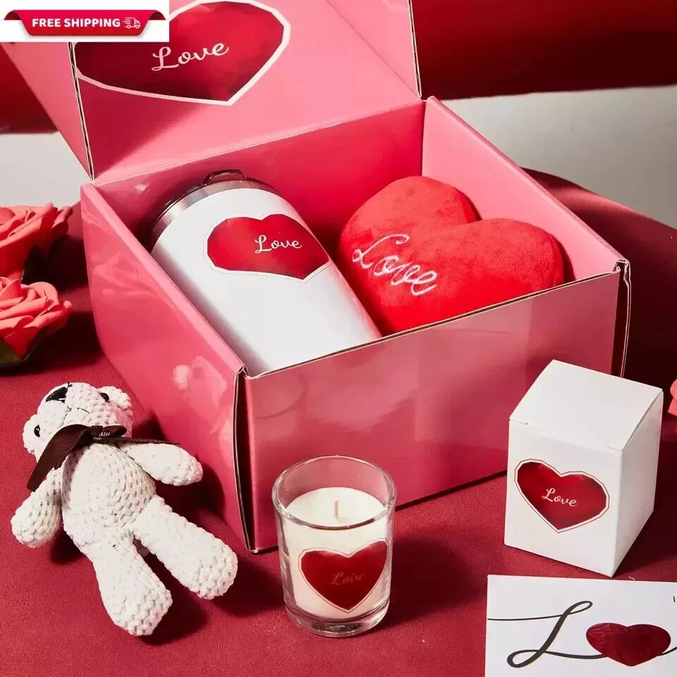 【Perfect Gift Box for Every Occasion】Every item in our gift set has been carefully selected and curated to create the most special moment for that lady in your life. Love gift box is suitable for her birthday, Valentine's Day, anniversary, mother's day, women's day and more. Gifts for women who have everything 【Heartwarming Gift】Gifts Basket includes a 20oz insulated stainless steel tumbler that says "LOVE", a heart shaped pillow, a plush bear , a soy wax candle and a greeting card. Whether its a gift to celebrate a wedding, birthday, mother's day, anniversary , gift baskets will make a truly unique and treasured gift 【Romantic Anniversary Gift】 Whether you are lighting it for a romantic dinner or creating an intimate moment in the bedroom for a couple, this Love You Candle will make your anniversary or Valentine's Day even more special with its warm candlelight and rose scent! 【Valentine's Day Romantic Gift】Heart Valentine's Day plush can not only be given as a gift on Valentine's Day, but also as home decoration.The cute heart design is perfectly matched with any room, creating a beautiful and unique vitality atmosphere, is the warmest gift for a girlfriend and wife 【Love tumbler cup gift】This Valentine's Day love tumbler cup is made of unbreakable 304 stainless steel, which is reliable, not easy to rust, and the double wall insulated design of the wine tumbler can keep it dry from the outside, comfortable to hold and portable to carry, which can keep your drinks cold or hot for a long time