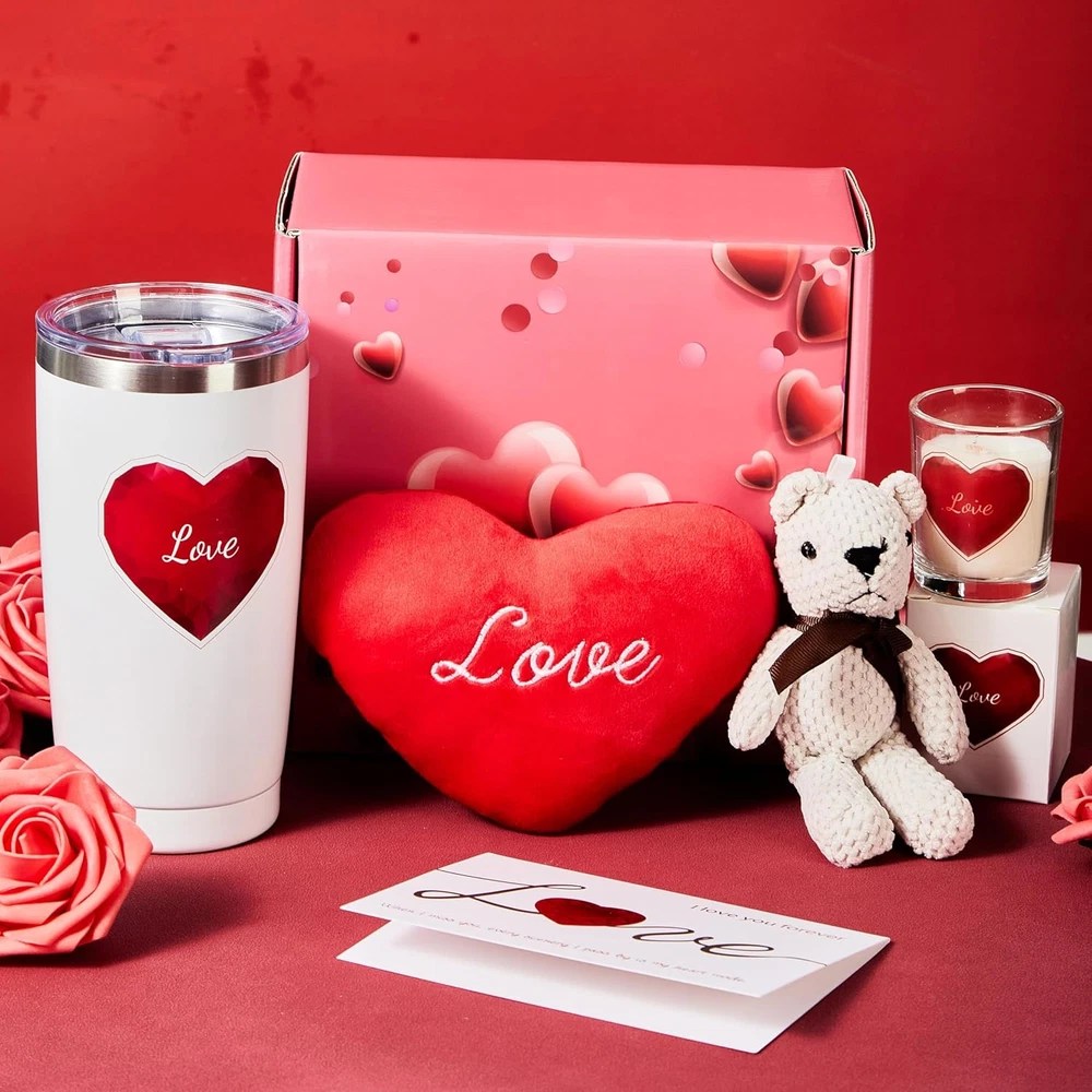 【Perfect Gift Box for Every Occasion】Every item in our gift set has been carefully selected and curated to create the most special moment for that lady in your life. Love gift box is suitable for her birthday, Valentine's Day, anniversary, mother's day, women's day and more. Gifts for women who have everything 【Heartwarming Gift】Gifts Basket includes a 20oz insulated stainless steel tumbler that says "LOVE", a heart shaped pillow, a plush bear , a soy wax candle and a greeting card. Whether its a gift to celebrate a wedding, birthday, mother's day, anniversary , gift baskets will make a truly unique and treasured gift 【Romantic Anniversary Gift】 Whether you are lighting it for a romantic dinner or creating an intimate moment in the bedroom for a couple, this Love You Candle will make your anniversary or Valentine's Day even more special with its warm candlelight and rose scent! 【Valentine's Day Romantic Gift】Heart Valentine's Day plush can not only be given as a gift on Valentine's Day, but also as home decoration.The cute heart design is perfectly matched with any room, creating a beautiful and unique vitality atmosphere, is the warmest gift for a girlfriend and wife