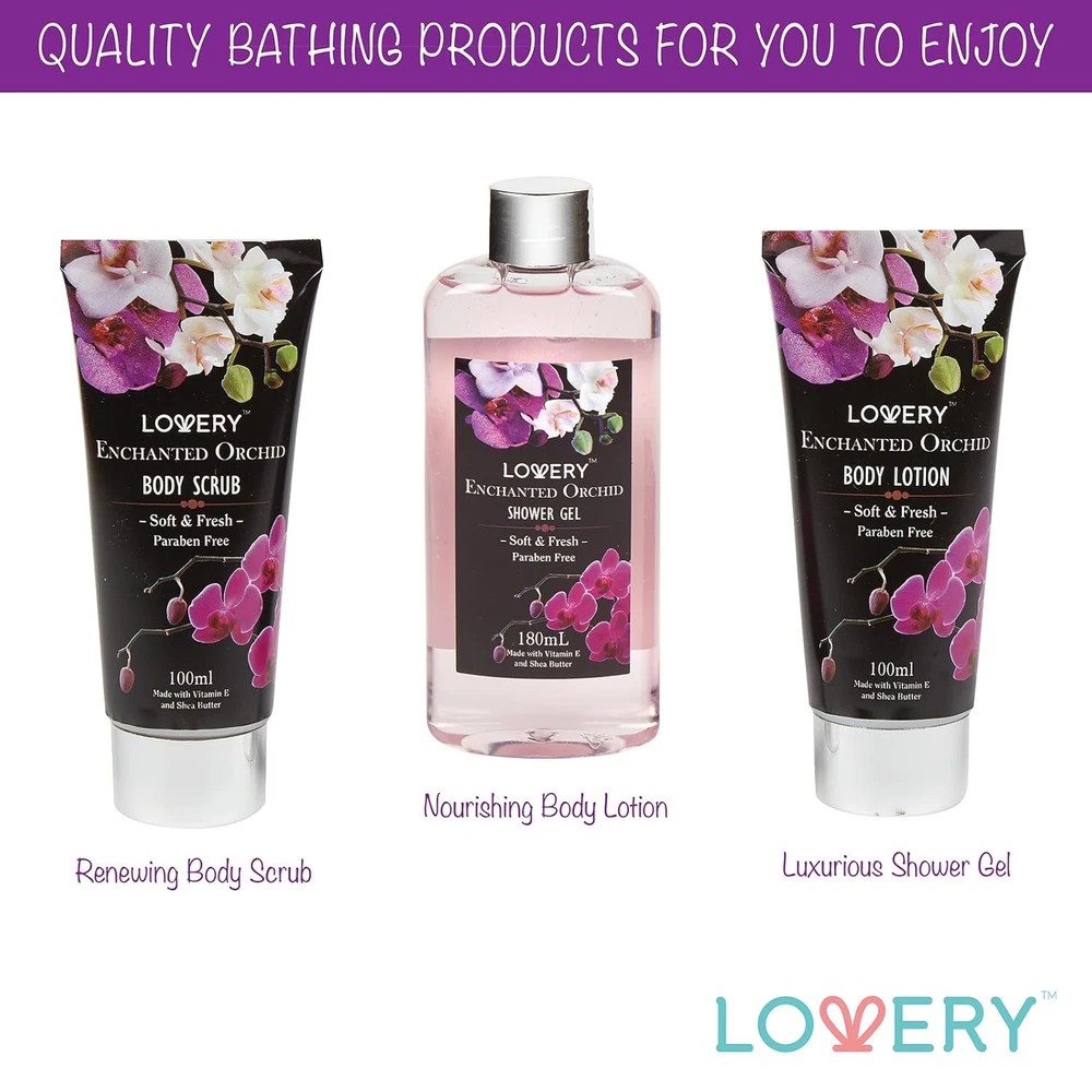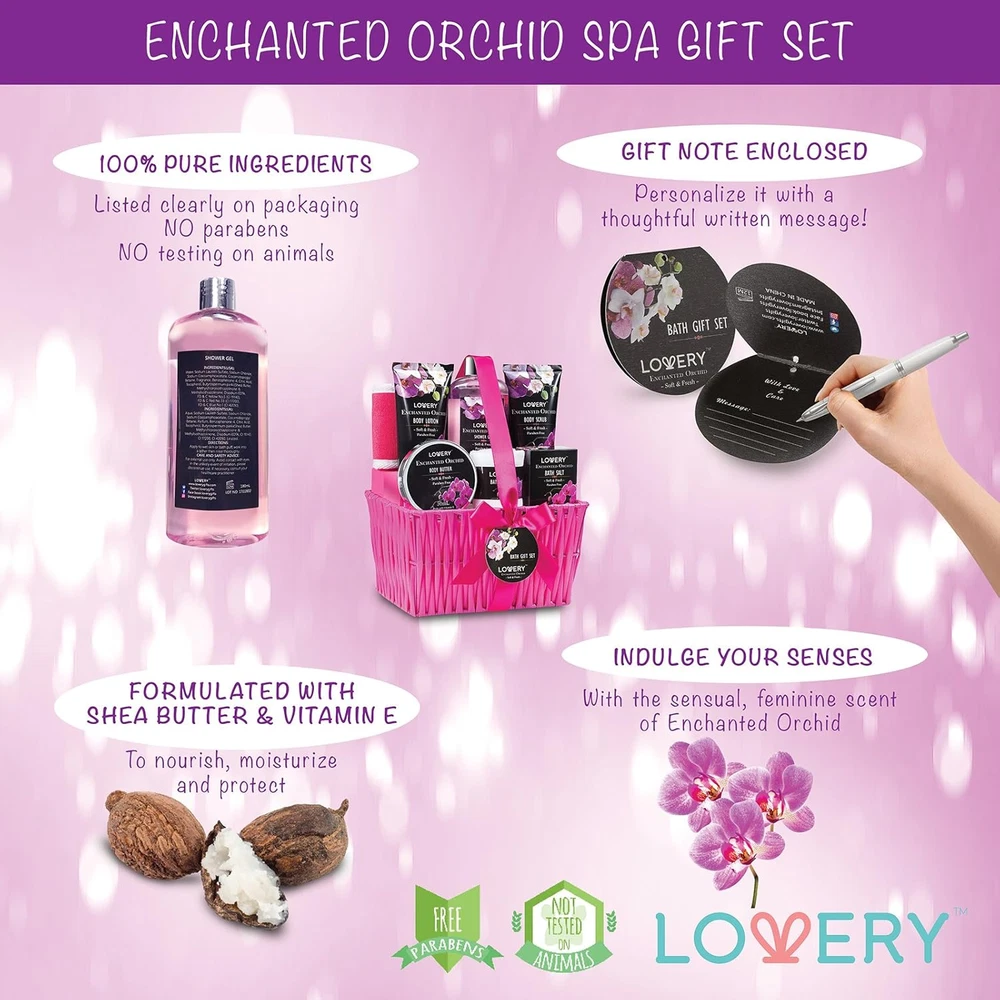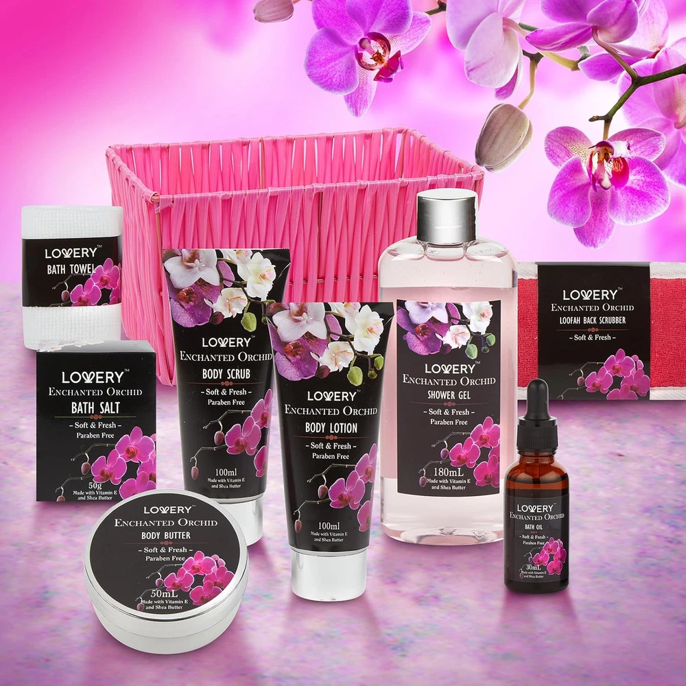 COMPLETE SPA GIFT SET ★ Indulge your senses with a luxurious at-home spa treatment! Beautifully packaged in a pretty pink basket, this bath gift set makes for an extraordinary gift, and adds a lovely touch to the bathroom. Contains a Shower Gel(180ml), Body Butter(50ml), Body Lotion(100ml), Body Scrub(100ml), Bath Salt(50g), Orchid Massage Bath Oil(30g), Plush Towel, Exfoliating Loofah Back Scrubber and a Deep Pink Wicker Basket for decor and storage. ENCHANTED ORCHID FRAGRANCE★ Enchanted Orchid is a hypnotic fragrance that's sultry, intriguing, and conjures the image of an exotic blooming garden. You'll permeate a sensual, feminine charm when using this seductive fragrance. Soak in ultimate leisure with our fine bath products that will stimulate your senses, leaving skin smooth and supple. GREAT FOR YOUR SKIN ★ Why waste money on chemical-laden skincare that may harm your body and the environment? These luxury bath accessories are PARABEN-FREE AND NEVER TESTED ON ANIMALS. In addition, they're made with SHEA BUTTER & VITAMIN E to soothe, moisturize and protect your skin. The delicate bath oil will soften your skin. All ingredients used in this spa basket are clearly displayed for your benefit. THE IDEAL HOLIDAY GIFT IDEA ★ Find the way to your woman's heart & delight her with something truly special when presenting this gift of sheer indulgence! Personalize it with a thoughtful written message on the enclosed gift note to win the heart of your Girlfriend, Wife, Mom, Sister, or Friend. What better way to celebrate Birthdays, Anniversaries, Christmas, Mother's Day, Valentine's Day & Thanksgiving with the ultimate beauty spa gift basket, Armed with our array of lavish bath accessories! 100% SATISFACTION GUARANTEE ★ Here at Lovery, your complete satisfaction is our main priority! We're sure you'll adore this deluxe home spa gift basket - but in case of any order-related issues, feel free to contact us for five-star customer service. We promise to do everything in our power to make it right! Give yourself a spa treatment without leaving the comfort of your own home. The Lovery White Orchid and Jasmine Bath and Spa Set includes everything you need to pamper yourself. This all-inclusive set features everything you need to look and feel beautiful. With everything from shower gel to bath oil you can indulge in the soothing scent of jasmine and fresh orchids. Our products are made with moisturizing shea butter and nutrient-rich vitamin E oil. SET INCLUDES: 180ml Shower Gel 180ml Bubble Bath 100ml Body Lotion 100g Bath Salt 50ml Body Scrub 30ml Bath Oil Bath Towel Loofah Back Scrubber Gold Basket BENEFITS & FEATURES: 9 Piece Set White Orchid & Jasmine Scent 100% Paraben Free Not Tested on Animals Works For All Skin Types Beautiful Packaging LUXURIOUS BATH SET! Step up your beauty routine with this deluxe spa basket. It includes everything you need to spoil yourself from head to toe. Looking and feeling great is effortless when you have everything you need to fortify your skin with moisture. Take a relaxing bath using our bath oil, bath salt, body scrub and body lotion. Use the bath pouf to create a rich lather with our nourishing shower gel. The included gift basket is reusable and perfect for decoration and storage. Our bath set will leave you feeling beautiful from your head to your feet! THE PERFECT GIFT FOR HER Make her feel like a pampered princess. The refreshing scent will invigorate her senses and make her feel like she’s getting the full spa treatment right at home. Soothing aromas are perfect for rest and relaxation. It’s exactly what she needs and it’s perfect for any occasion.