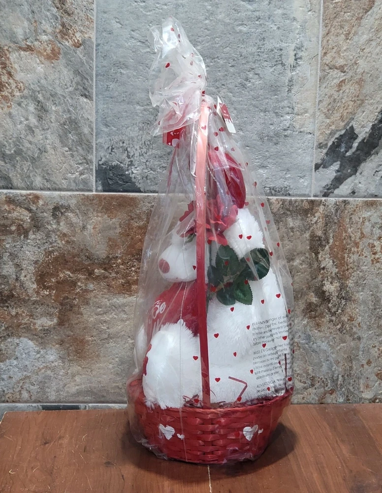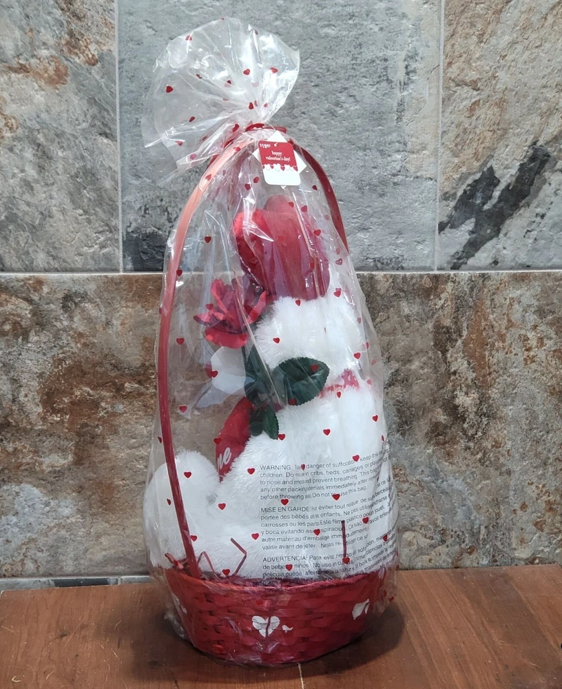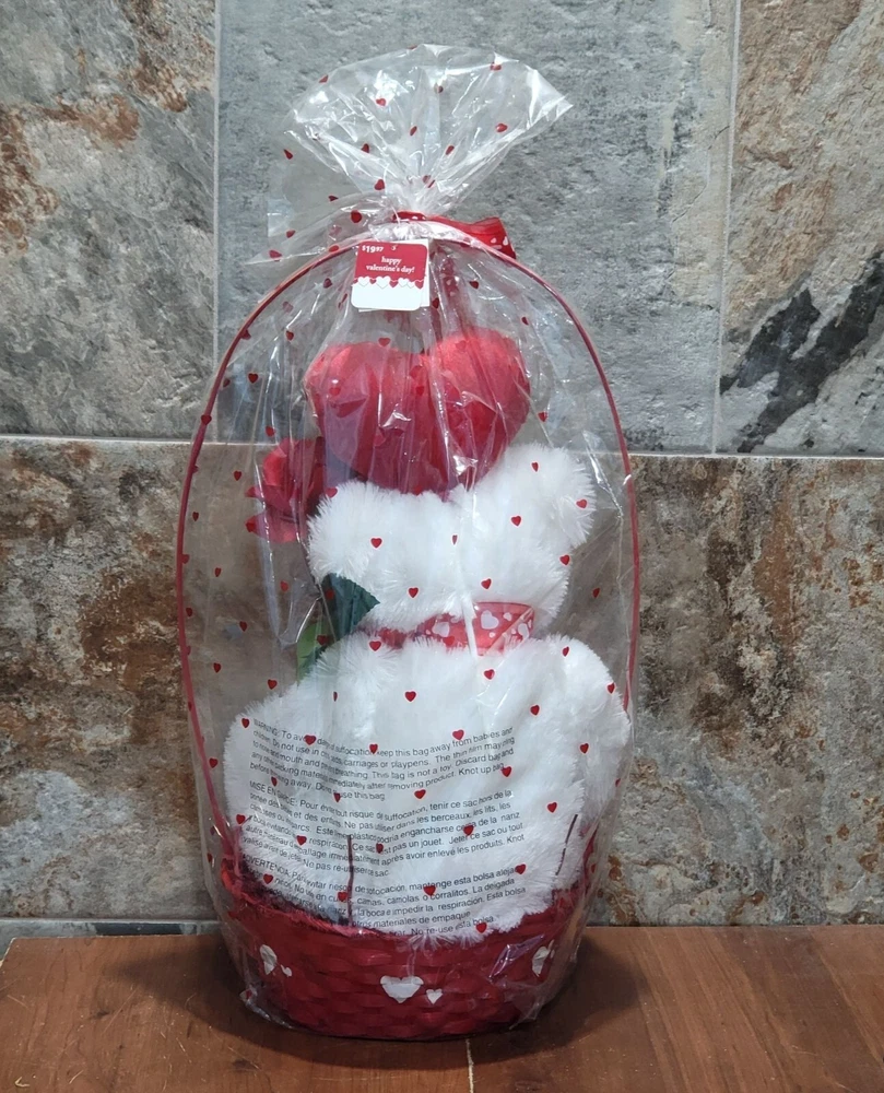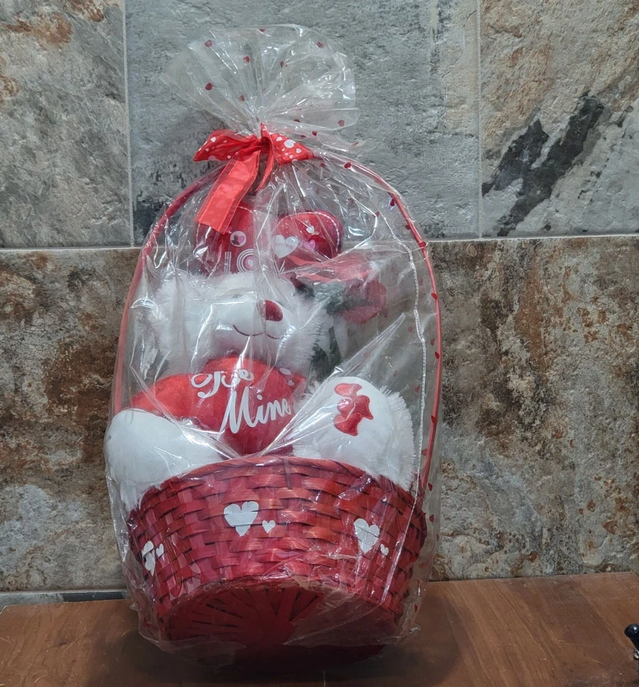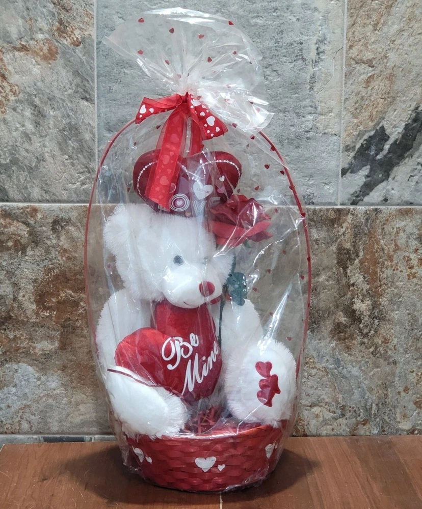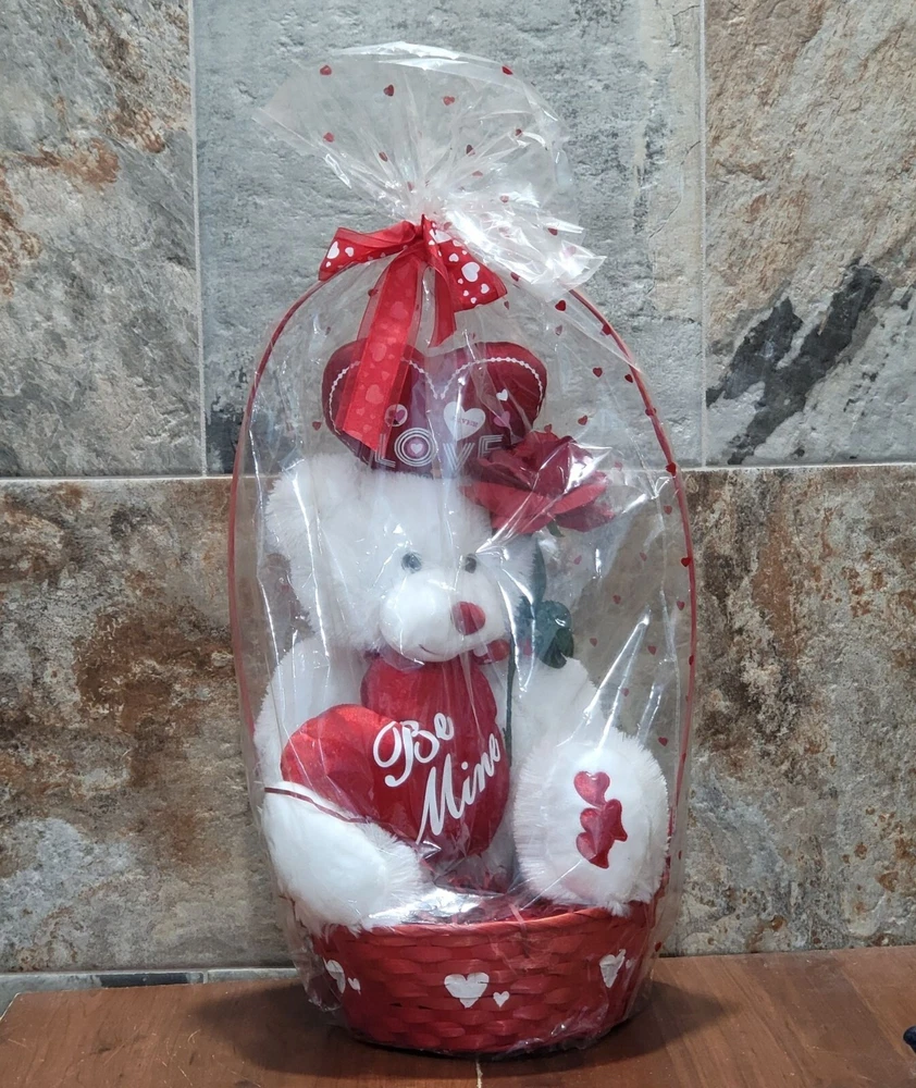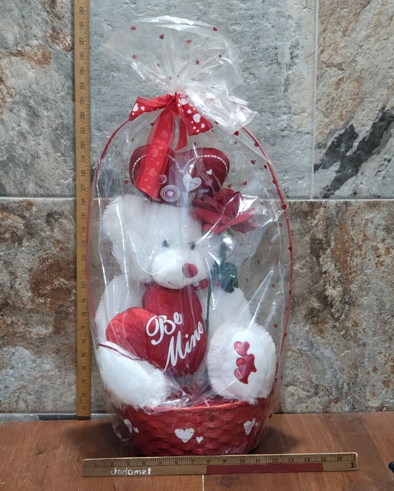 Valentines Day Gift Be Mine Bear Plush Love Heart in Gift Basket Stuffed Animal Measurement: 13 x 11 x 22 in Weight: 1 lb 4.8 oz Your item may come in a re-used box with some labeling from other companies In my effort to recycle and re-use. Thank you for supporting my small business. Features: • Plush • China Condition: Pre-Owned Good