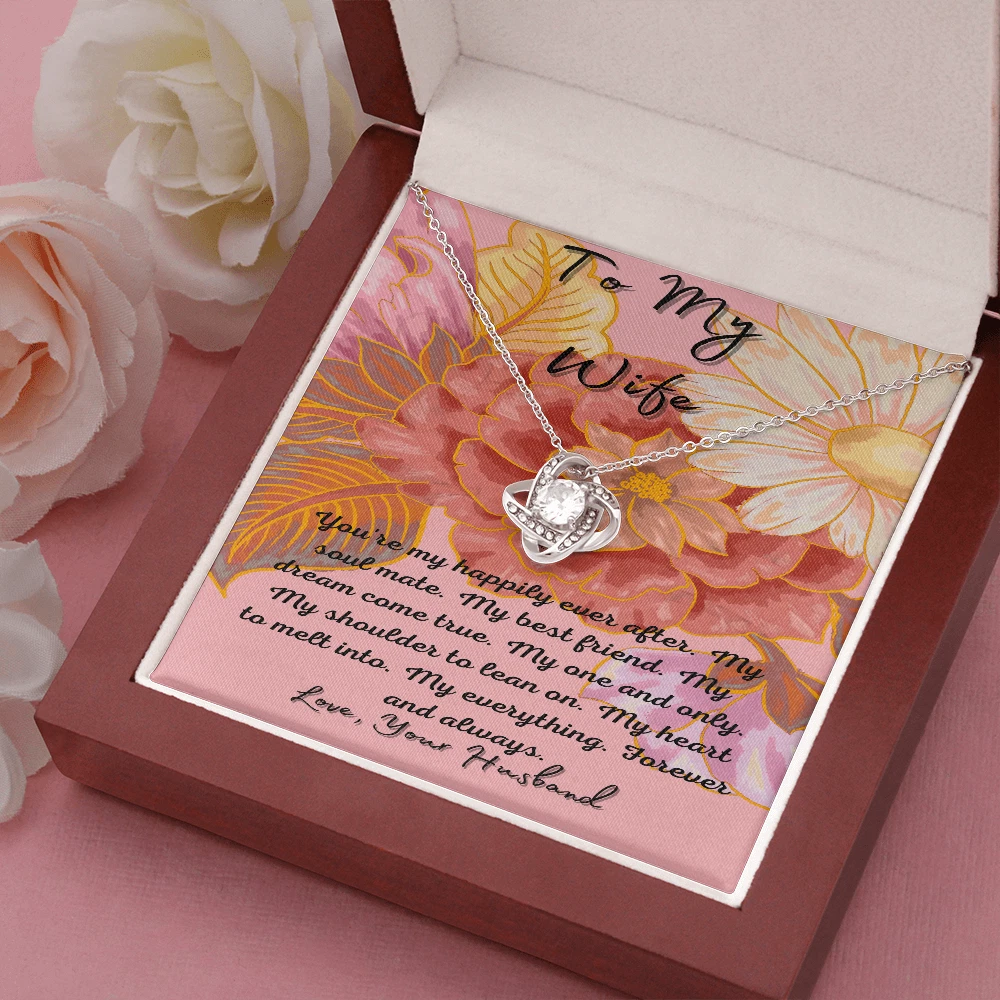 Impress your Wife with this Perfect Custom Gift for Anniversary or Birthday or just to say I love you! Gorgeous Necklace with Beautiful card for your Beautiful Wife. Made in the USA! The Love Knot Necklace represents an unbreakable bond between two souls. This symbol of eternal love is a forever favorite and trending everywhere. Surprise your loved one with this gorgeous gift today! The beautiful Love Knot is crafted with brilliant 14k white gold over stainless steel, and swings from an adjustable cable chain, fastened securely with a lobster clasp. The center cubic zirconia crystal measures 6mm in diameter, and is surrounded with smaller cubic zirconia, showcasing added sparkle and shine to this gorgeous gift. You must see it for yourself! Specifications: • 14k white gold over stainless steel • 6mm round cut cubic zirconia stone • 18"-22" adjustable cable chain necklace • Lobster clasp attachment One of a kind card. You can choose from the standard 2 toned box or a Luxury Mahogany Style Box with a super fancy LED Light display for that perfect Instagram or Facebook pic. message me with any questions and I will reply asap. Thanks for looking!