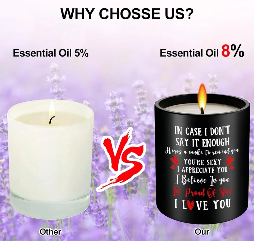 Valentines Day Gift Candles, Wife Romantic Valentine Present For Her I Love You.... Item Description: ROMANTIC COUPLES GIFTS - Liven up your relationship with your loved ones with our stunning couple candle gifts. It will be a surprise to give this romantic birthday gift and show your love for your loved ones! Moreover, these are also Christmas, Valentine, Mother, Anniversary, birthday gifts for couples to symbolize their love. WIFE, GIRLFRIEND, HUSBAND, BOYFRIEND BIRTHDAY GIFTS OR ON ANY OCCASION: The special one in your life will undoubtedly be filled with joy and happiness. A bright, heartwarming smile will illuminate their face as they open it, their eyes sparkling with anticipation and excitement. Used for wife husband birthday gift, birthday gifts for girlfriend boyfriend, birthday gifts for him her, ... UNIQUE ANNIVERSARY GIFTS - Look no further than our vanilla candle, whether you are looking for anniversary, valentines day gifts for husband and wife or an couple gift with a sentimental message. Ideal gift for boyfriend, husband, romantic I love you gifts for her, or even a date night gift for couples. BIRTHDAY GIFT IDEAS - These stunning candles make ideal gifts for couples, men, women, suitable for any occasion you want to spread your love. A simple warm and heartfelt candle girlfriend ideas gifts suitable for anniversary, birthday, valentine's day, Mother's Day, thanksgiving, Christmas, wedding, thank you gifts, holiday. ECO-FRIENDLY And REUSABLE - The candle is handmade with high quality natural soy wax and Lemongrass fragrance oils. Our soy wax burns nice and clean and Eco-friendly that perfect for aromatherapy, meditation, yoga, etc. Wax can easily be cleaned out of the jar with hot soapy water and the jar can be reused or recycled.