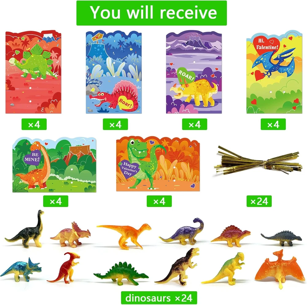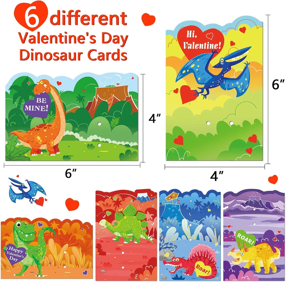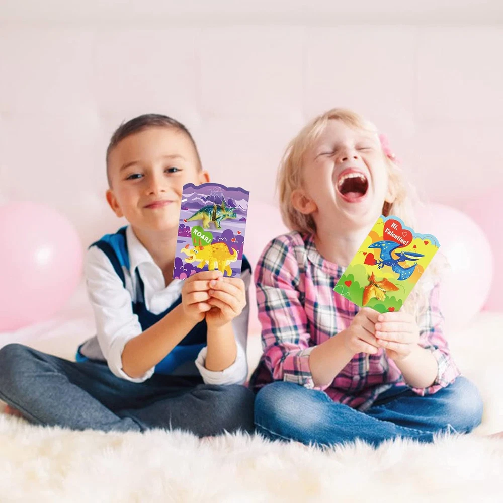 Valentine Gift Card Party Game Includes 24pcs toys with 24pcs cards, 2pcs for each of 12 Different toys. There are 4 dinosaur cards in each style and 6 dinosaur cards in different designs. Materials: made of high quality cardboard, it will not be easily damaged.No doubt it can be reused. Measurement: valentines paper dinosaurs cards measure 4”x 6”. A paper card large enough to hold more text.Let's play it. Easy to use: each card has the words "TO" and "FROM" on the back, as well as the dinosaurs on each card. Follow dashed lines to fold up the paper . Super fun game: perfect Valentine’s Day kids entertainment, excitement building, Valentine’s Day gifts, Valentine’s Day candy and toys, party gift supplies, novel gift toys, candy bag stuffing, Valentine’s Day treats for kids, Valentine’s Day Piñata stuffing, School classroom games, Valentine's Day party card games, classroom games, and family activities. Product Description Valentines Day Gift Cards Dinosaurs Toys for Kids 24pcs Animals Toy Greeting Cards for Valentine Happy Valentine's Day time, leave a good memory for children. Children's favorite dinosaur toy