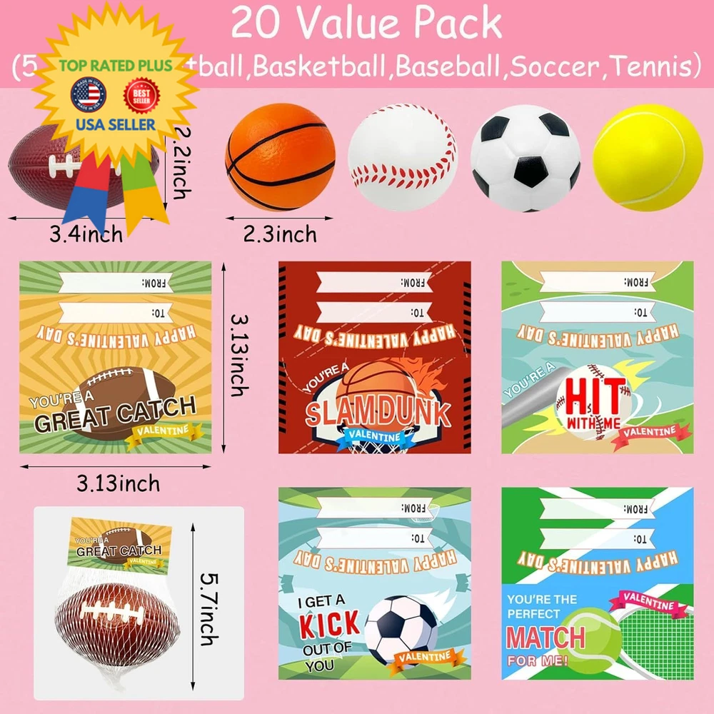 Valentines Day Gift Cards for Kids Classroom 20 Pack Mini Sports Stress Balls with Valentines Day Cards for Kids School Gift Exchange, Game Prizes, Valentines Party Favor Supplies Description Features: Super Value Pack: You will get 20 pack Valentines day gifts set with 20 pcs Valentines day cards and 20 pcs stress balls (4 x soccer ball, 4 x basketball, 4 x football, 4 x baseball and 4 x tennis). Enough quantity to meet all needs of children at various gatherings and suitable for Valentine's Day gifts exchange and school activity prizes Exquistie Cards Design: Each mini sports stress ball is individually wrapped in a net bag attached with lovely Valentines day cards for kids. Our sports-themed cards are printed unique and sweet greetings to match the foam balls that will make the cards more attractive. Kids can write names on "To" and "From" on the back side and give them to their friends on Valentines day. The exchange cards with mini squeeze balls gift set will be a hit among kids Premium Stress Balls: These sport squeeze stress balls are made of high-quality foam material, non-toxic, lightweight, soft, smooth and safe to use. They are nice for both kids and adults to play with, good elasticity that are squeeze, pinch, fidget and stretch. 5 different sports theme designs, interesting and distinctive, greatly attract children's attention and love Ideal Valentine's Day Gift Exchange: Our Valentines day gift cards with sport squeeze balls set is perfect for kid's Valentine's day. Squeeze one of the foam balls, all your stress will be released. A perfect choice for a classroom exchange or Valentine event giveaways. Ideal gift idea for your kids to give to family and friends that will surprise everyone that receives the gift Wide Usages of Valentines Day Gifts: These Valentines day cards for classroom can give everyone more than just a greeting, they give people more FUN! Perfect for kids Valentine's Day, class events, gift exchange, school classroom prize, preschool or elementary school parties, love notes, party favor and so on Product Details: Product Dimensions: 10 x 5 x 3 inches Item Weight: 15.4 ounces Country of Origin: China Item model number: Valentines gift 05 Manufacturer recommended age: 3 years and up Manufacturer: AouEtnay Direct Brand: AouEtnay Unit Count: 20.0 Count Item dimensions L x W x H: 10 x 5 x 3 inches Handling We will ship all orders within 3 business day of payment. Delivery We Do Not Ship Outside of the Continental US. Return Policy All items qualify for returns within 30 days of receipt. Buyer is responsible for return shipping on any item that is not damaged. Feedback We take our reputation seriously, we buy and sell online, so we understand the value of trust. If you are unsatisfied with your order, please contact us and we will work with you to resolve it to your satisfaction.