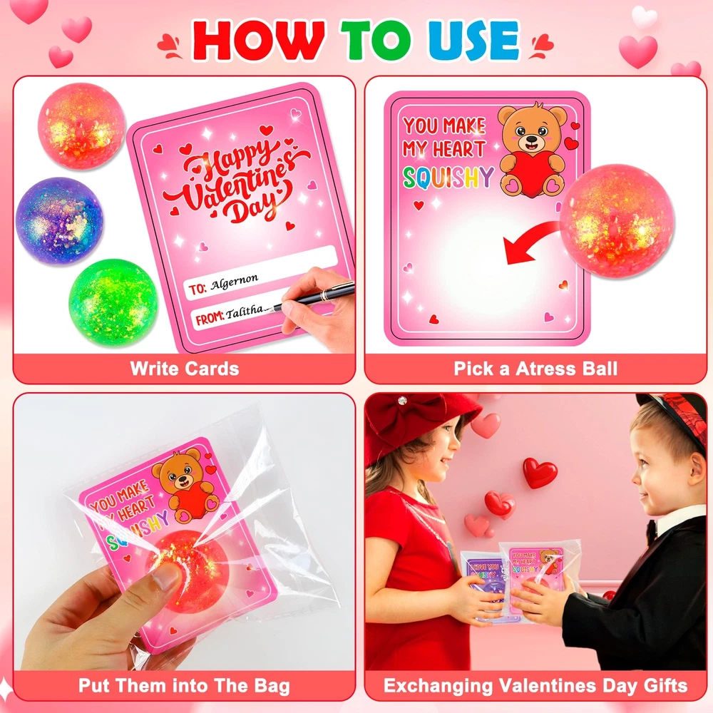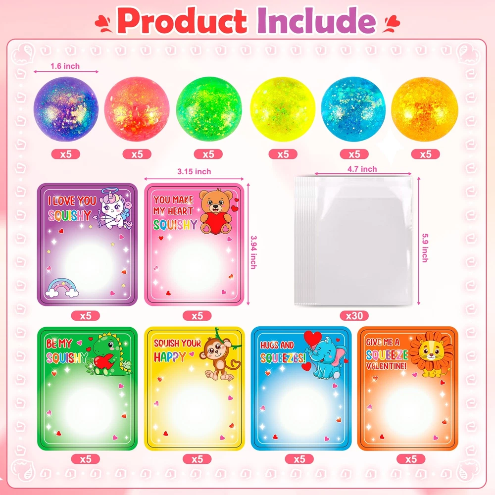 Super Value Packs:Our Valentine's Day Card Gift Set for kids includes 30 valentine's day gift cards and 30 stretchy balls in 6 colors!Valentines greeting card has front and back, front side has valentines wish punchline and back side kids can write name on card to exchange valentines day cards for classroom fridens. Safety Test Approved:Made of thickened TPR material,each Valentine balls about 1.6", perfect size for the little hands, soft to catch, and will last numerous squish. Can be reused for a long time and easy to clean by soap water when it gets dirty,designed for long-lasting fun. Let kids engage in play with peace of mind. Unique Valentine Exchange Cards for Kids:The Valentine's exchange cards come in 6 lovely and attractive designs, makes it a novel valentine's gift for kids classroom gift exchange. The exchange cards with fidget toy set will be a hit among kids. Ideal Valentine notes for girls and boys.Giving out the valentines cards is a fun way to encourage kids' social skill development and teach kids to share, love and make friends. A great chance to express love to families, friends and classmates. Fun Valentines Stress Balls Toys:All kids will love playing with fidget toys. This fidget stretchy toy gift pack is great for children stretching, squeezing and throwing on the walls to bring more fun on Valentine's day! With shiny sequins inside, it's not only looks pretty, but also help kids to release stress and concentrate. Valentines Day Party Favor: Our valentines fidget toys are great for valentines day gifts,perfect mini toys with greeting card for kids’ school classroom prizes, exchange gift for class, love notes,game carnivals prizes and more! These mini stretchy balls add an active and entertaining element to any celebration as a party favor.