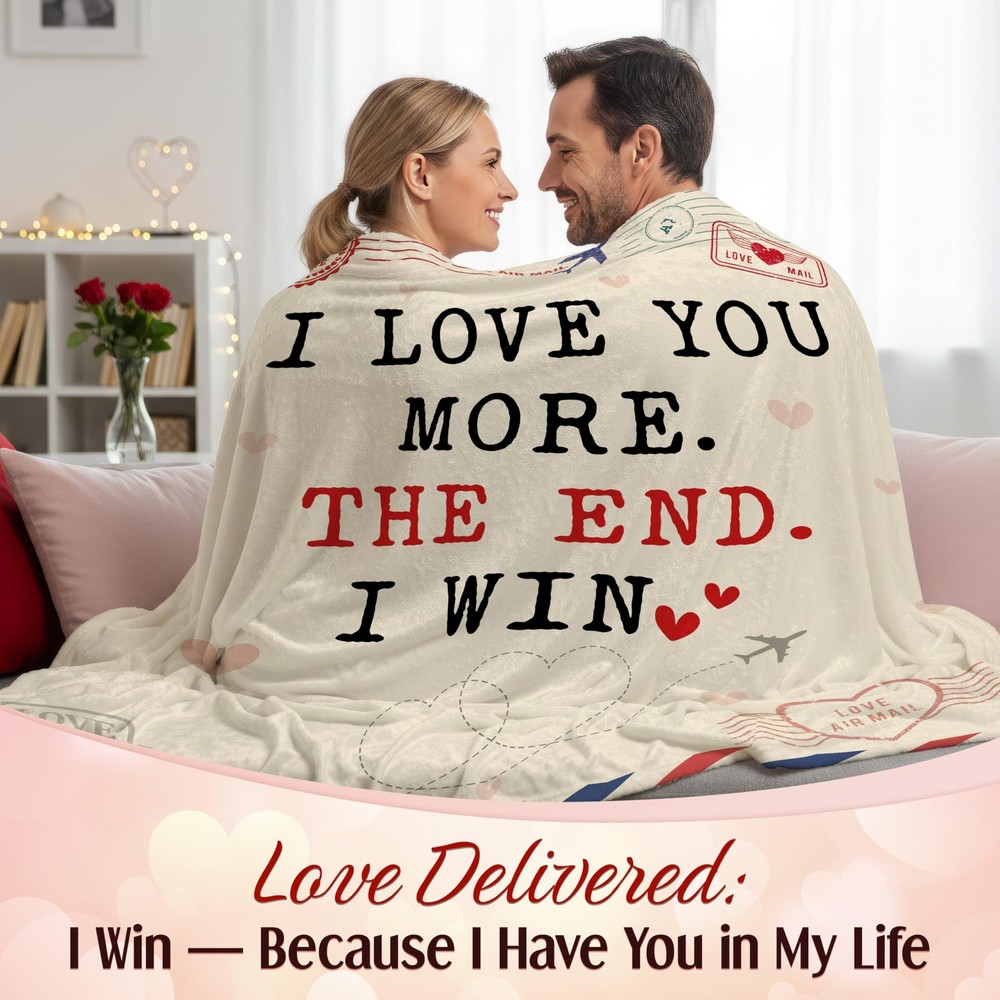 WRAPIX Valentines Day Gifts for Her Him - I Love You More 50x60 inches, I Win Product Details VALENTINES DAY GIFTS FOR MEN WOMEN - Infuse the warmth of love with our couple gifts for girlfriend boyfriend, wife birthday gift ideas, husband birthday gift. Enhance special moments with Valentines Day gifts for her, Valentines Day gifts for him, Valentines Day decorations, and thoughtful presents for mom, grandma or even lovely sisters gifts from sister. ANNIVERSARY GIFTS FOR COUPLE - Symbolize your everlasting bond with our exquisite anniversary gift for couple. These love blankets are the ultimate options for Valentines Day gifts, Valentines decor, romantic gifts for wife husband, unique girlfriend boyfriend gifts, and anniversary wedding gifts for couple. Wrap yourselves in love and celebrate every moment together! GIFTS BEYOND OCCASIONS - Celebrate any special moment with our lovely valentines day decor and couple gift ideas. From Valentines decorations, anniversary, engagement, wedding gifts to birthday gifts for women and men, this love blanket is designed to captivate hearts and delight your significant other. Let this warmth make every moment unforgettable. CERTIFIED QUALITY MATERIAL - Cozy together in this ultra-soft premium polyester with 280 gsm fabric and luxuriously soft fleece lining. Ideal for cuddling on movie nights or chilly evenings by the firepit. Non-toxic, hypoallergenic, and skin-friendly for your beloved one. Perfect for romantic couple gifts. Suitable for beds, sofas, and couches. SIMPLE CARE, EVERLASTING BLISS - Crafted with your convenience in mind, our love blanket is designed to withstand many standard washing machines. Makes a wonderful gift set for any special occasion. Simply machine wash on a gentle cycle using cold water, then tumble dry at a very low temperature. Not easy to shrink, shred, or fade.