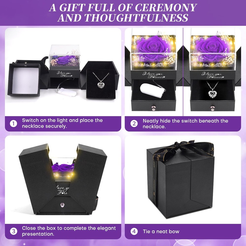 WOKEISE Lighted Preserved Real Rose Flowers with I Love You With Lid, Purple Product Details 【Rose Gifts for Women】This preserved purple rose is crafted from 100% real natural flowers, uniquely preserved to last for 3-5 years with no maintenance required. It never wilts, offering everlasting beauty as a symbol of eternal love. The rose is an ideal gift for your mom, wife, or girlfriend on Valentine's Day, anniversaries, birthdays, mothers day gifts for mom or any special occasion. No need for watering, making it a hassle-free way to express your love. A perfect choice for mothers day gifts, Valentine's Day gifts for her, gifts for girlfriend, and forever flowers 【Enchanting LED Light Display】The preserved rose is enhanced with soft LED lights, creating a warm and romantic ambiance that elevates its charm and sophistication. The LED light adds a magical glow, making it perfect for Valentine's Day gifts for her, gifts for girlfriend, or Mother's Day gifts. Whether used as a nightlight or decorative piece, it brings elegance to any room and makes an unforgettable impression. An excellent choice for forever flowers and gifts for women 【Necklace with "I LOVE YOU" in 100 different languages】Inside the rose box, you'll find a unique double heart-shaped necklace engraved with "I LOVE YOU" in 100 different languages. This symbolizes deep affection and makes it an unforgettable gift. The necklace is the perfect expression of love, ideal for gifts for wife, anniversary gifts for women, and gifts for women who appreciate meaningful, romantic surprises. The beautifully designed box and necklace will touch her heart in every way 【Ready to Gift with Elegant Packaging】No need to worry about wrapping or presentation—this preserved rose and necklace come beautifully packaged in an elegant gift box, perfect for giving directly to your loved one. The luxurious design allows the box to be reused as a jewelry holder, while the rose serves as a stunning indoor ornament. It's a fantastic anniversary gift for her or birthday gifts for women. This complete gift set includes 1 preserved red rose, 1 double heart necklace with "I LOVE YOU" in 100 languages, a gift box, greeting card, and gift bag 【Perfect for Special Occasions】Looking for birthday gifts for women or gifts for mom? This exquisite preserved rose and necklace set makes an unforgettable surprise for any occasion, such as Valentine's Day gifts, Mother's Day, Christmas, anniversaries, or as a thoughtful girlfriend gift. The vibrant red rose is a beautiful reminder of your love, while the heartfelt necklace can be worn daily, always reminding her of your special bond