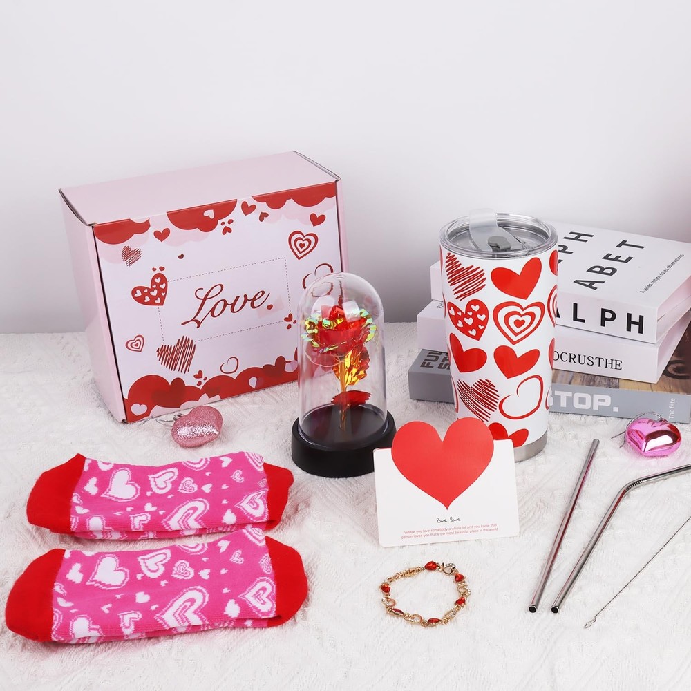 About This Item 💝 Perfect Valentine’s Day Gift Ensemble Searching for a meaningful Valentine’s Day gift? This thoughtfully curated set includes a thermal tumbler, a lifelike rose, a stainless steel straw set, cozy socks, an exquisite bracelet, and a heartfelt thank-you card . Every item is carefully chosen to create a complete and romantic gift that beautifully expresses love and appreciation. 🥤 High-Performance Thermal Tumbler (20 oz) The included 20 oz insulated tumbler is designed for both style and performance. It keeps beverages hot for 6–8 hours and cold for 4–5 hours , making it perfect for everyday use. Crafted with a BPA-free design and a tightly sealed lid , it offers leak-proof convenience and peace of mind wherever the day takes you. 🌹 Everlasting Romance with Simulation Roses The realistic artificial rose is a standout feature of this gift set. Designed in a lifelike rose shape with built-in LED lights , it glows softly at night and lasts forever—symbolizing eternal love . More than a gift, it doubles as a romantic decorative piece that adds warmth and charm to any space. 🧦 Comfortable & Breathable Cozy Socks These soft, breathable socks are designed to fit most foot sizes comfortably. As part of this Valentine’s gift set, they represent warmth, care, and everyday comfort , reminding your loved one of your thoughtfulness with every wear. 💖 A Heartfelt Expression of Love & Emotion Each item in this ensemble carries a meaningful message— warmth through the tumbler, everlasting love through the rose, and delicate blessings through the bracelet . Choosing this complete gift set ensures your Valentine’s Day present becomes a beautiful and sincere expression of love that your special someone will treasure.