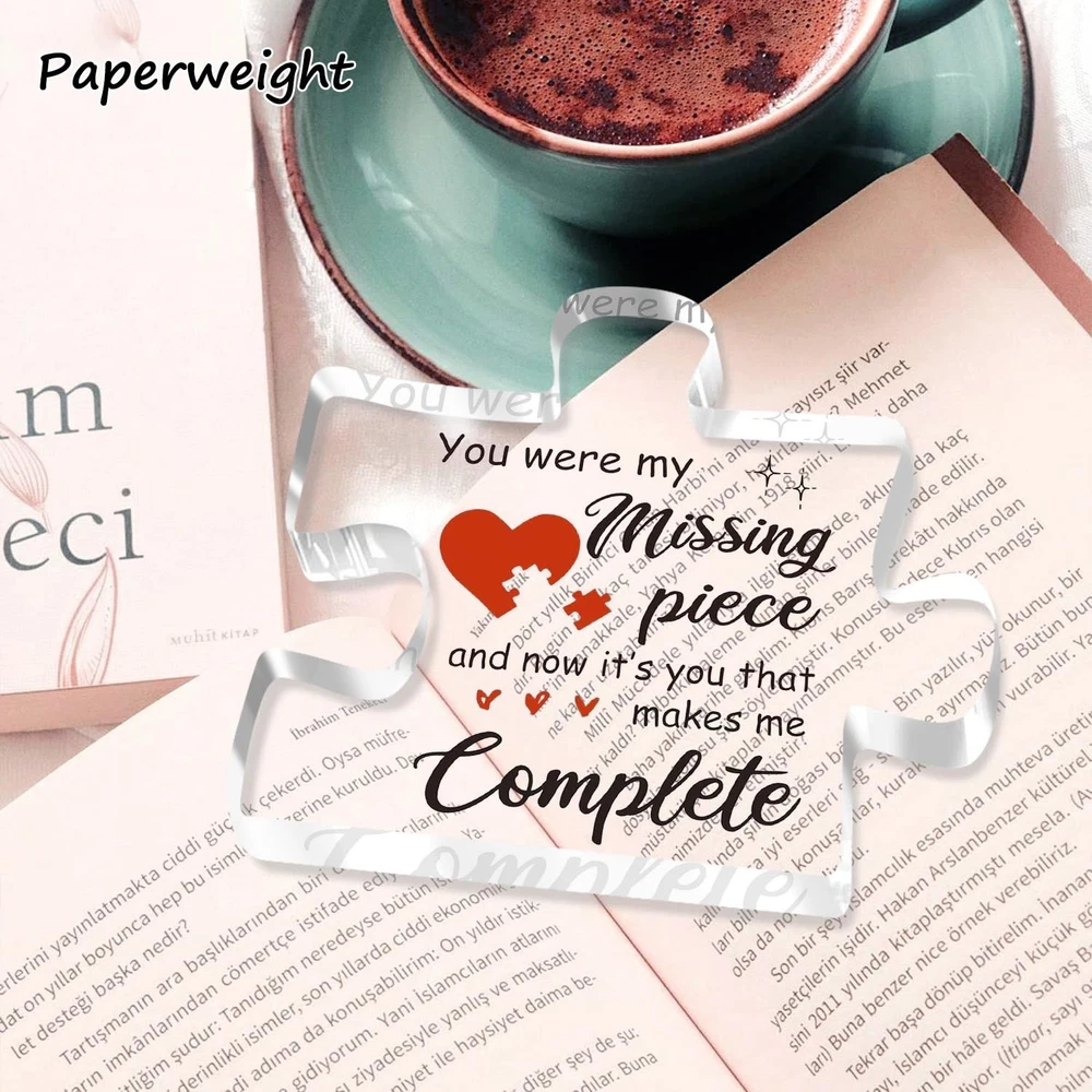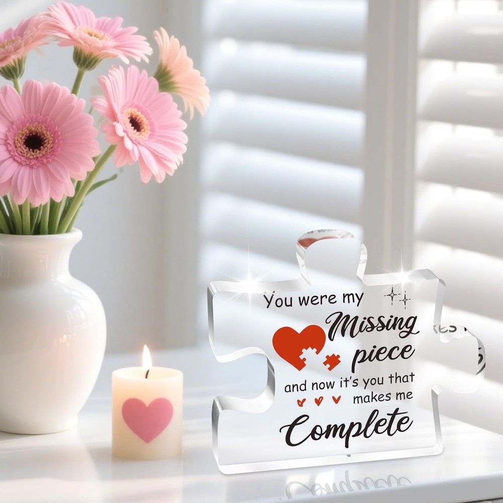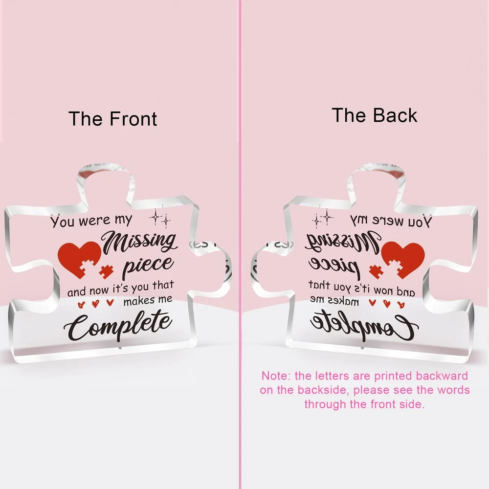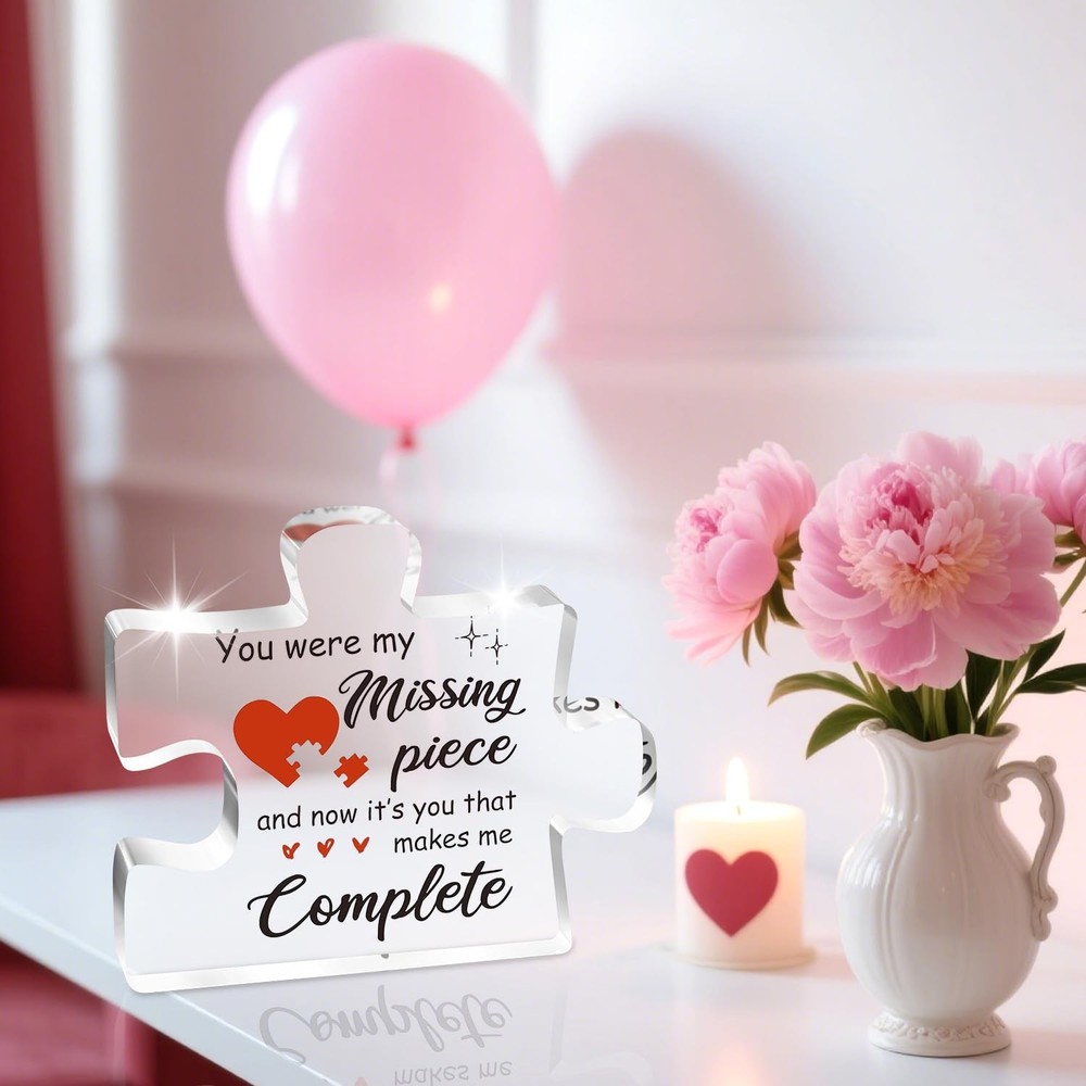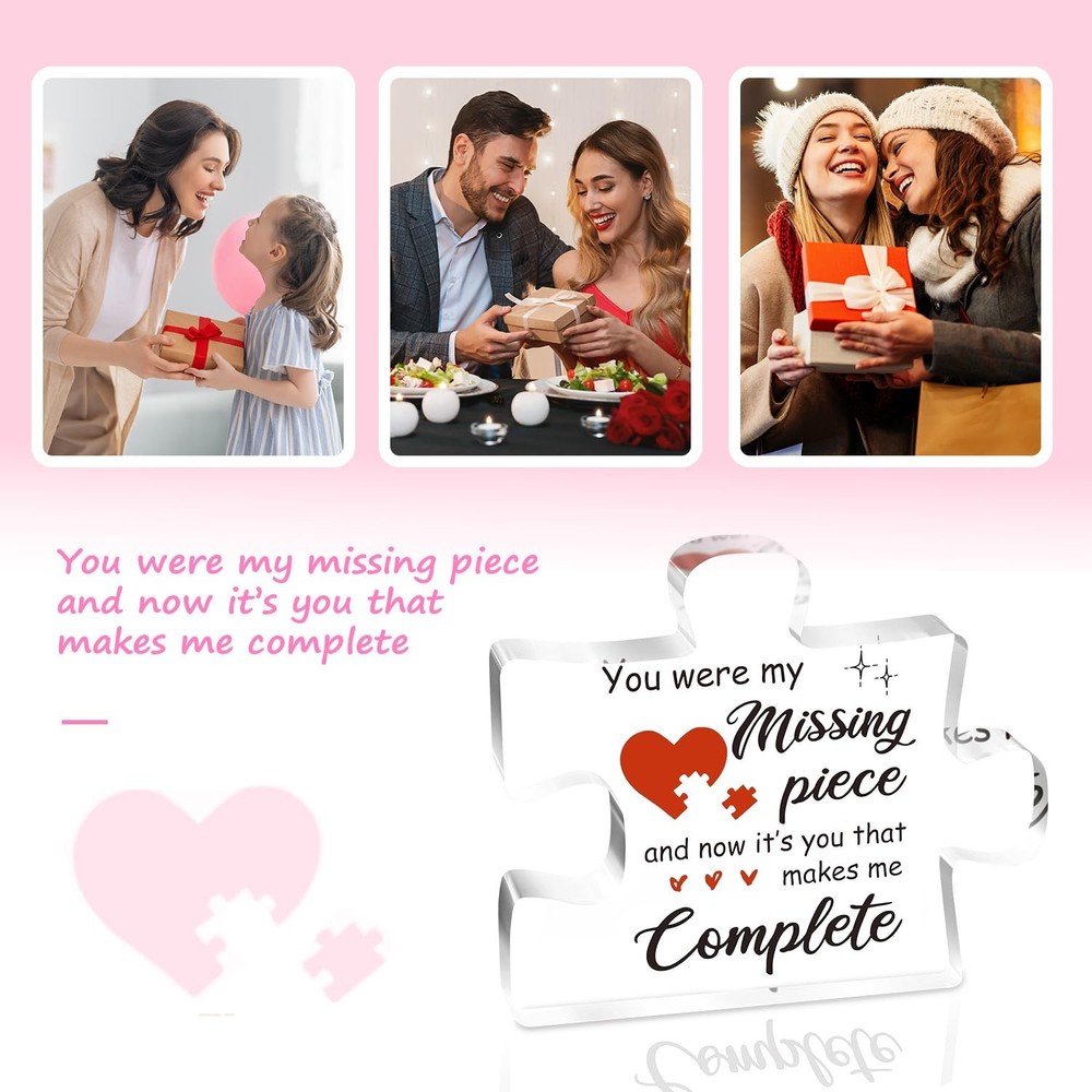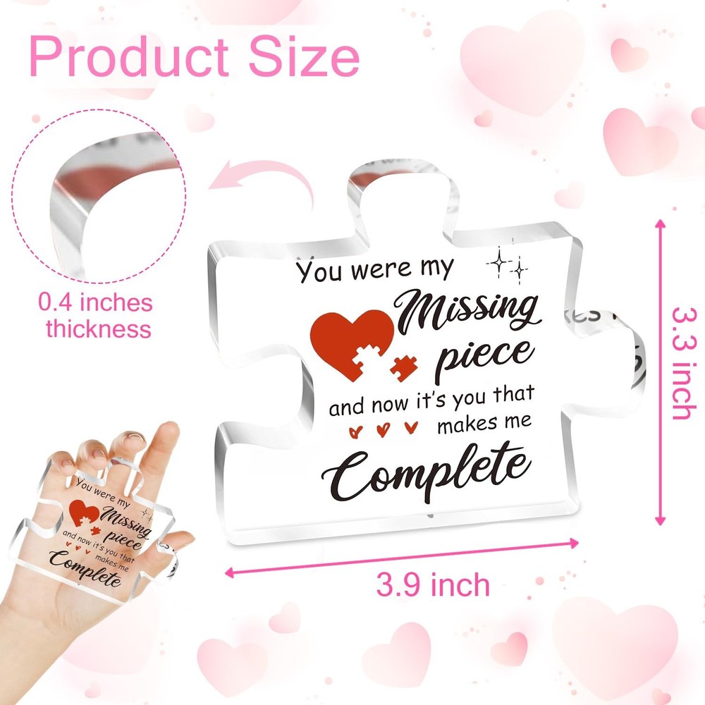 Valentines Day Gifts for Her, Him, 3.9 x 3.3 x 0.4 inches, Pink Description Features: A Message That Touches the Heart – This couple gift carries a deeply romantic message: "You were my missing piece, and now it’s you that makes me complete." It's the perfect way to express how your partner completes your life, making it a meaningful and lasting declaration of love for your boyfriend, girlfriend, husband, or wife. Unique Gift for Her or him – Whether you're celebrating an anniversary, Christmas day, Valentine’s Day, a birthday, or just want to surprise them out of the blue, this puzzle-shaped keepsake is a one-of-a-kind way to say “I love you.” A perfect gifts for boyfriend, gifts for girlfriend, gifts for husband and gifts for wife. High-Quality Craftsmanship That Lasts – Made of durable, crystal-clear acrylic, this love plaque is smooth, sturdy, and built to last. The vibrant print and polished edges make it not just a gift, but a stylish and lasting piece of art your partner will proudly display for years. Perfectly Sized & Stylish Display – With a compact size of approximately 3.9 x 3.3 x 0.4 inches, this plaque is easy to place on a desk, shelf, bedside table, or anywhere it can catch your loved one's eye. The puzzle piece design symbolizes how perfectly you fit together—both visually and emotionally. A good choice of I Love You gifts for Christmas, valentines day gifts for her him. Product Details: Handling We will ship all orders within 3-6 business day of payment. Delivery We Do Not Ship Outside of the Continental US. Return Policy All items qualify for returns within 30 days of receipt. Buyer is responsible for return shipping on any item that is not damaged. Feedback We take our reputation seriously, we buy and sell online, so we understand the value of trust. If you are unsatisfied with your order, please contact us and we will work with you to resolve it to your satisfaction. Thank You For Your Business!