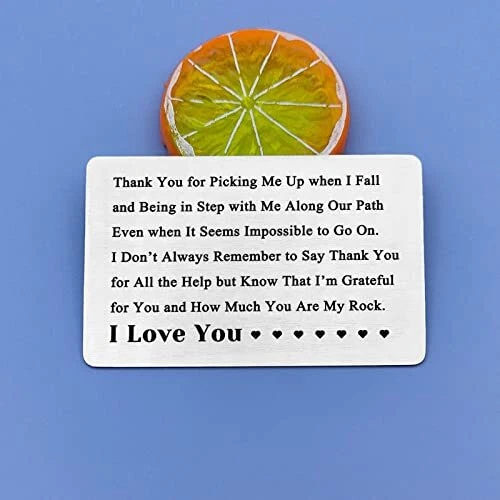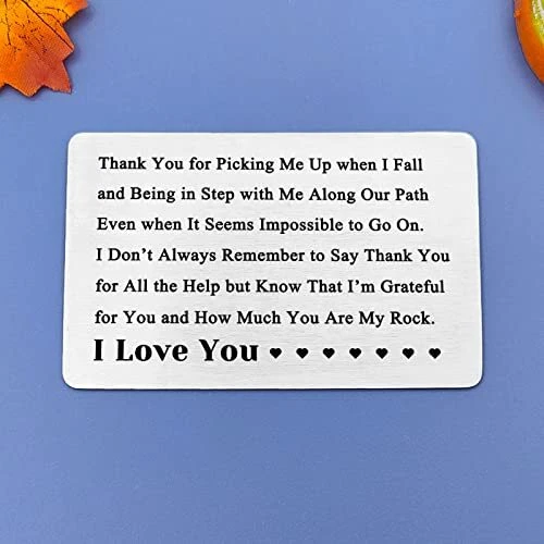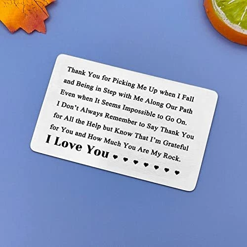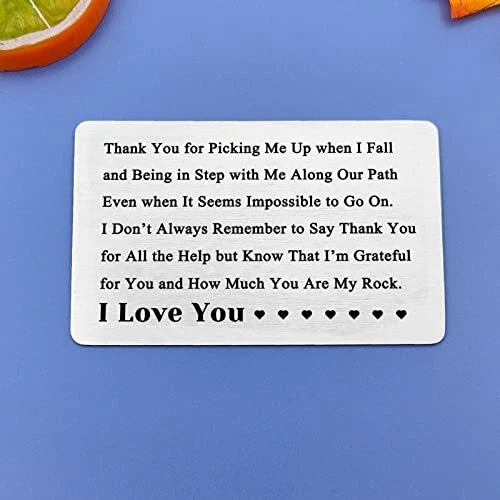 Return Policy Fast Delivery Trusted seller Valentines Day Gift Anniversary Cards Gift for Him Engraved Wallet Card for Men I Love You Gifts for Her Appreciation Gifts for Husband Thank You Gifts Christmas Wedding Gifts for Boyfriend Fiance Product Description Appreciation Gifts for Husband: Thank you for picking me up when I fall and being in step with me along our path even when it seems impossible to go on. I don’t always remember to say thank you for all the help but know that I’m grateful for you and how much you are my rock. I Love You. A romantic gift with a sweet thank you message. Valentines Gifts for Fiance: This love note wallet cards are great way to give a sweet message one can cherish for years to come. is a perfect gift for lovers, for boyfriends, husbands, wives, girlfriends, fiances, and fiances; to reserve special moments for each other. Romantic Gifts for Boyfriend: A unique thank you gift for the other half on a special day, like a birthday Anniversary or Valentine's Day, can show your appreciation for them.Thoughtful thank you gift to express your self-evident appreciation, gratitude and love in daily life. Engraved Wallet Insert Card Gifts: Made of high-quality stainless steel, hypoallergenic, durable, light weight, comfortable, will not rust, will not change color or lose luster. Durable, shiny, bright and lasting commemorative gift. Metal wallet card size: 55*86mm (2.17*3.39 inches). Mini Love Notes: Packed in an elegant velvet bag, you can give gifts at any time. Perfect for his/her gifts, Anniversary Gifts, Deployment Gifts, Dating Gifts, Wedding Gift, Halloween, Thanksgiving Day, Valentine's Day, Christmas, Wedding Gifts and Long Distance Relationship Gift or anytime you want to say 'I love you' to his/her. Shipping Returns Payment Shipping Shipping is FREE to all addresses other than APO/PO boxes in the lower 48 states. All our stock ships from US-based warehouses. Shipped via USPS or UPS (depending on location and package weight) Unless stated otherwise, all orders will ship within 24-72 hours of your payment being processed. Check our feedback to see the great reviews of FAST shipping we offer. Returns Seller does not accept returns Payment We currently accept payment via eBay managed payments only. Once payment is cleared, we will dispatch your shipment within 1-3 business days. Please refer to the "Shipping" tab for more information regarding shipping speed to your destination.