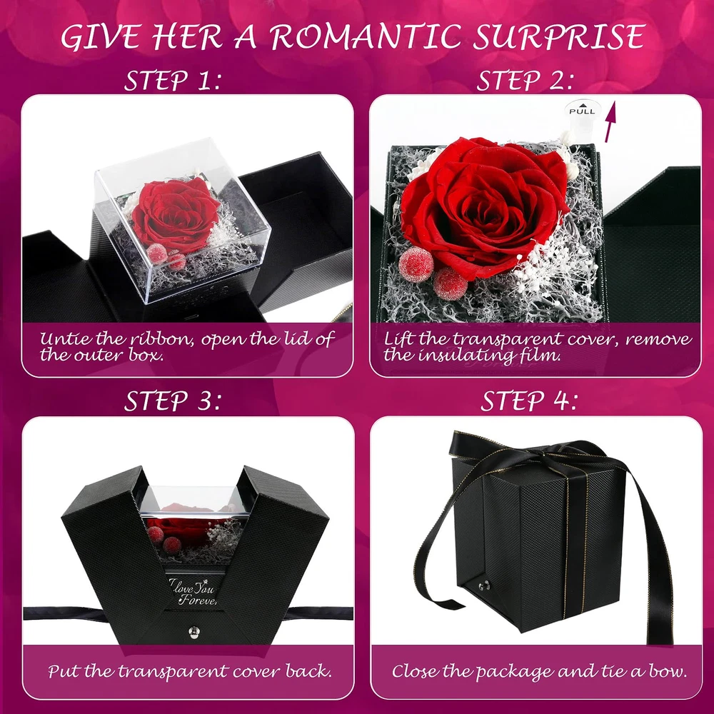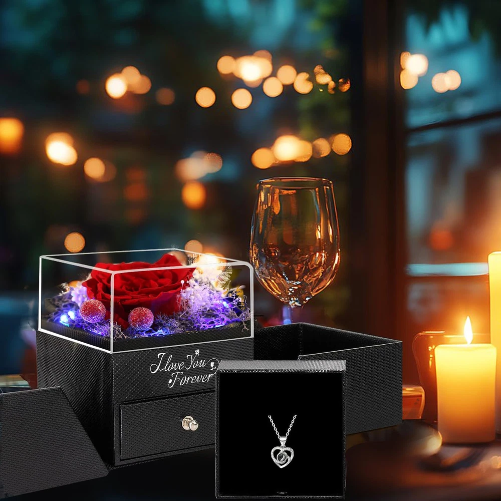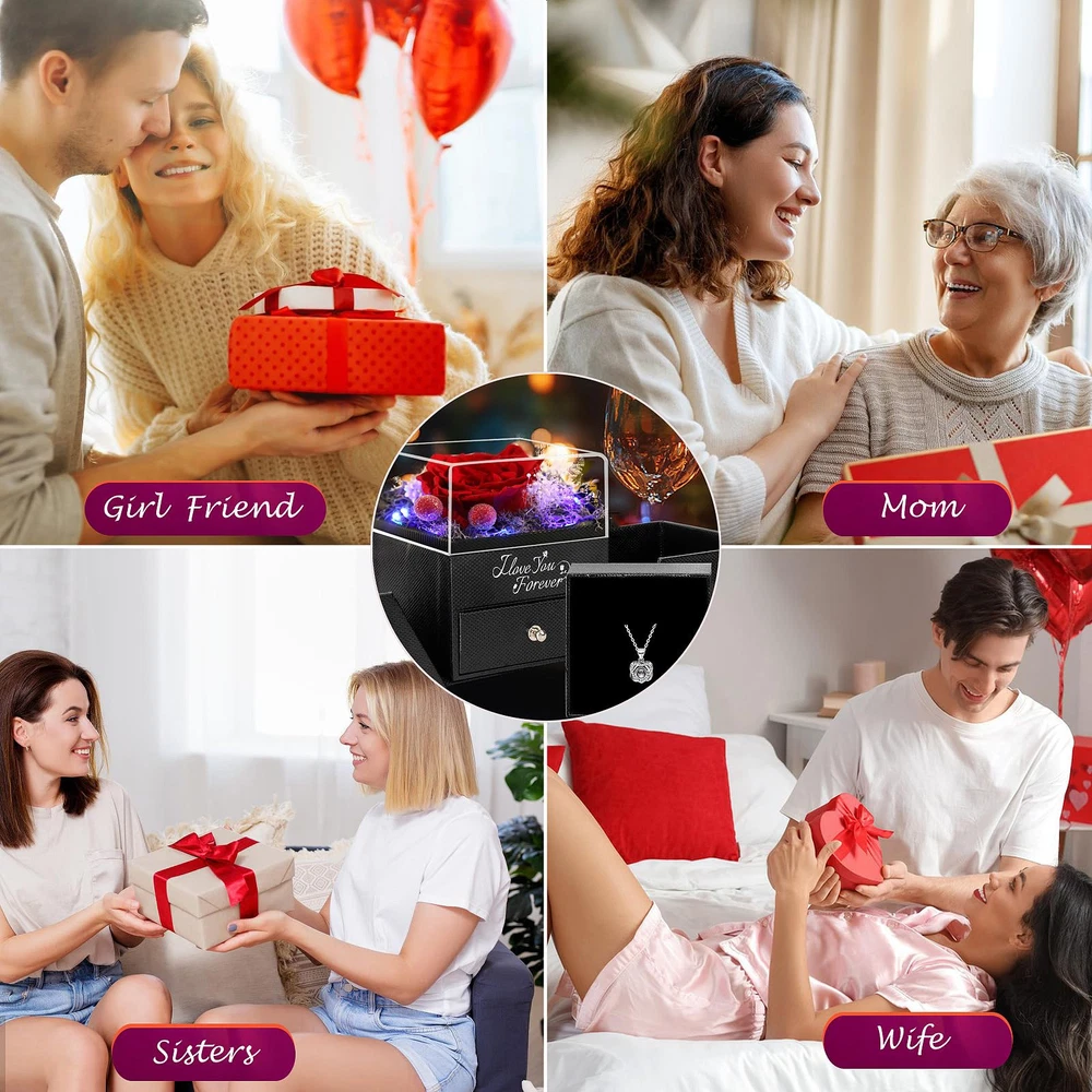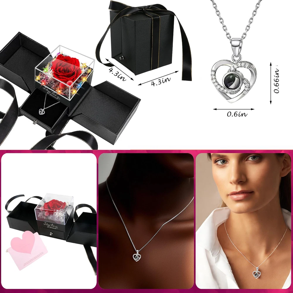 【Valentines Day Gifts for Her】1 Preserved Eternal Rose made of 100% real nature fresh flowers, 1 Gift Box, 5 color breathing light, 1 Gift Bag, 1 Greeting Card, 1 Double Heart Necklace (With I Love You Necklace in 100 Languages) . 【Easy Maintenance】Forever rose after a unique preservation method, it will stay for 3-5 years. No pollen, no need to water, no maintenance required, as a perfect anniversary and birthday gift for her, on behalf of eternal love. 【More than Unique Necklace】Unique double heart-shaped structure and is engraved with " I LOVE YOU necklace 100 Languages " to express love to her. The necklace on hidden inside bottom of the rose box, and you can DIY gifts by replacing necklaces with earrings, rings, bracelets, gift ideas for women for every romantic occasion. 【The Most Romantic Gifts for Women】The most romantic Surprise Gifts for Mom, Wife, Girlfriend, Daughter, on Mothers day, Valentine's Day, Christmas, Thanksgiving, anniversary gift for her, New Year's Day gifts for her or other holiday occasions gift ideas for women, gifts for wife who have everything, the red rose flower will never wither and die. 【Buy at Ease】Our mother's day glass rose with necklace gifts set can be used as birthday gifts for girlfriend, if there is any problem with our product, don’t hesitate to contact us as soon as possible. We will do our best to satisfy you! Mothers day gifts for mom from son husband daughter.