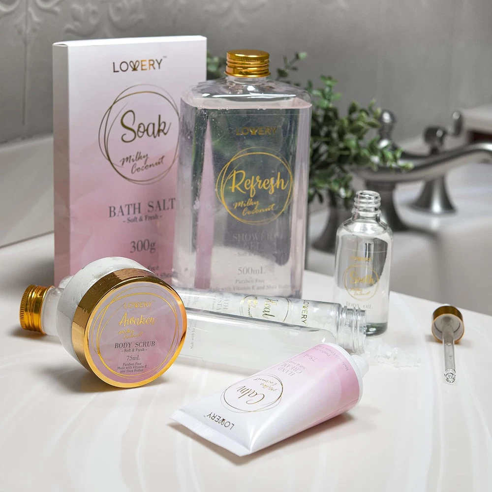 Valentines Day Gifts - Home Spa Gift Basket with Milky Coconut Scent, Vitamin E & Shea Butter with Shower Gel, Bath Salt & Crystals, Body Scrub, Hand Cream, Body Oil, Bath Pillow, Wooden Crate & More