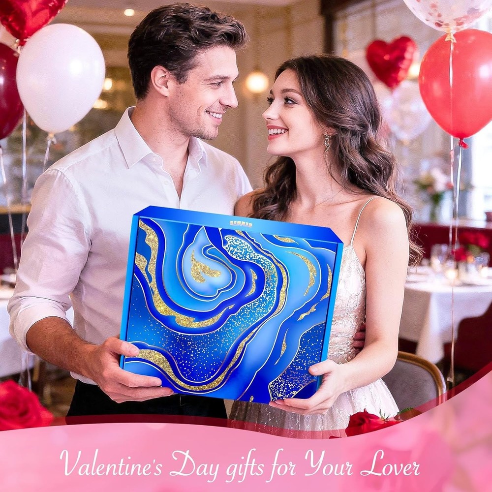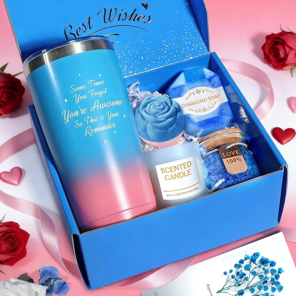 Relaxing Gifts for Her : Make her day with this ultimate relaxation gift basket, the ultimate expression of love and thoughtfulness. Perfect for birthdays,Valentines Day, Mother's Day, Thanksgiving, Teachers' Day, Christmas, and anniversaries, this specially curated collection of relaxation and tranquillity, with jasmine-inspired goodies, will ensure memorable moments for the women who mean the most to you. Premium Quality 6-Piece Spa Gifts Baskets for Women: Enhance her relaxation experience with the delightful 6-piece Sisters Gift Basket. This sophisticated gift set includes a 20oz insulated stainless steel tumbler, scented candles, bath salts, bath bombs, soaps and a heartfelt greeting card with dried flowers. Each item has been carefully selected to create a spa-like experience at home. Special valentines day gifts for him, her, and your lover. Especially Designed Gifts for Women Who Have Everything : Transform your home into a spa-like retreat with this luxurious blue themed care package, featuring a curated selection of indulgent products. Treat yourself or a loved one to a pampering experience that will leave you feeling refreshed, rejuvenated, and revitalized. Perfect for birthday, valentines day, retirement, or any other special day to convey your love and appreciation. The Perfect Birthday Gift Basket: Delicate design and an elegant touch that will win you over at first glance. The gift box features a gold 'Just For You' on the front and 'Best Wishes' inside. The set also includes a dried flower greeting card that you can personalise with a heartfelt message of love and gratitude to the important women in your life. This women's birthday gift is sure to make her feel appreciated and loved! Perfect Valentines Day Gift with Jasmine Scented Candles: Enhance your daily relaxation routine with the soothing fragrance of our Jasmine Scented Candles. Whether you're winding down after a long day or setting the mood for a romantic evening, these candles are the perfect addition to any space. A great gift set for yourself or a loved one, they shine as versatile valentines day gifts for every important person in your life—from heartfelt valentines day gifts for her, women, wife, daughter, mom TO thoughtful valentines day gifts for him, mens valentines day gifts husband couples.