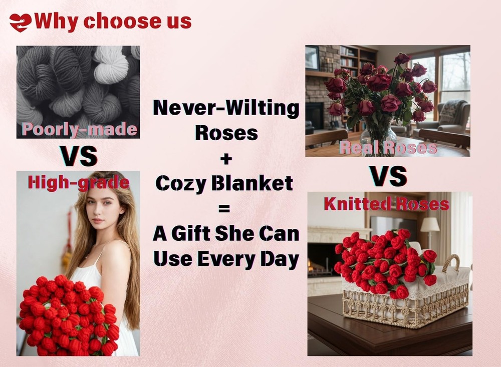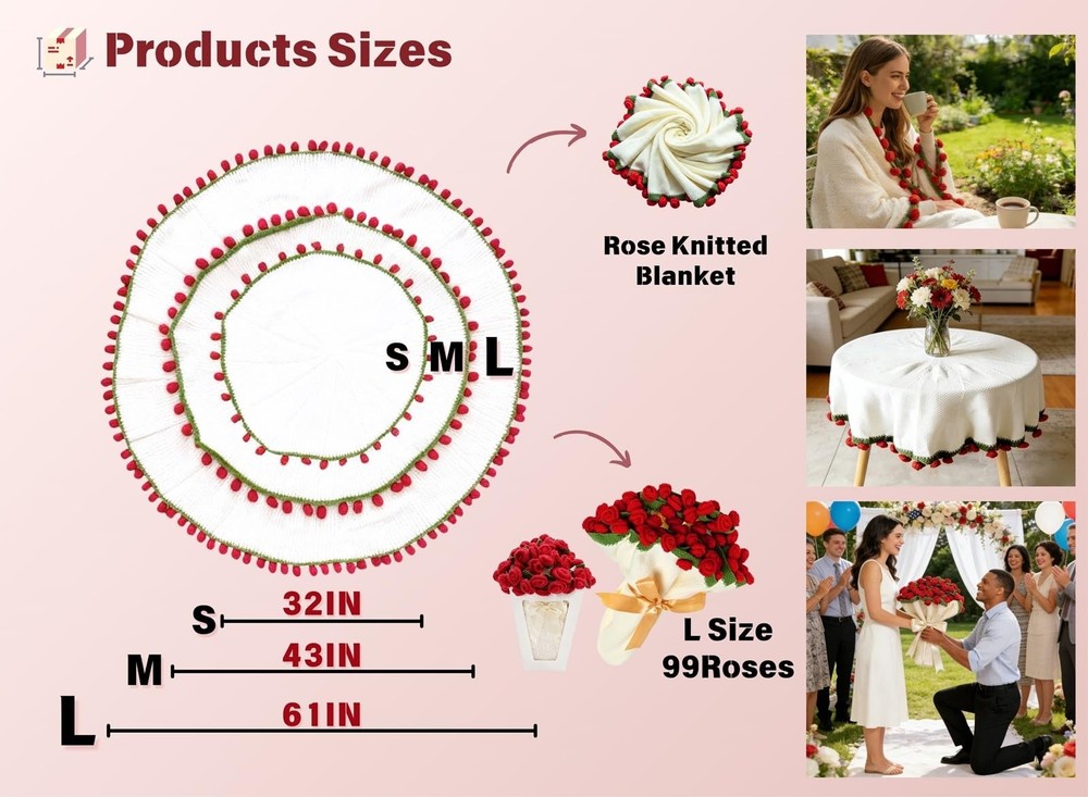 Handmade Roses Flower Bouquet Blanket with Crochet for & Wedding & Valentine’s Day & Home Decor 🌹【Exquisite 2-in-1 Bouquet & Blanket - A Gift That Transforms】 Experience the of a stunning rose bouquet that effortlessly unfolds into a luxurious, cozy throw blanket. This unique handmade creation serves as both an everlasting floral centerpiece and a functional, soft companion for your couch, bed, or reading nook. 🌹【Premium Handmade Craftsmanship & Ultra-Soft Material】 Rose Blanket is meticulously crocheted from ultra-soft acrylic yarn. This blanket is designed for both beauty and durability, featuring reinforced edges and fade-resistant colors. It offers the perfect balance of warmth and breathability, ensuring your gift remains a cherished and vibrant keepsake for years to come. (For care, we recommend hand washing or gentle machine wash on cold to maintain its pristine condition). 🌹【The Ultimate Thoughtful Gift for Every Woman & Occasion】 More lasting than fresh flowers and more unique than a ordinary gift. It’s the perfect solution for: Christmas, Valentine's Day, Birthdays, Mother's Day, Anniversaries, and Weddings. Express your love to your mom, wife, girlfriend, grandma, sister, or best friend. 🌹【Elegant Home Decor for All Seasons】 Whether rolled as a boho-chic floral arrangement on your mantel in spring or unfolded as a cozy couch blanket during winter nights, this piece seamlessly adapts to your home and the seasons. Its elegant rose design complements any interior style. 🌹【Impressively Sized & Practical - Ready to Delight】 Generously sized at 43 inches in diameter, this blanket provides ample coverage for comfort while maintaining the perfect proportions for a breathtaking bouquet display. We offer multiple sizes to suit different needs. Requiring no upkeep yet symbolizing eternal friendship, it is sure to earn admiration.