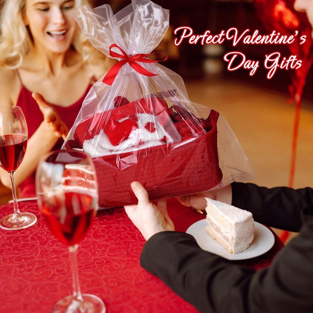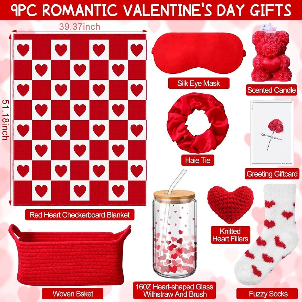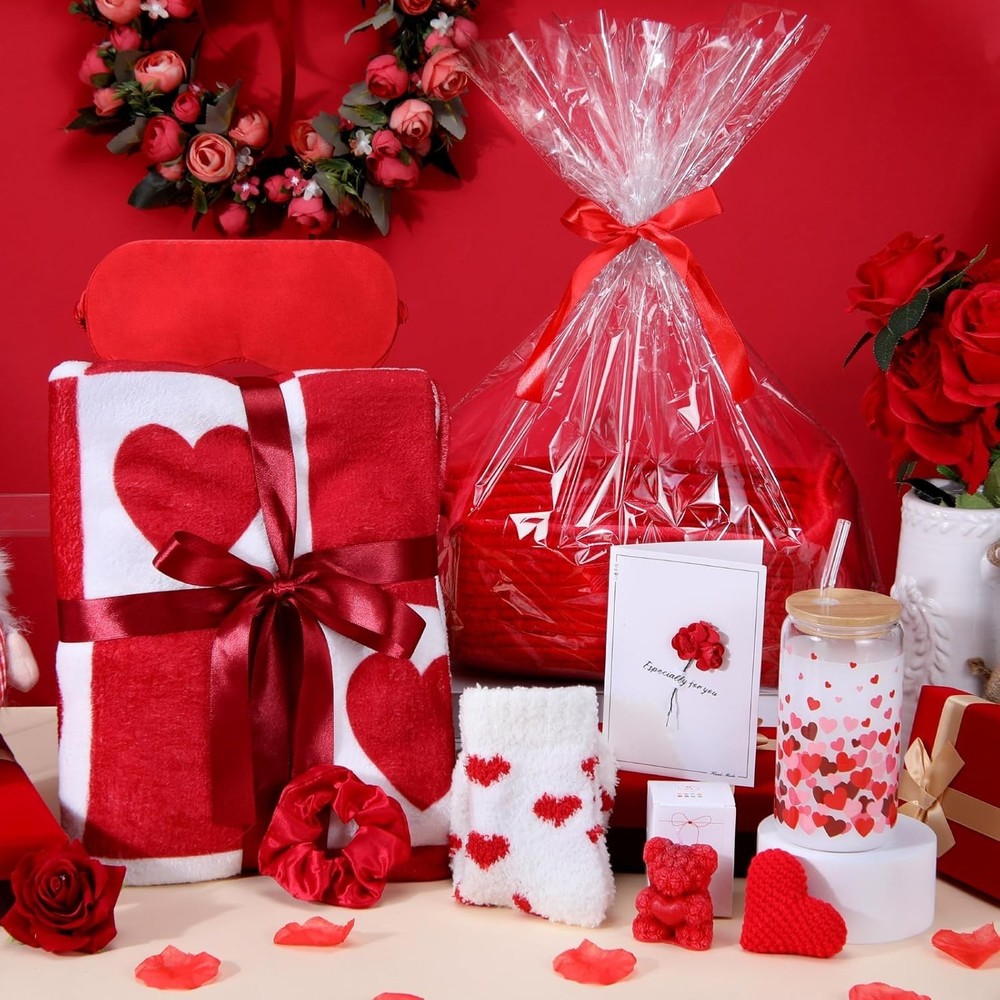 About this item Valentines Gift Set: Each set includes a 50 x 40 inch flannel blanket, bear candle, heart glass cup with lid, straw, and brush, fluffy socks, scrunchie, eye mask, knitted heart, and a greeting card — all arranged in a reusable basket Gift: The soft flannel blanket delivers enveloping warmth, while plush fuzzy socks cradle her feet in cozy comfort. Blocking light for deeper rest during recovery or precious self-care moments Relaxing Spa Gift Set for Her: Our scented bear candles contain a blend of soy waxes and natural oils to ensure the scent lasts throughout the burn. So moms/friends/wives can enjoy a luxurious floral bubble bath. Forget the worries of life and relax as a beautiful and elegant lady Heart-Themed Accessories Set: Features a greeting card, a light knitted heart (2.36in/6cm), and a heart glass cup with bamboo lid, reusable glass straw, and cleaning brush for a heartfelt touch. All items are packed in a woven basket wrapped in a clear gift bag, easy to organize and reuse for bathroom, bedroom, or vanity decor after gifting Suitable for girlfriend, wife, mom, sister, or best friend, this set creates a warm and thoughtful gifting moment for Valentine's Day, anniversaries, birthdays, or self-care nights. The blend of soft textures, floral fragrance, and cozy accessories brings joy and tenderness to every day