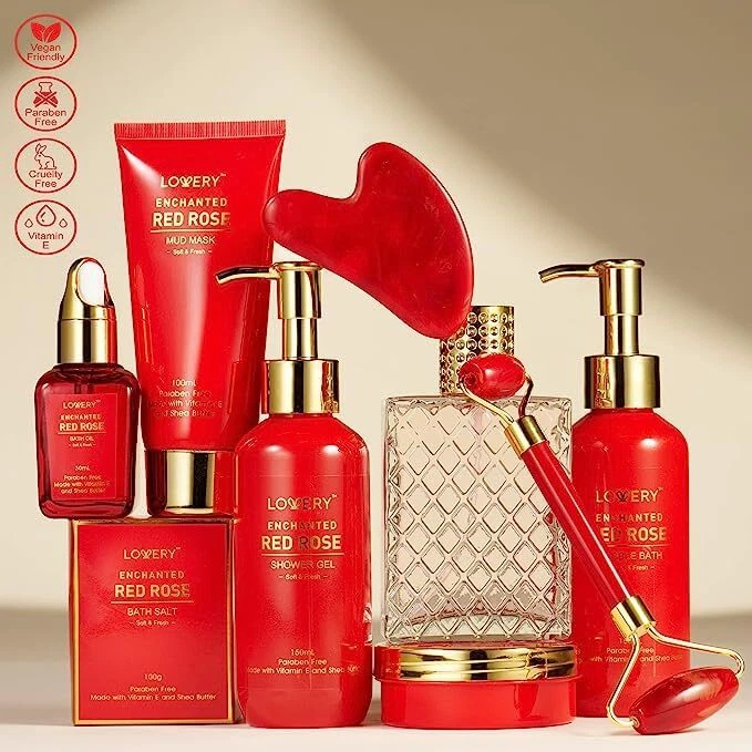 Valentines Day Gifts for Her - Exotic Rose Valentine Gift Basket for Women, Spa 11 PIECE BEAUTY & PERSONAL CARE - Each Gift Basket contains premium Bath and Shower Essentials: Shower Gel, Bubble Bath, Full Size Eau de Parfum, Bath Salts, Body Scrub, Massage Body Oil, Mud Mask, 100% Quartz Gua Sha Stone, Quartz Jade Roller, wrapped in a Handmade Red Tub. It also has a gift note card for you to personalize it. AROMATHERAPY GIFT SET - Crafted with moisturizing Shea Butter and nourishing Vitamin E, the Red Rose Spa Kit helps you unwind and relax amid a calming aroma as your hair, skin, and body rejoice in the anti-aging effects. This beautiful fragrant flower is the universal symbol of love and exerts a positive effect on mind, body and skin. The delicate wafting aroma of rose petals is an irresistable scent. CARE PACKAGE FOR WOMEN: Beautifully packaged and ready to gift with a personalized note tag. Our bath gift basket for Women, Men, Friends, Mom, Wife and Family takes the guesswork out of gifting for Holidays, Christmas, Mother’s Day, Thanksgiving, Valentine’s Day, Birthdays, Anniversaries or any other occasion with a luxurious Bath and Body Spa Kit. EXQUISITE DELUXE ITEMS - A spa kit for women gift set spa basket filled with luxurious spa products she’ll love to relax and rejuvenate with! The assorted bottles are decorated in red with designer gold lettering and elegant gold pumps to complete the luxury look. CRUELTY FREE INGREDIENTS - Our spa baskets for women gift sets are filled with only the finest, all-natural products and ingredients, free from animal testing. As a paraben-free skincare solution, our products contain exactly 0% of this harmful ingredient. Shipping We offer FREE shipping on all orders! We ship within Three business days of payment, usually sooner. We use a selection of shipping services such as UPS, FedEx, USPS etc. We only ship to the lower 48 states, no APO/FPO addresses or PO Boxes allowed. Local pickups and combined shipping options are not provided at this time. Return You can return a product for up to 30 days from the date you purchased it. Any product you return must be in the same condition you received it and in the original packaging. Please keep the receipt. Payment We accept payment by any of the following methods: PayPal Please pay as soon as possible after winning an auction, as that will allow us to post your item to you sooner! Feedback Customer satisfaction is very important to us. If you have any problem with your order, please contact us and we will do our best to make you satisfied. Contact Us If you have any queries, please contact us via ebay. We usually respond within 24 hours on weekdays. Please visit our eBay store to check out other items for sale! Thank you for shopping at our store.