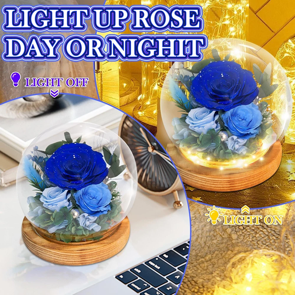 Timeless Beauty with Real Flowers: Include 3 preserved real blue roses, delicately surrounded by rabbit tail grass, hydrangea, eucalyptus leaves, and other natural plants. Set on a refined peach wood base that emits a subtle, pleasant fragrance, the design is elevated by built-in LED lights and a scattering of pearls for a touch of opulence. With petals accented by shimmering silver dust, Powered by 3 AAA batteries (included), this gift exudes a luxurious and precious charm. Symbol of Everlasting Love: The Blue roses and delicate accessories in this arrangement serve as a reminder of enduring love. Through advanced preservation, these flowers maintain their vibrant colors and natural beauty for 3-5 years, No matter how time passes, the arrangement stays fresh and beautiful, capturing the essence of eternal romance and creating lasting memories with every glance.making them a lasting symbol of love and affection. Enchanting LED Glow: Nestled in a glass dome, the Blue floral arrangement is illuminated by soft LED lights, casting a gentle, warm glow that enhances the natural beauty of the flowers. The lights add a magical touch, perfect for creating a cozy, romantic atmosphere in any room. Low Maintenance & Eco-Friendly: No need for watering or care, this arrangement requires no upkeep. The preserved flowers, along with the eco-friendly natural materials, allow you to enjoy the beauty of fresh flowers without the hassle of maintenance, while being sustainable and long-lasting. Ready-to-Gift Elegance: Beautifully packaged, this floral arrangement comes in an box, making it the perfect gift for loved ones. Whether for a Valentines Day, Mothers Day, birthday, anniversary, or holiday, this thoughtful and unique gift will be cherished for years to come.