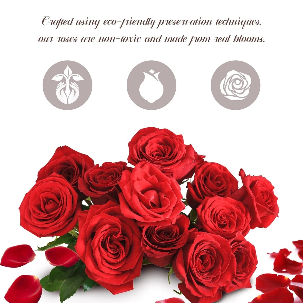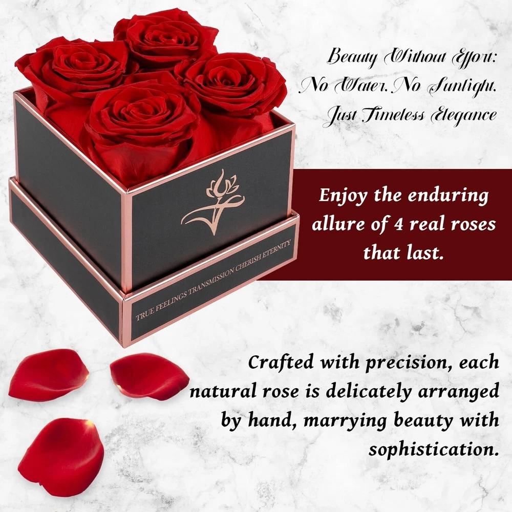 Valentines Day Gifts for Her, Preserved Flowers Red Roses in A Box - Rose Flower Gifts for Her, Mom and Sister Valentines Day Gifts for Wife(Red) Product Details Color: Red Brand: MTOUOCK MPN: Does not apply UPC: Does not apply EAN: Does not apply Brand: MTOUOCK Plant or Animal Product Type: Rose Color: Red Number of Items: 4 Occasion: Mother's Day Package Dimensions: 5.79 x 4.45 x 4.41 inches Item Weight: 11.2 ounces Manufacturer: MTOUOCK Specific instructions for use: Other Batteries required: No Eternal Flower Love Box: Express your enduring love with our preserved rose bouquet, a timeless symbol of passion and beauty that lasts forever Preserved Roses: Crafted from premium fresh roses using a unique preservation technique, our collection boasts 4 roses that maintain their splendor for 1 to 3 years. Each arrangement is meticulously handcrafted Mother's Day Gifts:Give the perfect gift for Mother's Day with our beautifully packaged rose flower gift set. Delight her with a gift box included, saving you time on wrapping. Ideal for birthdays, Christmas, anniversaries, or simply showing appreciation Sophisticated Presentation: Adorned in a gifts box, our preserved flowers make a stunning addition to any festival decor. Maintain their exquisite quality by storing them at room temperature away from direct sunlight or water Perfect Gift Choice: Elevate any occasion with our preserved rose arrangements! Bestow a memorable Valentine's Day gift upon her, mom, or anyone special for birthdays and beyond