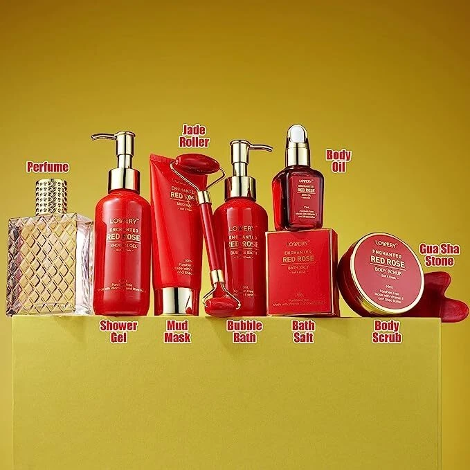 11 PIECE BEAUTY & PERSONAL CARE - Each Gift Basket contains premium Bath and Shower Essentials: Shower Gel, Bubble Bath, Full Size Eau de Parfum, Bath Salts, Body Scrub, Massage Body Oil, Mud Mask, 100% Quartz Gua Sha Stone, Quartz Jade Roller, wrapped in a Handmade Red Tub. It also has a gift note card for you to personalize it. AROMATHERAPY GIFT SET - Crafted with moisturizing Shea Butter and nourishing Vitamin E, the Red Rose Spa Kit helps you unwind and relax amid a calming aroma as your hair, skin, and body rejoice in the anti-aging effects. This beautiful fragrant flower is the universal symbol of love and exerts a positive effect on mind, body and skin. The delicate wafting aroma of rose petals is an irresistable scent. CARE PACKAGE FOR WOMEN: Beautifully packaged and ready to gift with a personalized note tag. Our bath gift basket for Women, Men, Friends, Mom, Wife and Family takes the guesswork out of gifting for Holidays, Christmas, Mother’s Day, Thanksgiving, Valentine’s Day, Birthdays, Anniversaries or any other occasion with a luxurious Bath and Body Spa Kit. EXQUISITE DELUXE ITEMS - A spa kit for women gift set spa basket filled with luxurious spa products she’ll love to relax and rejuvenate with! The assorted bottles are decorated in red with designer gold lettering and elegant gold pumps to complete the luxury look. CRUELTY FREE INGREDIENTS - Our spa baskets for women gift sets are filled with only the finest, all-natural products and ingredients, free from animal testing. As a paraben-free skincare solution, our products contain exactly 0% of this harmful ingredient.