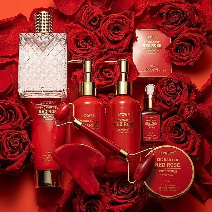 Valentines Day Gifts for Her, Red Rose Valentine Spa Gift Basket Relaxation Gifts for Women, Bath and Body Gift Set Pampering for Mom Birthday With Perfume, Jade Roller, Quartz Gua Sha Stone & More