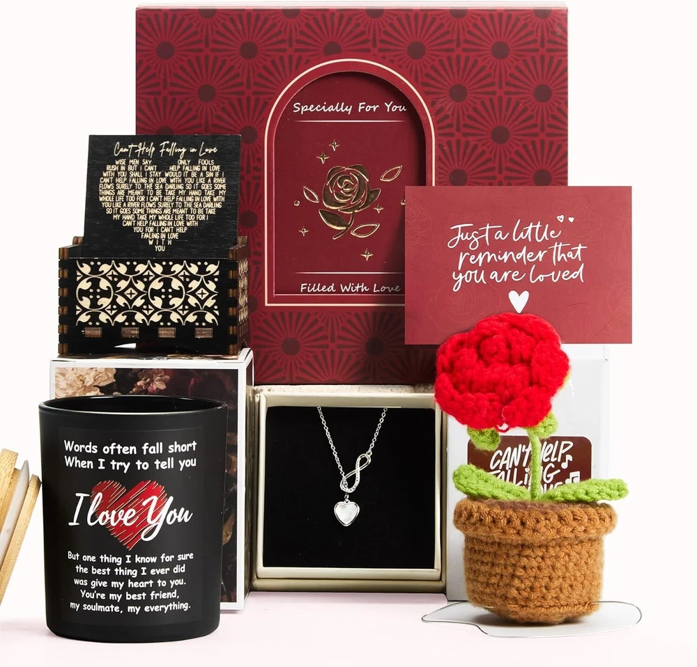 Valentines Day Gifts for Her Romantic Gift for Girlfriend Wife Boyfriend Husband Color Red Product Dimensions 6"W x 3"H Item Weight 16 ounces Number of Items 6 Scent Lavender Vanilla Are Batteries Included No Indoor/Outdoor Usage Indoor Specific Uses For Product Romantic Occasions, Home Decor, Valentine's Day Gift Shape Round About this item 🌹Romantic Valentine's Day Gifts for Her:Surprise your loved one with this thoughtfully curated Valentine's Day gift basket. Featuring a handmade knitted rose, a scented candle adorned with warm, heartfelt words, a timeless wooden music box, an infinity-heart necklace symbolizing eternal love, and a beautifully designed greeting card. This elegant gift set creates the perfect romantic atmosphere to make her feel truly cherished and loved. Ideal for your girlfriend, wife, sister, female friend, or any woman you care about. 🌹Unique Valentine's Basket for Her: This Valentine's basket for her combines timeless charm with meaningful details. The soothing aroma of the scented candle, the delicate craftsmanship of the knitted rose, and the heartfelt melody of the music box come together to create an unforgettable Valentine’s experience. Whether it's for your girlfriend, wife, or special someone, this unique gift is a heartfelt expression of your love. 🌹Valentine's Gift Set with Meaning: Looking for a Valentines gifts for her that stands out? This set features an infinity-heart necklace that symbolizes endless love and connection, a handcrafted rose that lasts forever, and a beautifully written card to express your deepest feelings. Thoughtful, practical, and deeply romantic, this gift basket is perfect for showing her how much she means to you. 🌹Perfect Romantic Gifts for Her: Give her a gift she’ll treasure forever. This romantic gift set is designed to celebrate love in the most meaningful way. From the music box that plays a timeless tune to the luxurious infinity-heart necklace, every item in this basket has been carefully chosen to create lasting memories. It’s not just a gift—it’s a romantic gesture she’ll never forget. 🌹Ready-to-Give Valentine's Day Gift Set:No need to worry about gift wrapping! This beautifully packaged Valentine's Day gift set is ready to impress. With premium materials, a romantic design, and heartfelt details, this gift box is perfect for Valentine's Day, anniversary, or any special occasion. This gift set will touch her heart and convey your warmest wishes. Don't forget to leave a message: select "THIS ORDER CONTAINS A GIFT" at checkout and add a personalized gift message.